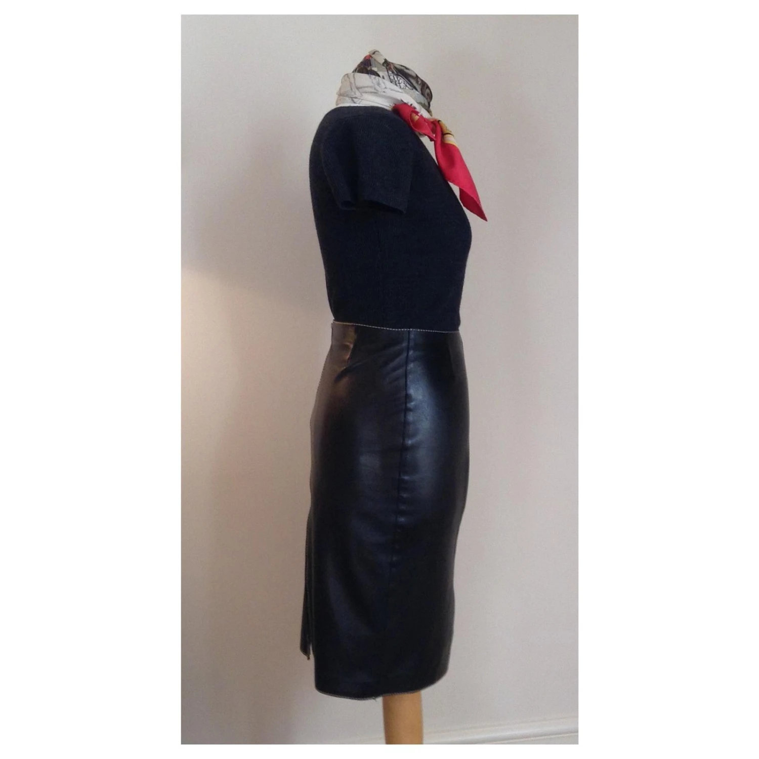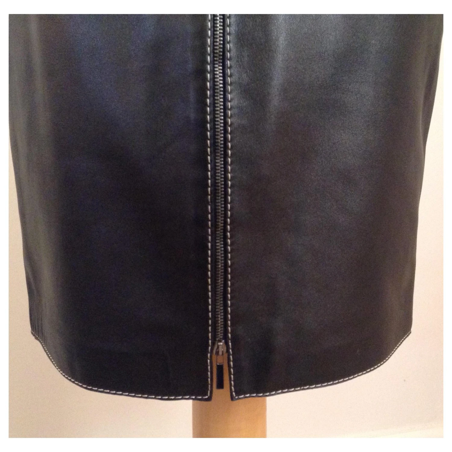 très beau, Jupe crayon Paule Ka en cuir d’agneau noir doux avec zip intĂ©gral Ă l’arrière. Très chic et très sexy, les coutures contrastĂ©es blanches gardent l’air frais.