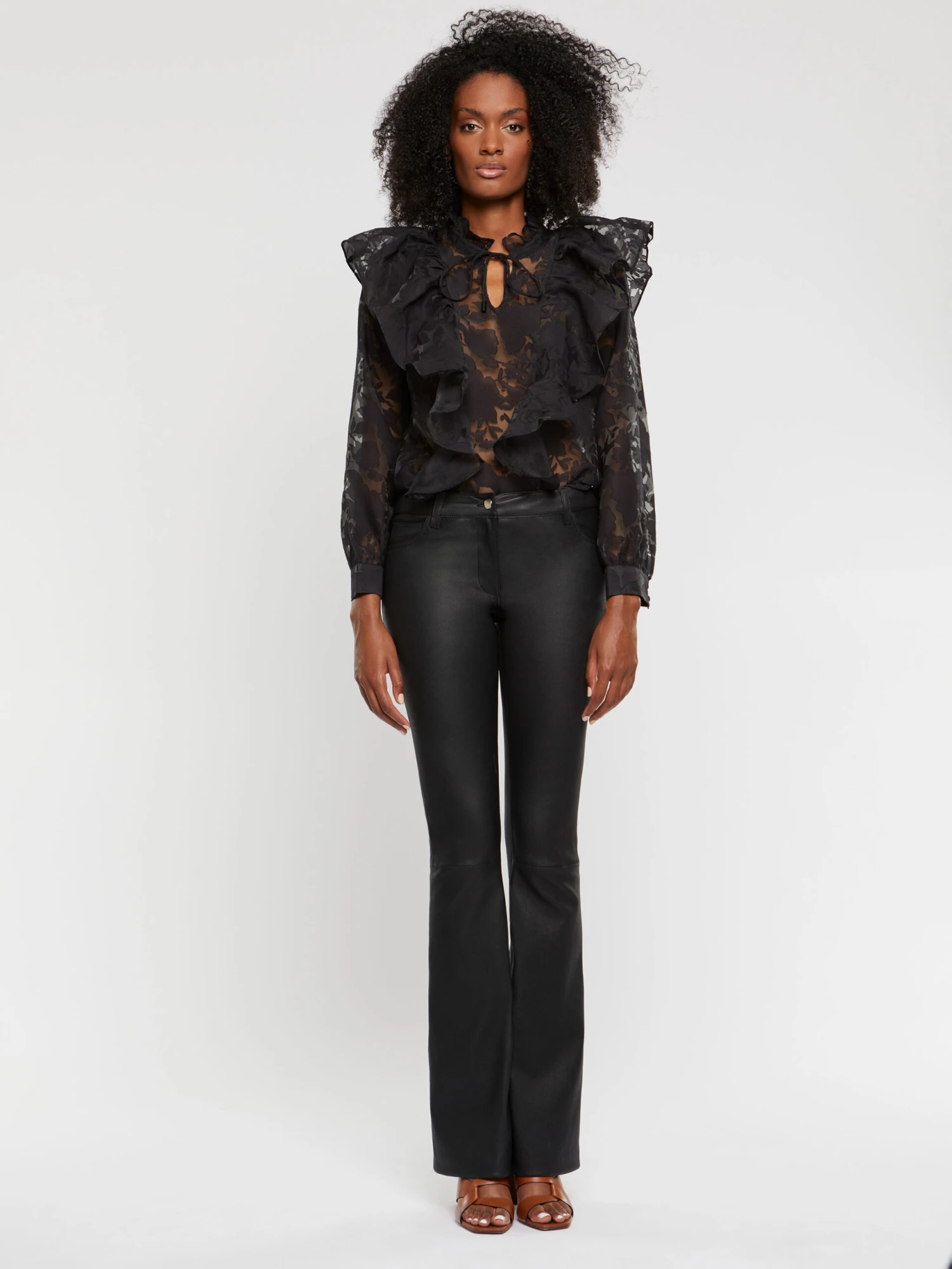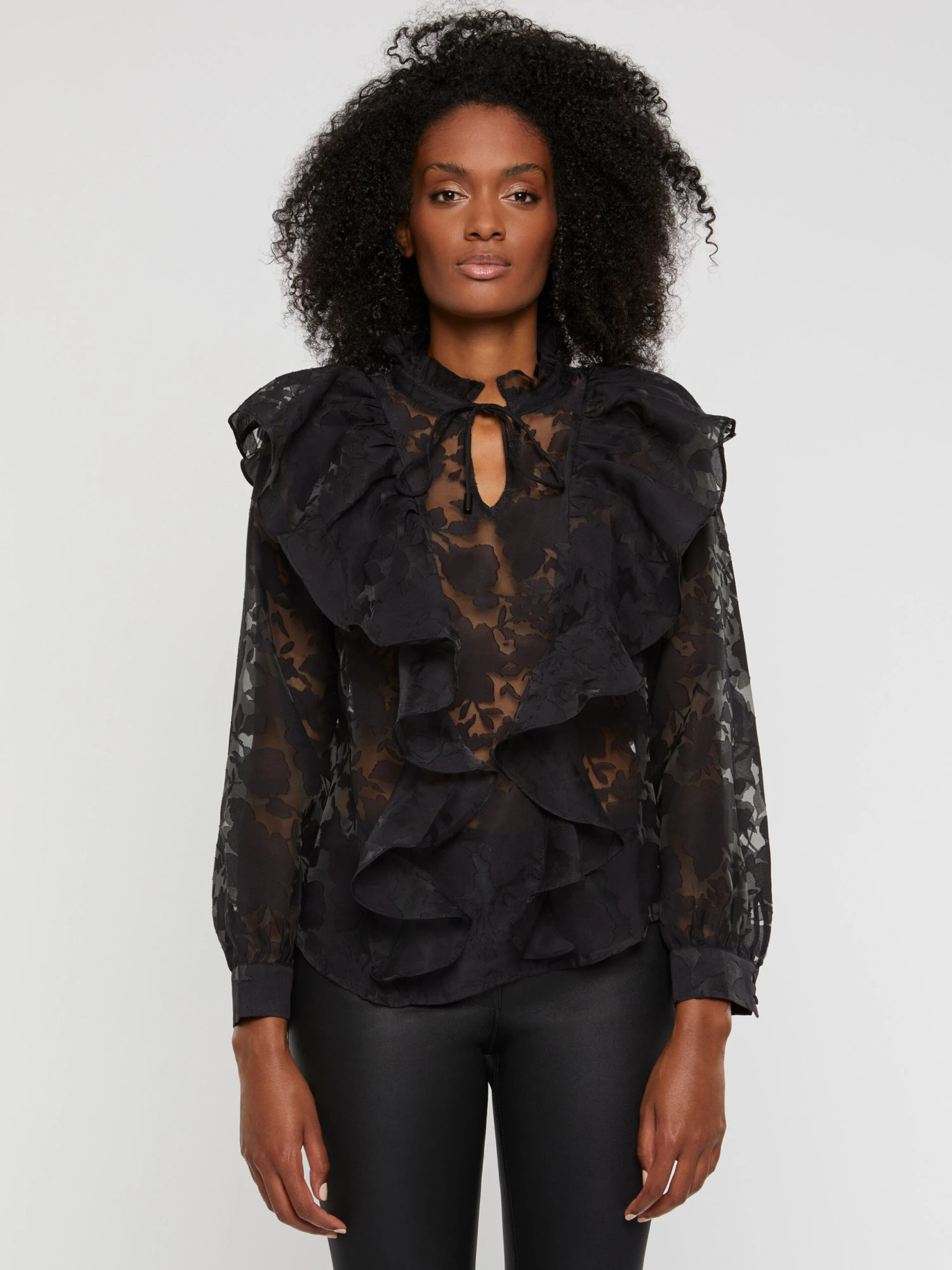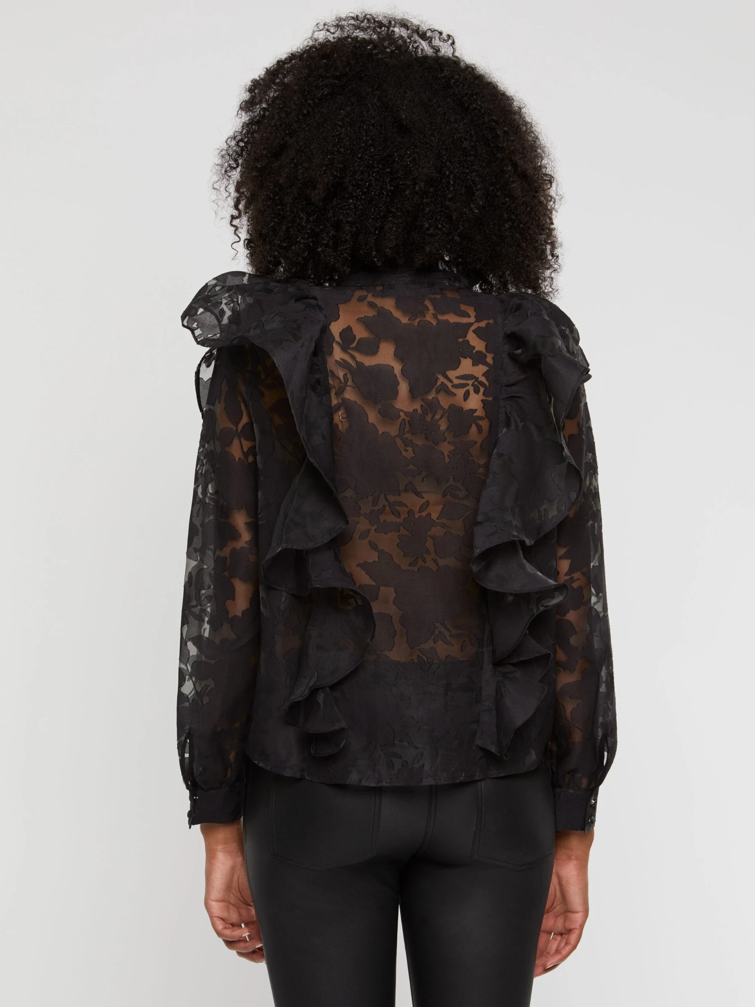La blouse printanière se dessine dans un style spectaculaire. Elle est dotée d’un col victorien et de volants XXL qui recouvrent les épaules et se prolongent sur toute la hauteur du modèle, devant et dans le dos. La confection en organza dévoré se pare d’un motif floral transparent qui s’harmonise parfaitement avec l’esprit romantique de la chemise.