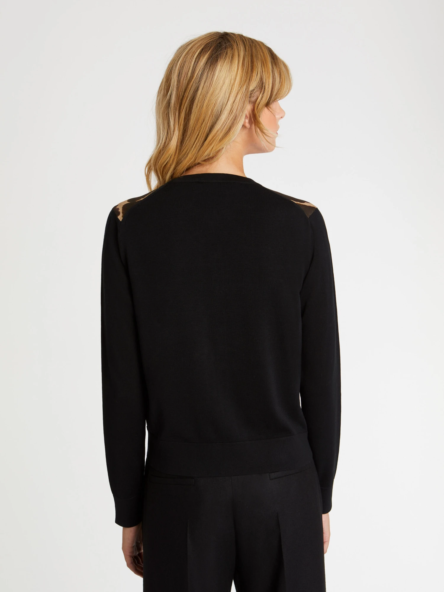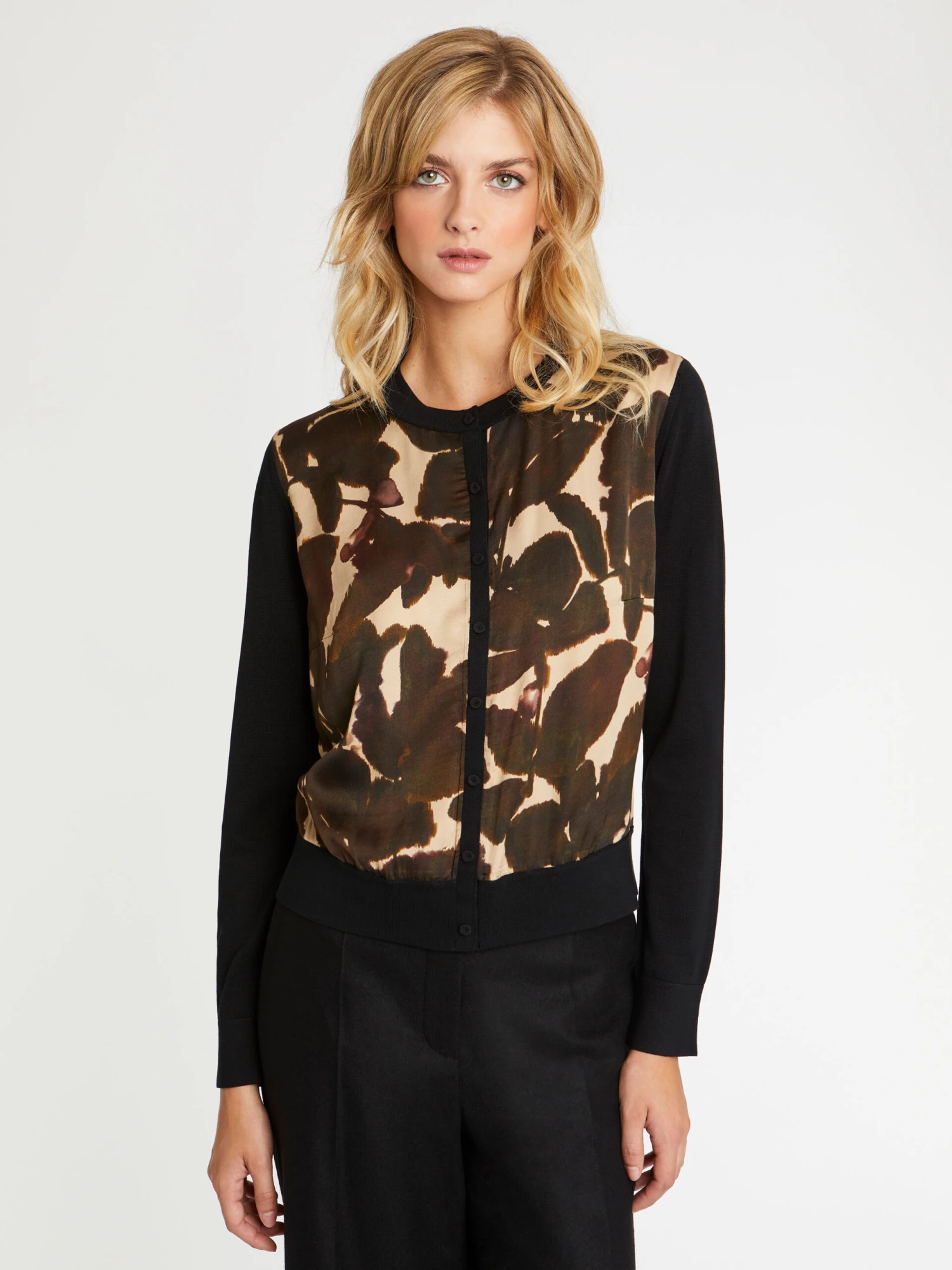 Idéale à la mi-saison, le cardigan en viscose et soie est chaud et léger à la fois. Neutre derrière, la partie avant du gilet affiche un imprimé camouflage. Loin du dessin engagé qu’on imagine, le motif se rapproche davantage d’un feuillage peint à l’aquarelle, vaporeux et diffus. Le modèle est structuré par des bords-côtes et se ferme par des boutons recouverts de tissu. A porter en twin-set avec le débardeur assorti.