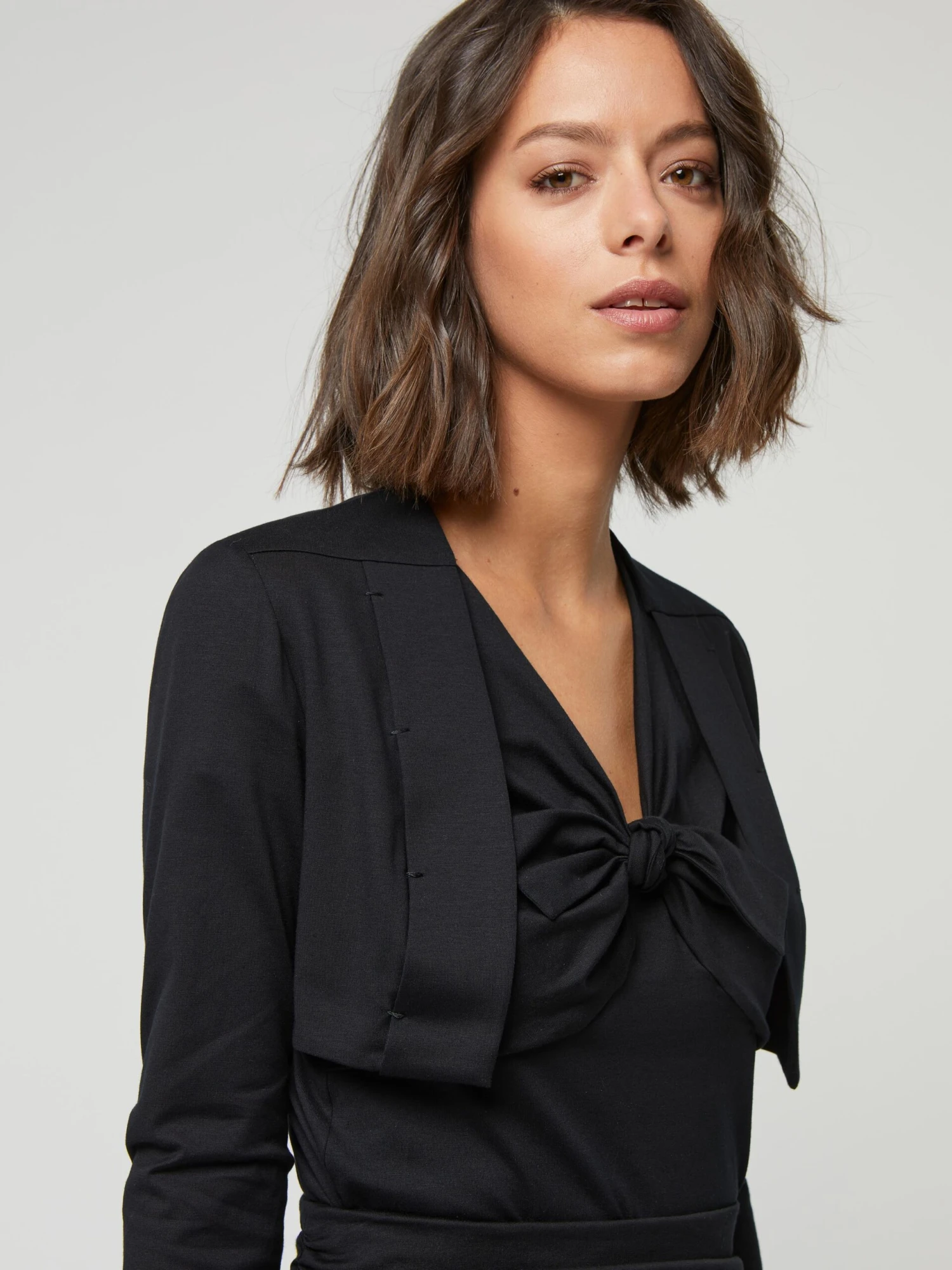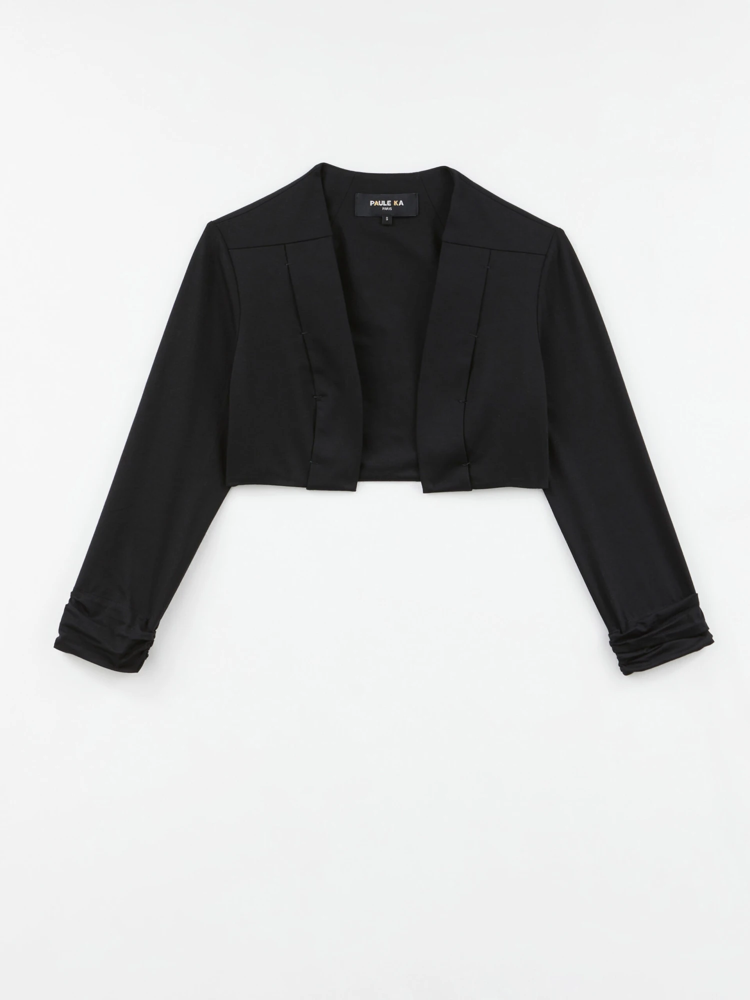 Cardigan court en jersey de coton stretch, manches longues, sans fermeture, revers au niveau des poignets.