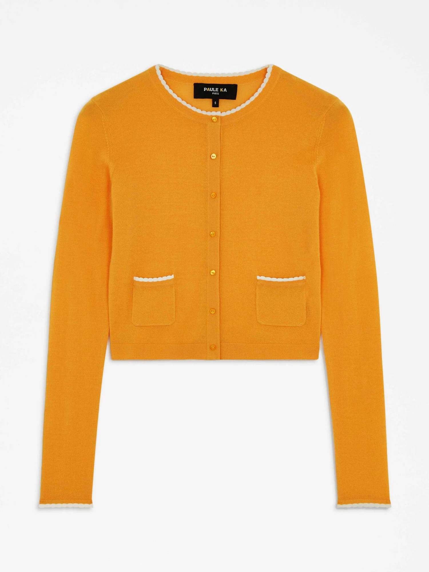 Cardigan long en mérinos, col V, finitions côtélées, manches longues, poches apparentes.