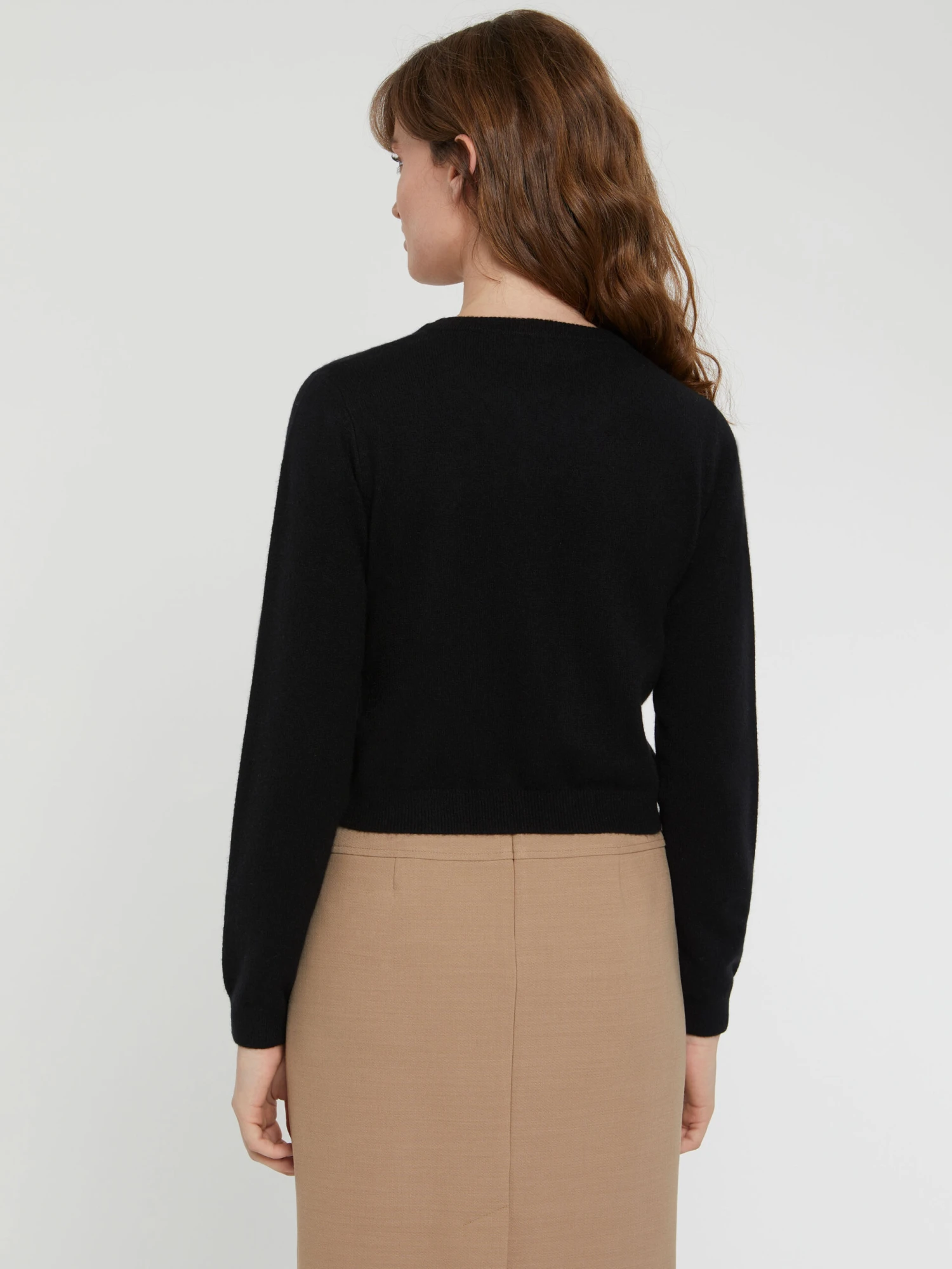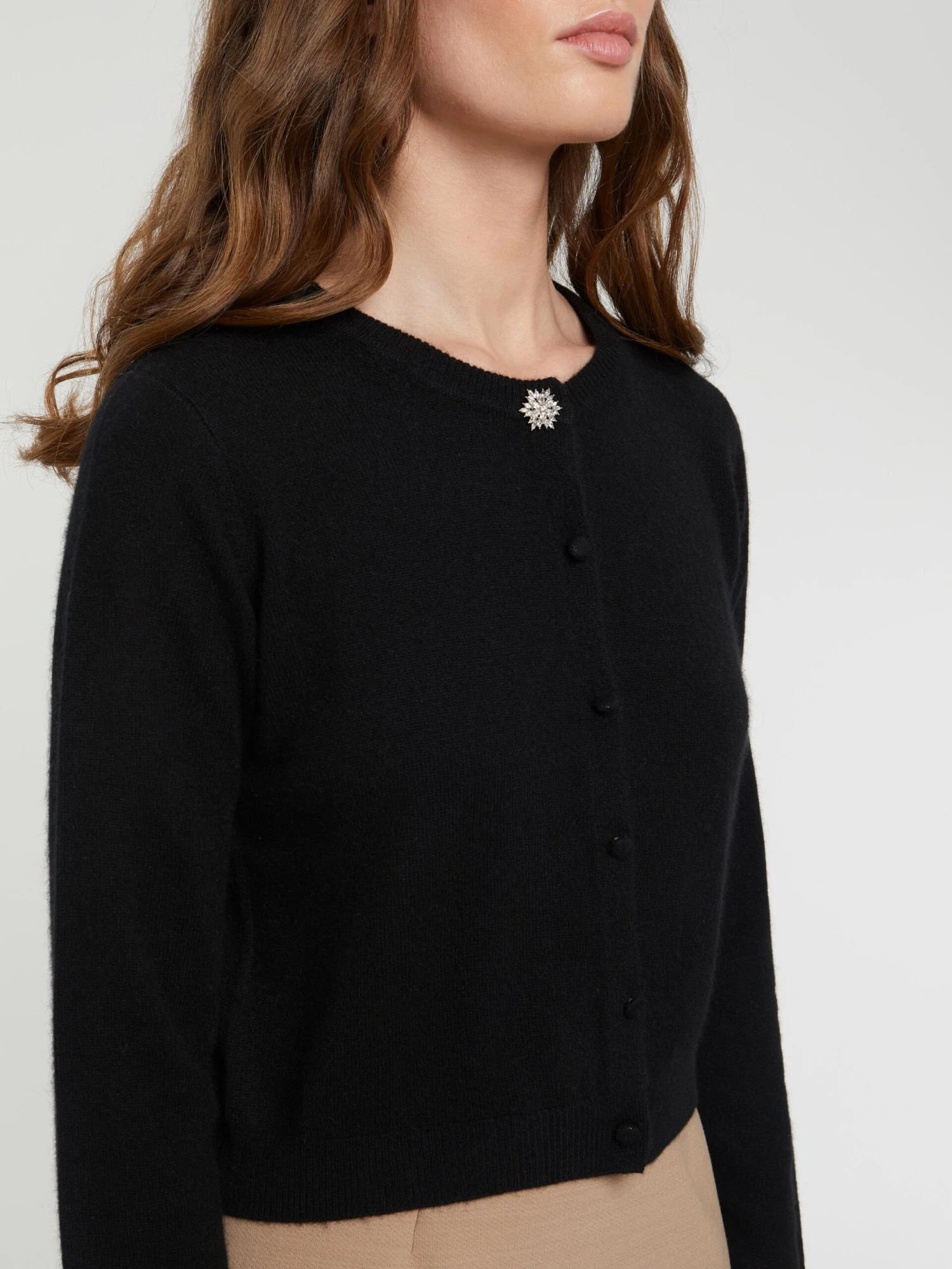 Le gilet en cachemire adopte une coupe courte structurée par des bords-côtes. Il est doté d’un col rond et de manches raccourcies. La fermeture à pressions s’orne de boutons recouverts décoratifs tandis qu?au col un superbe bouton bijou reflète l’esprit BCBG.