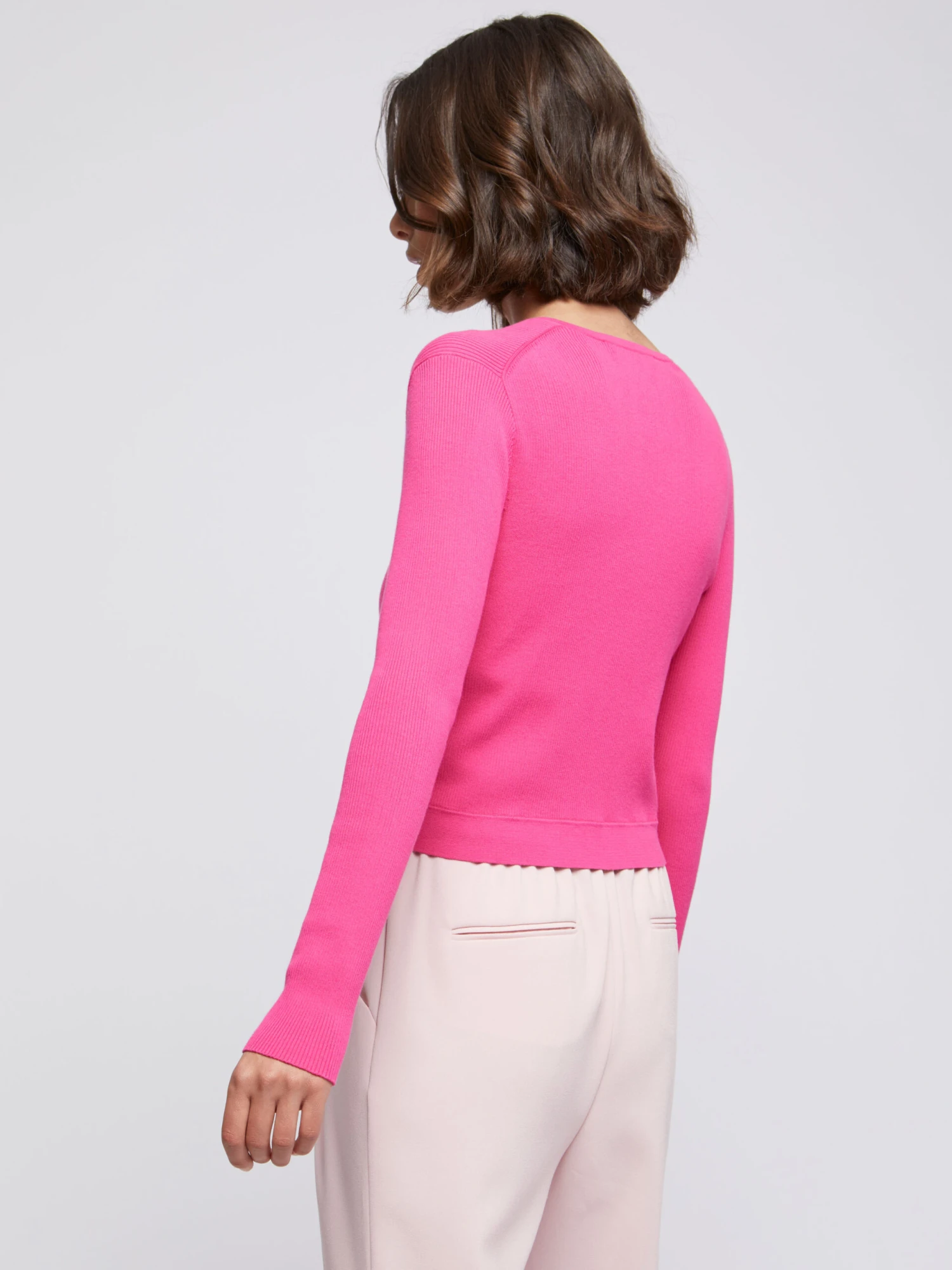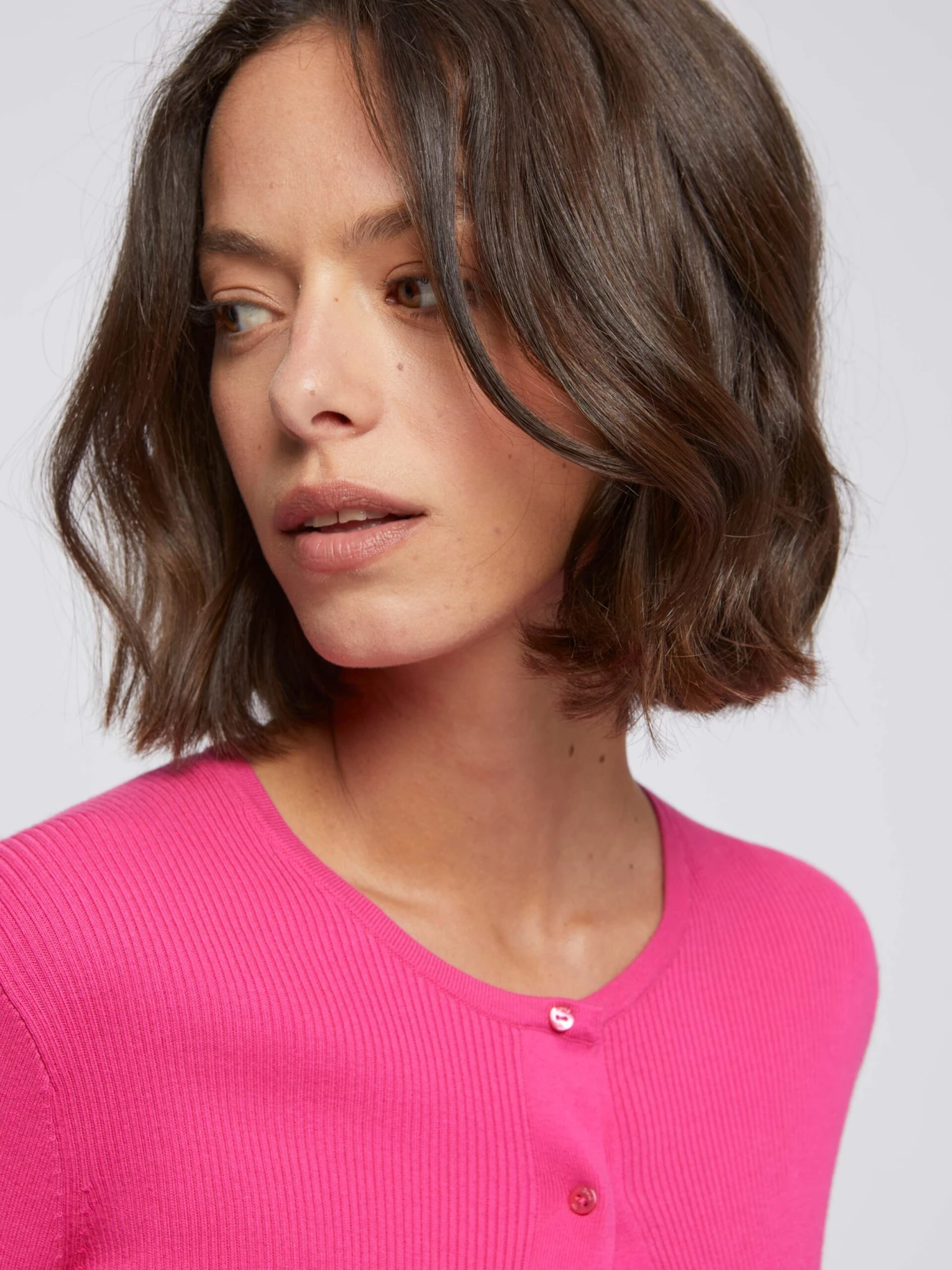 Le petit gilet en maille côtelée de laine et de soie se dessine dans une coupe courte à manches longues et col rond. Les côtes serrées donnent un stretch naturel au vêtement qui se porte près du corps. La fermeture à pressions est dotée de boutons nacrés décoratifs.