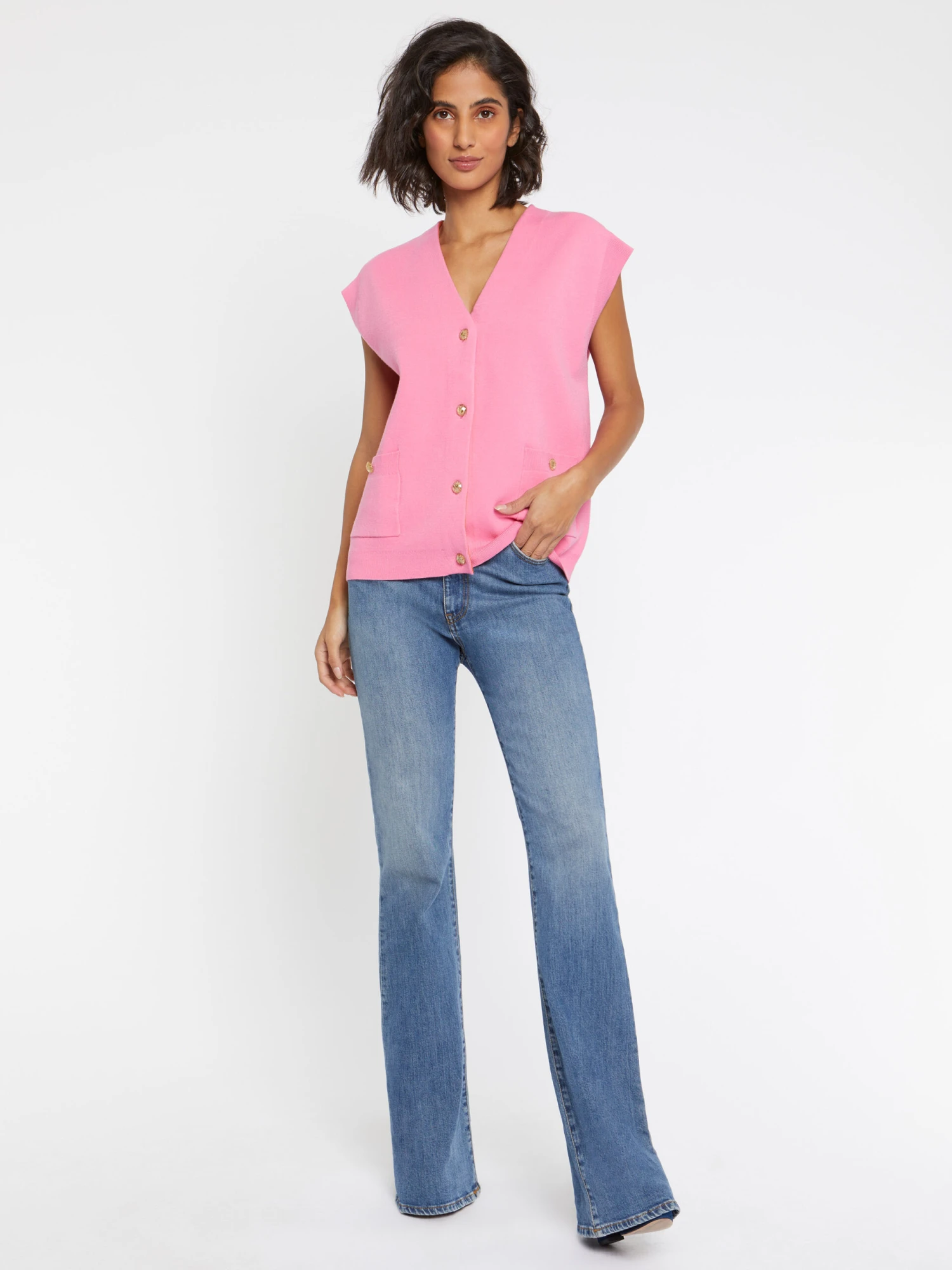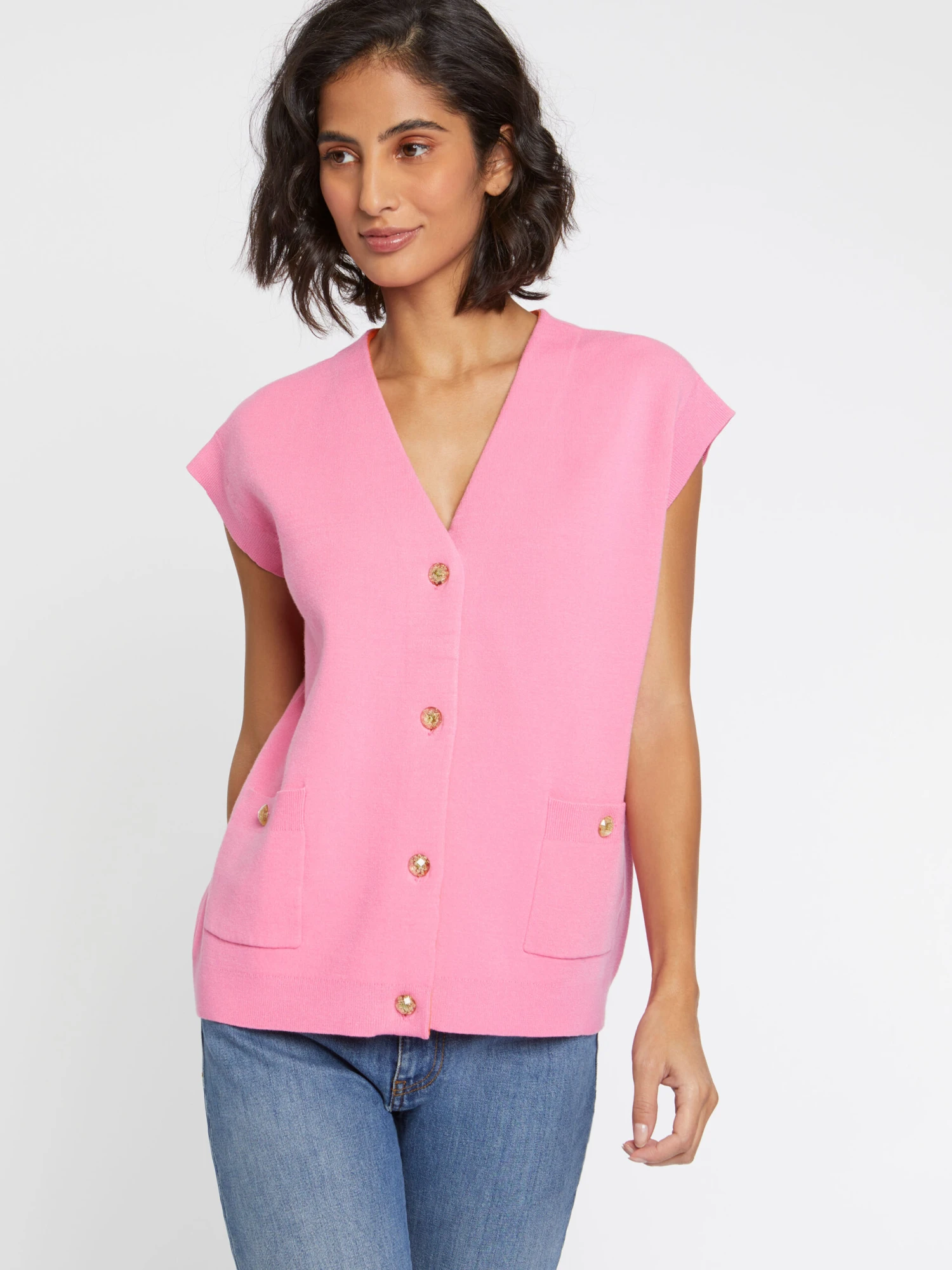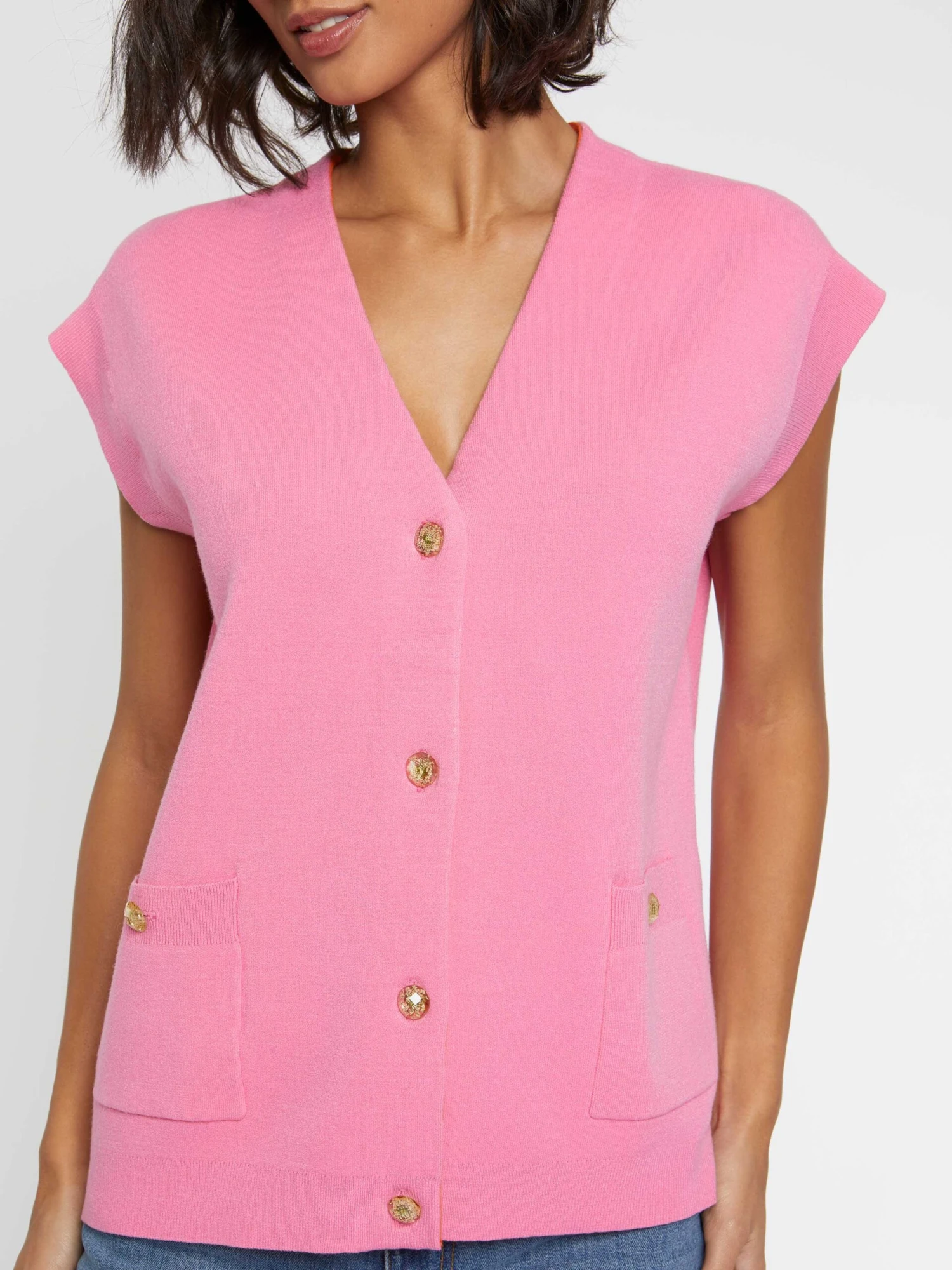 Après le gilet d’homme et le pull sans manches, c’est au tour du gilet sans manches de s’imposer dans le vestiaire féminin. Ici, le cardigan BCBG en viscose, fermé par des boutons bijou, orné d’un col V et de poches plaquées se dessine dans une coupe délestée de ses manches et terminée par des bords-côtes. Un mix de styles qui apporte une identité forte au vêtement. A porter sur sa lingerie ou une chemise de bureau.