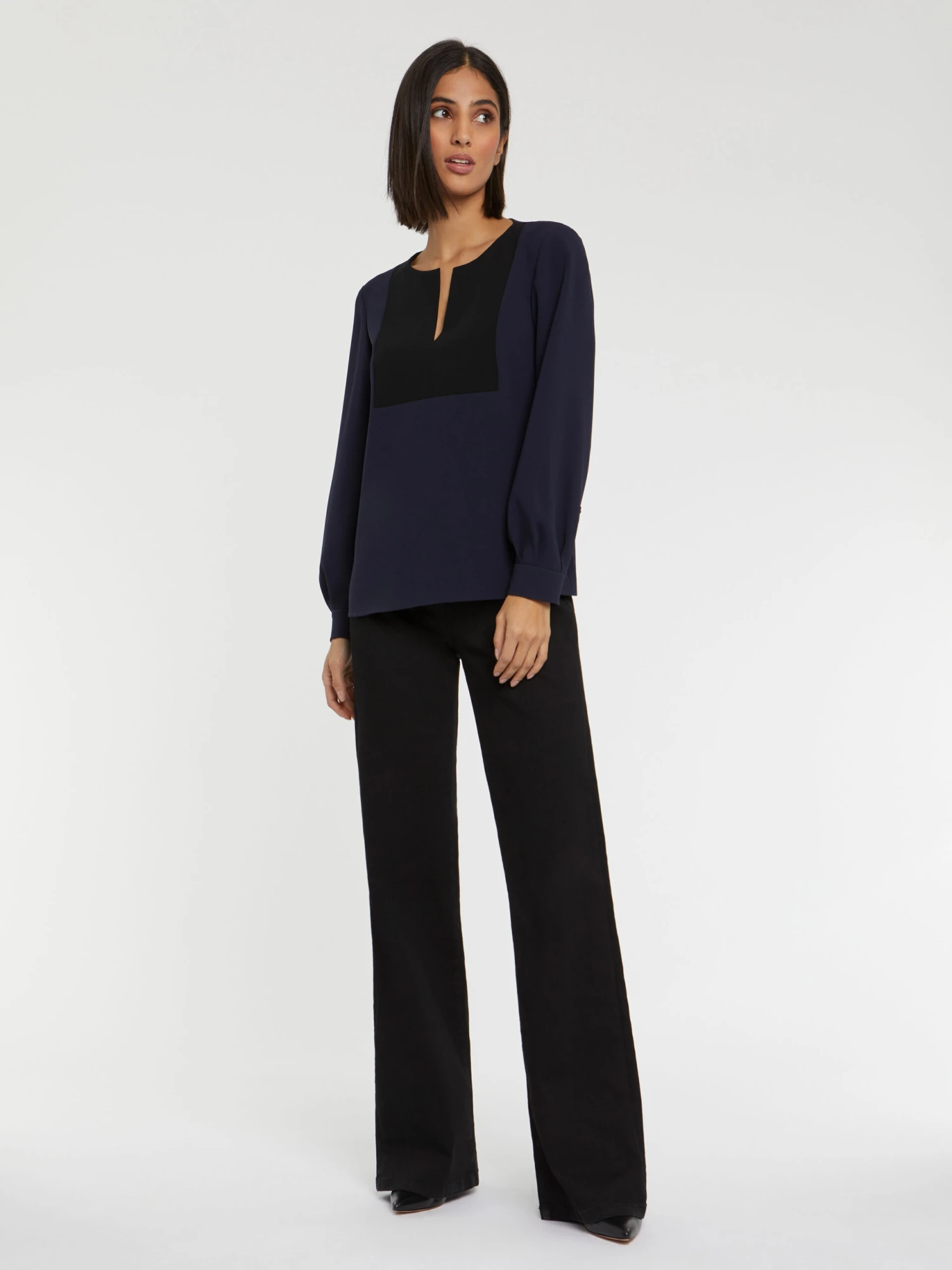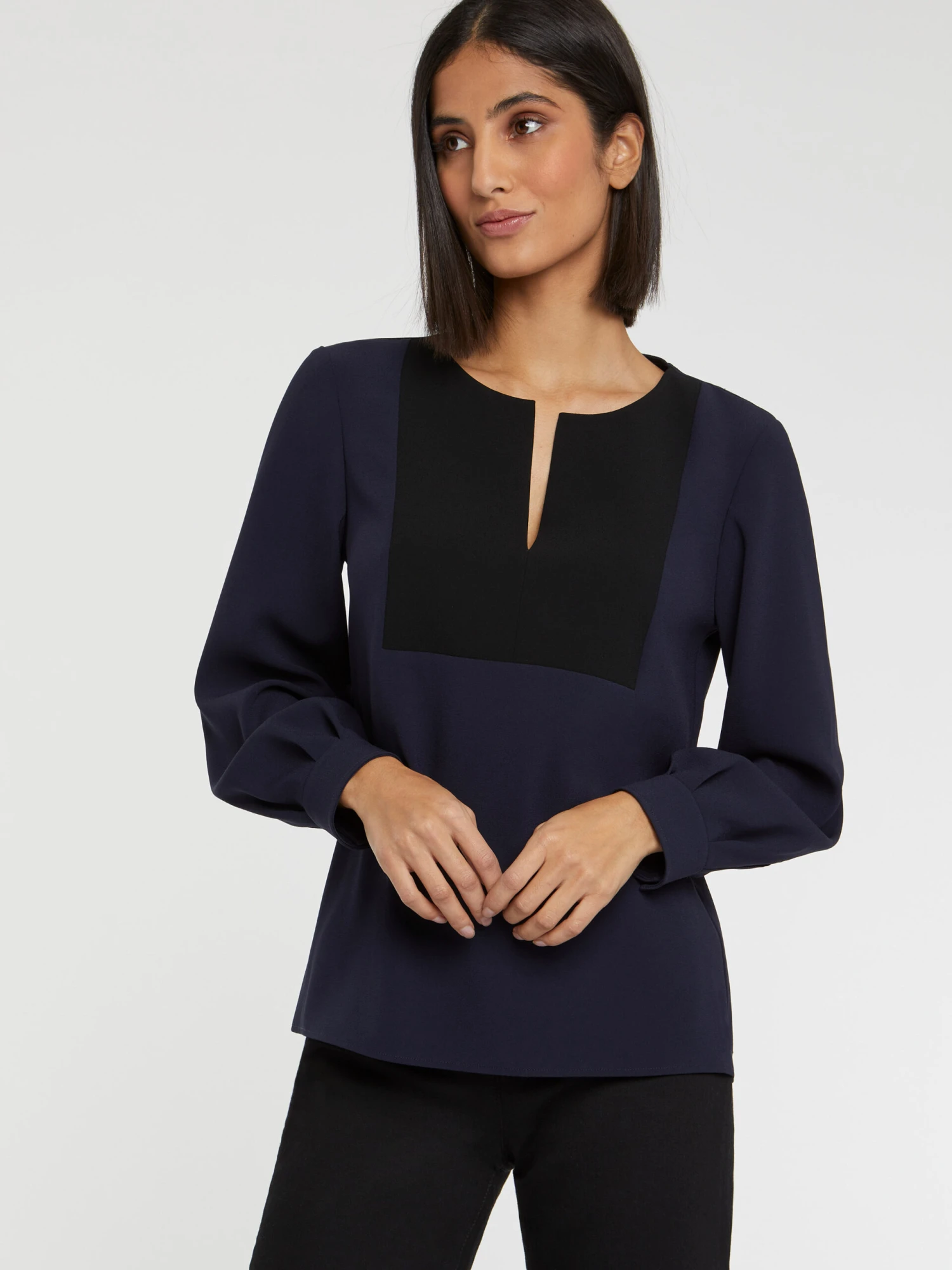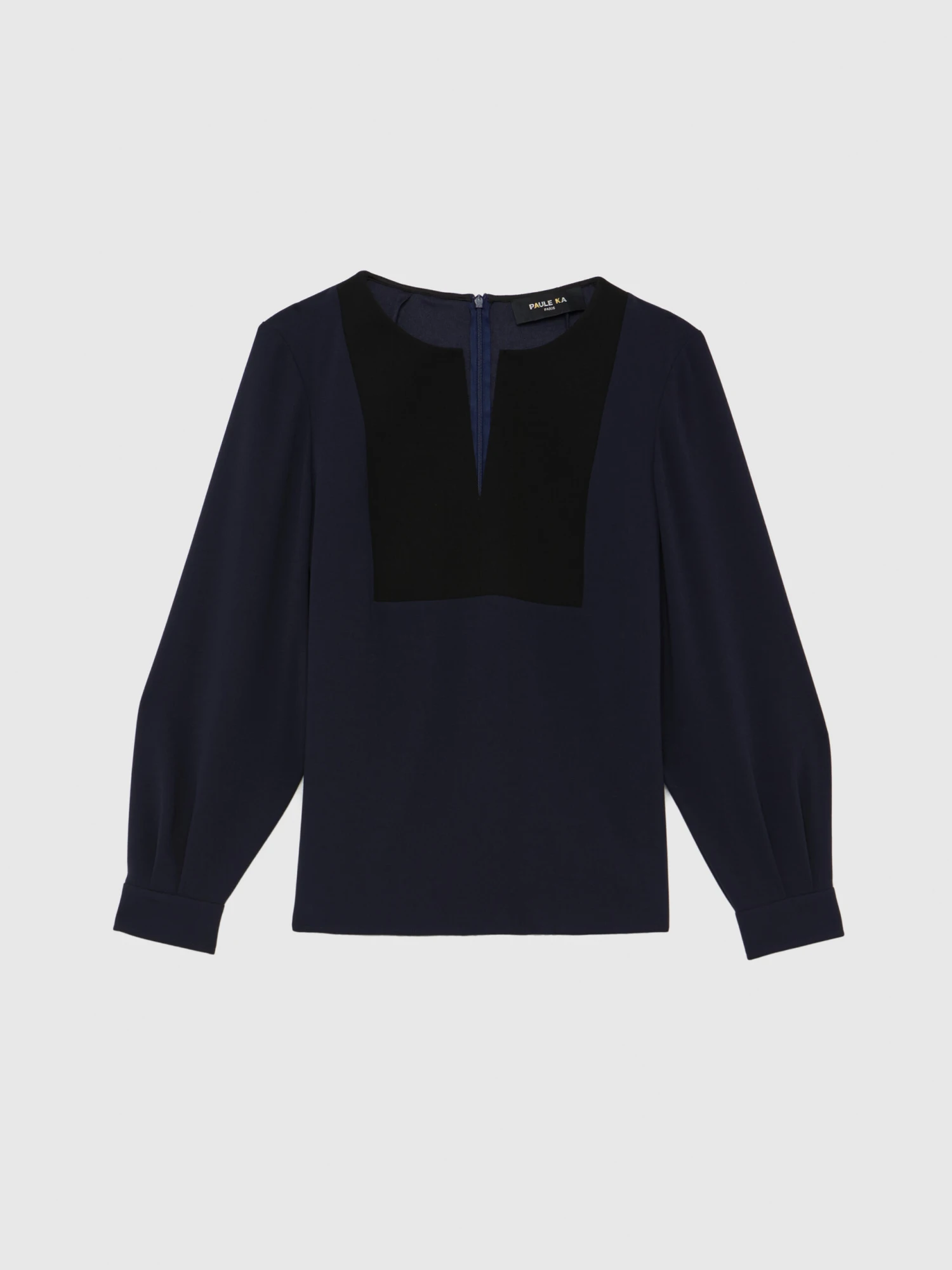 La blouse manches longues est confectionnée en crêpe envers satin et affiche le côté mat du tissu. Elle est ornée d’un plastron au coloris contrasté et d’un ravissant décolleté fendu qui donnent un caractère graphique au vêtement. Les manches fluides sont resserrées par de larges poignets qui viennent blouser la manche. Fermeture éclair invisible au dos.