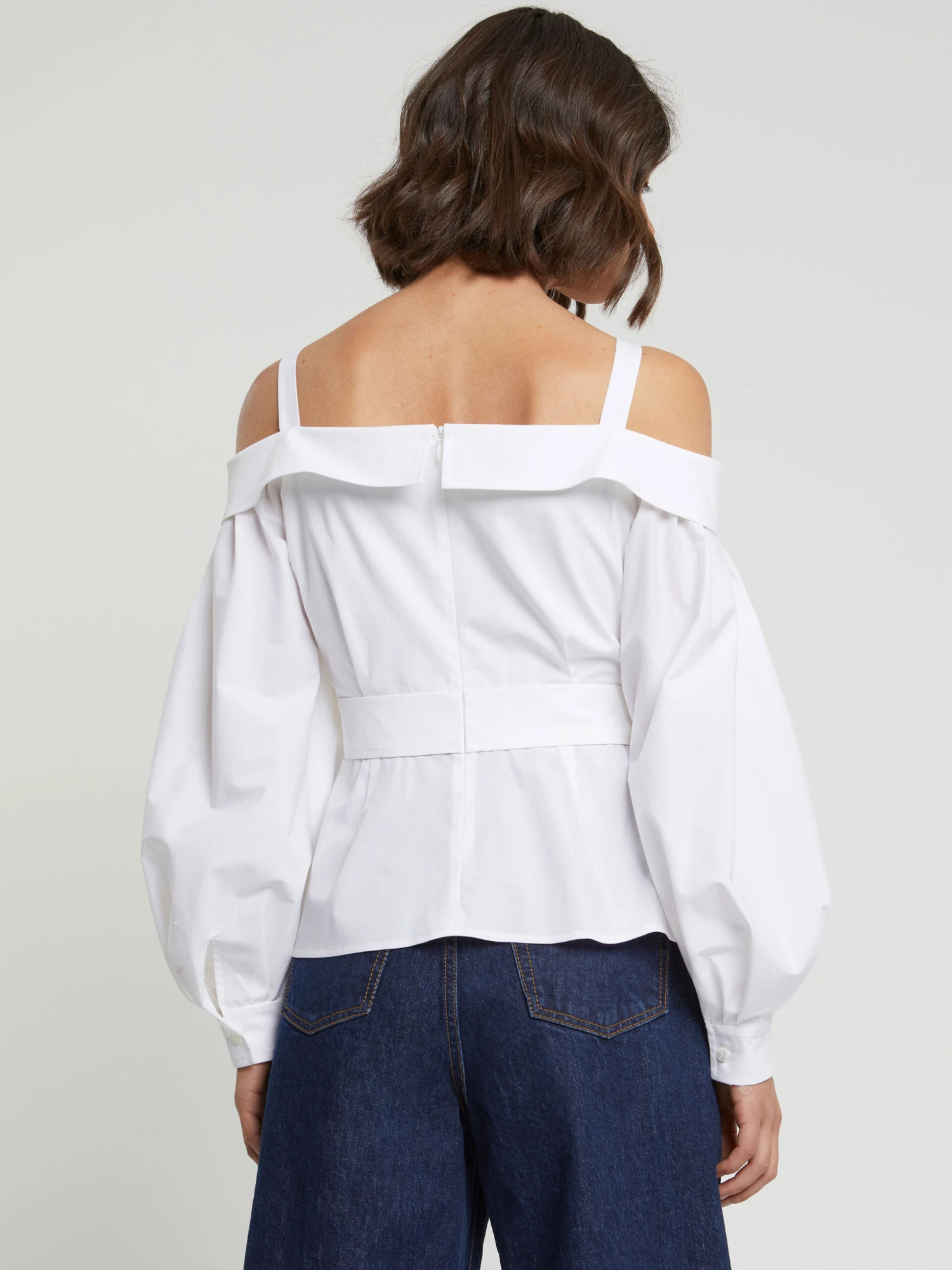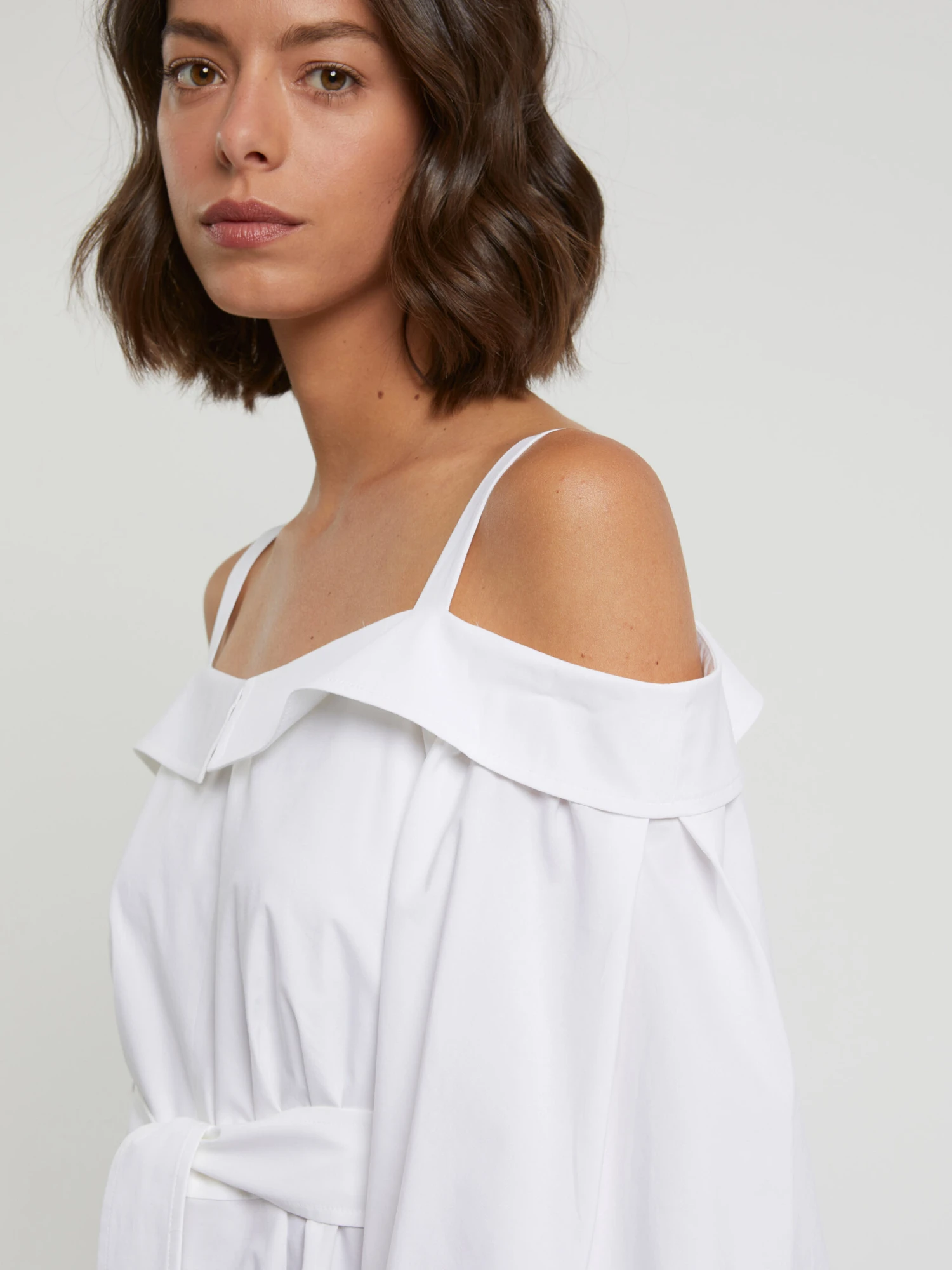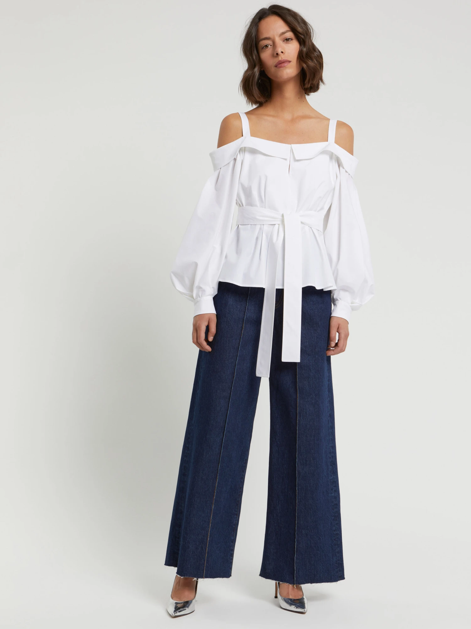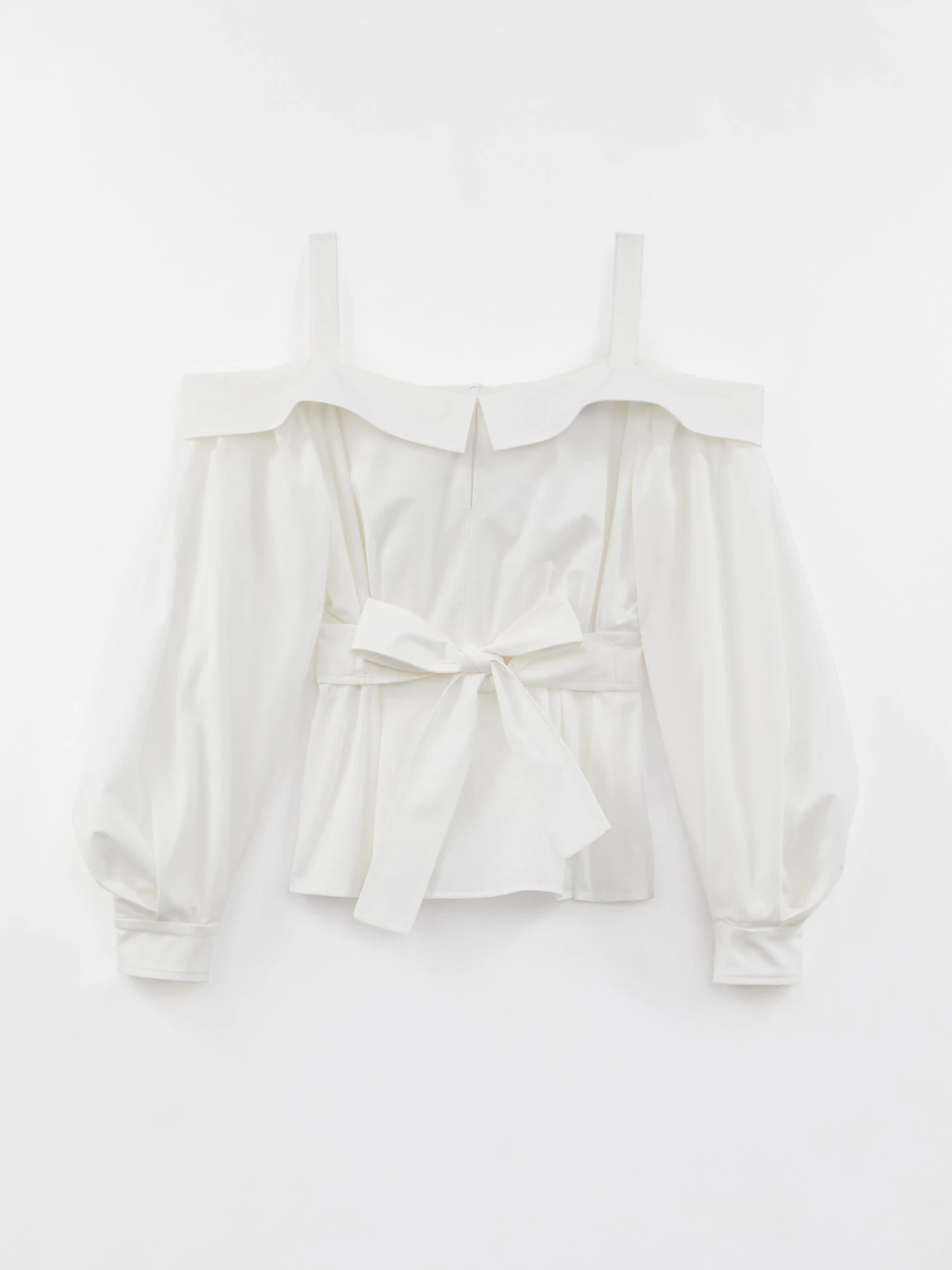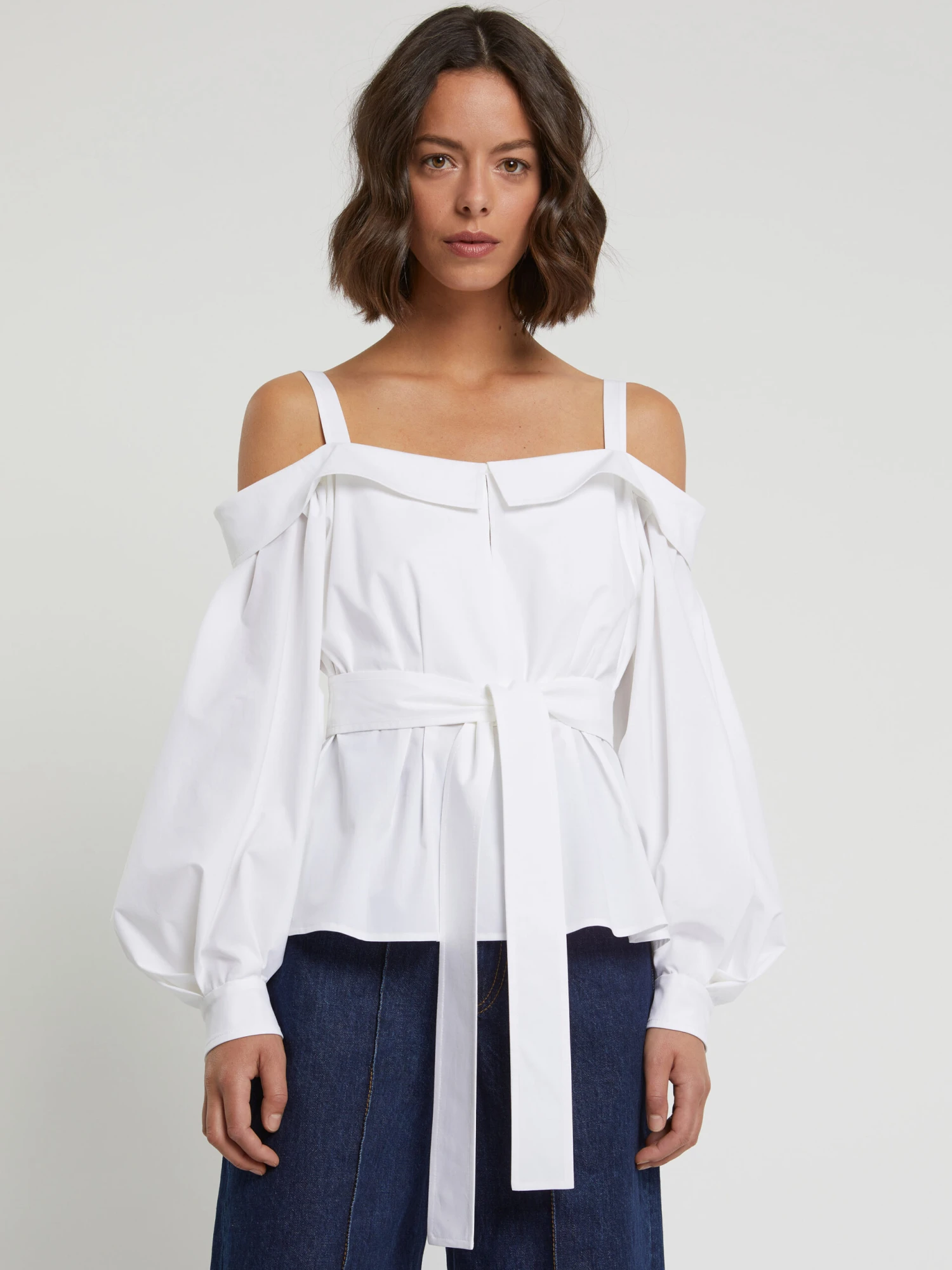 Haut en popeline de coton à nouer au niveau de la taille, manches débardeur longues et larges resserées et bouffantes aux poignets.