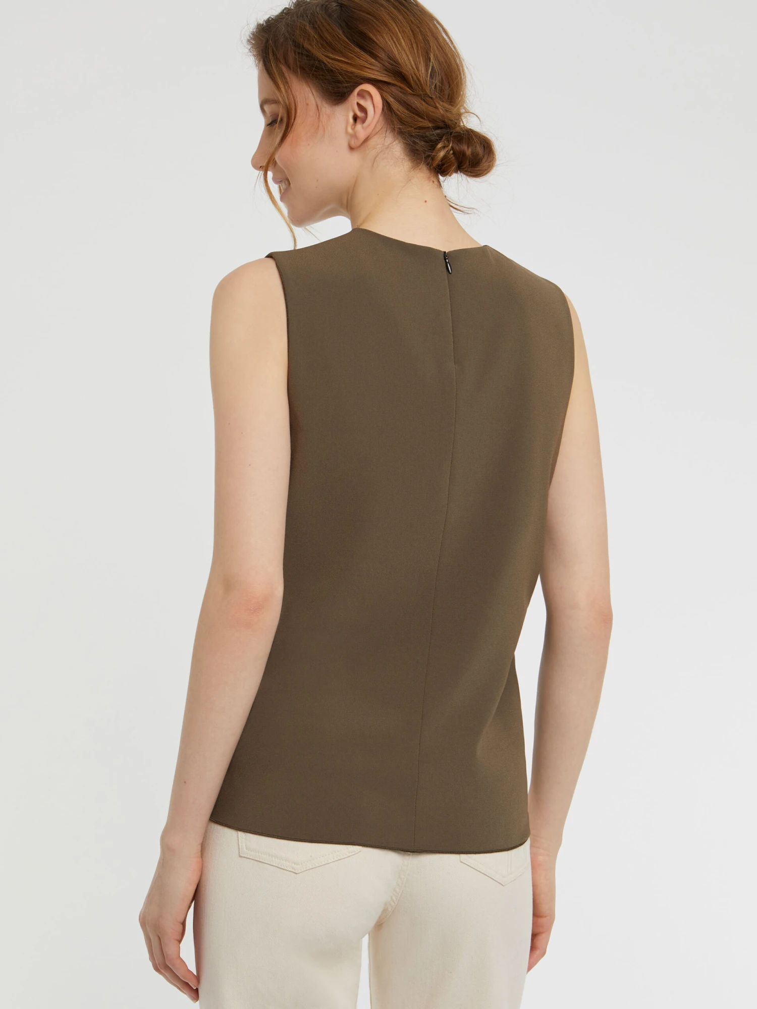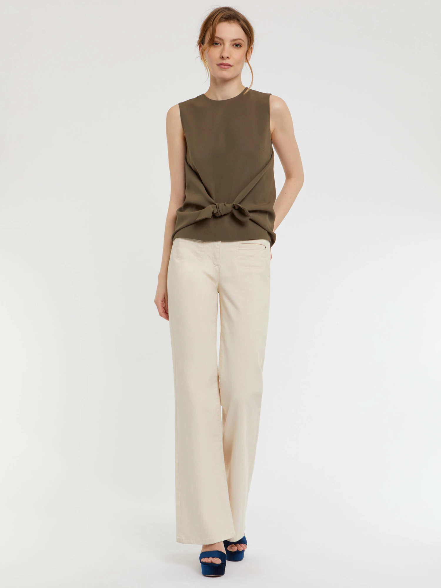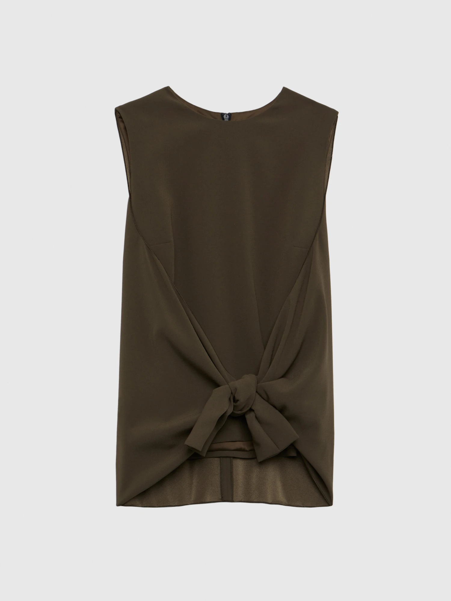Le haut sans manches est confectionné sur le côté mat du satin crêpe. Très élégant, il est sublimé d’un voile léger qui se juxtapose au top et vient se nouer devant à la taille. Facile au quotidien comme pour une occasion particulière, ce haut raffiné s’intègre parfaitement dans la moindre de vos silhouettes. Fermeture éclair invisible au dos.