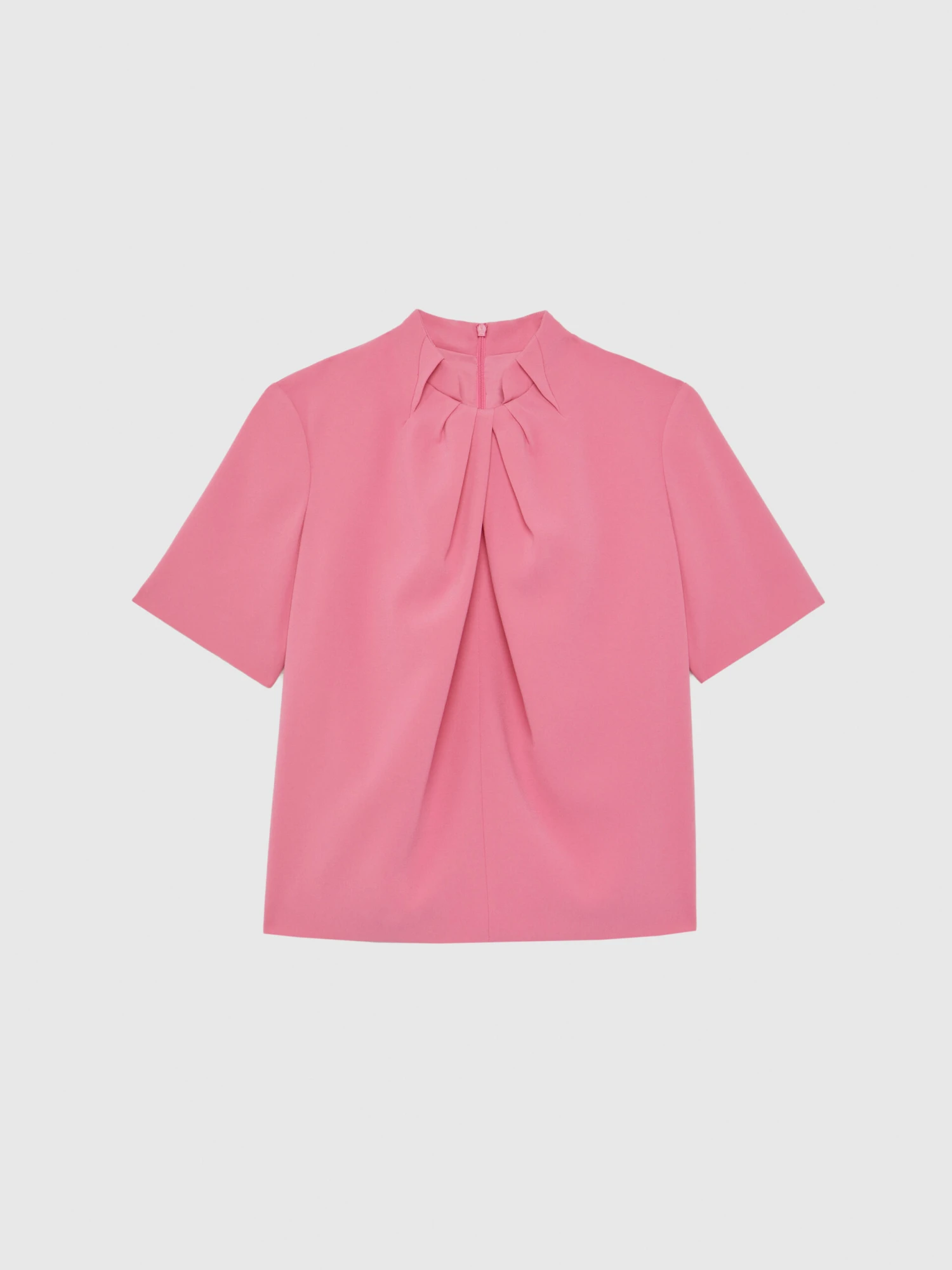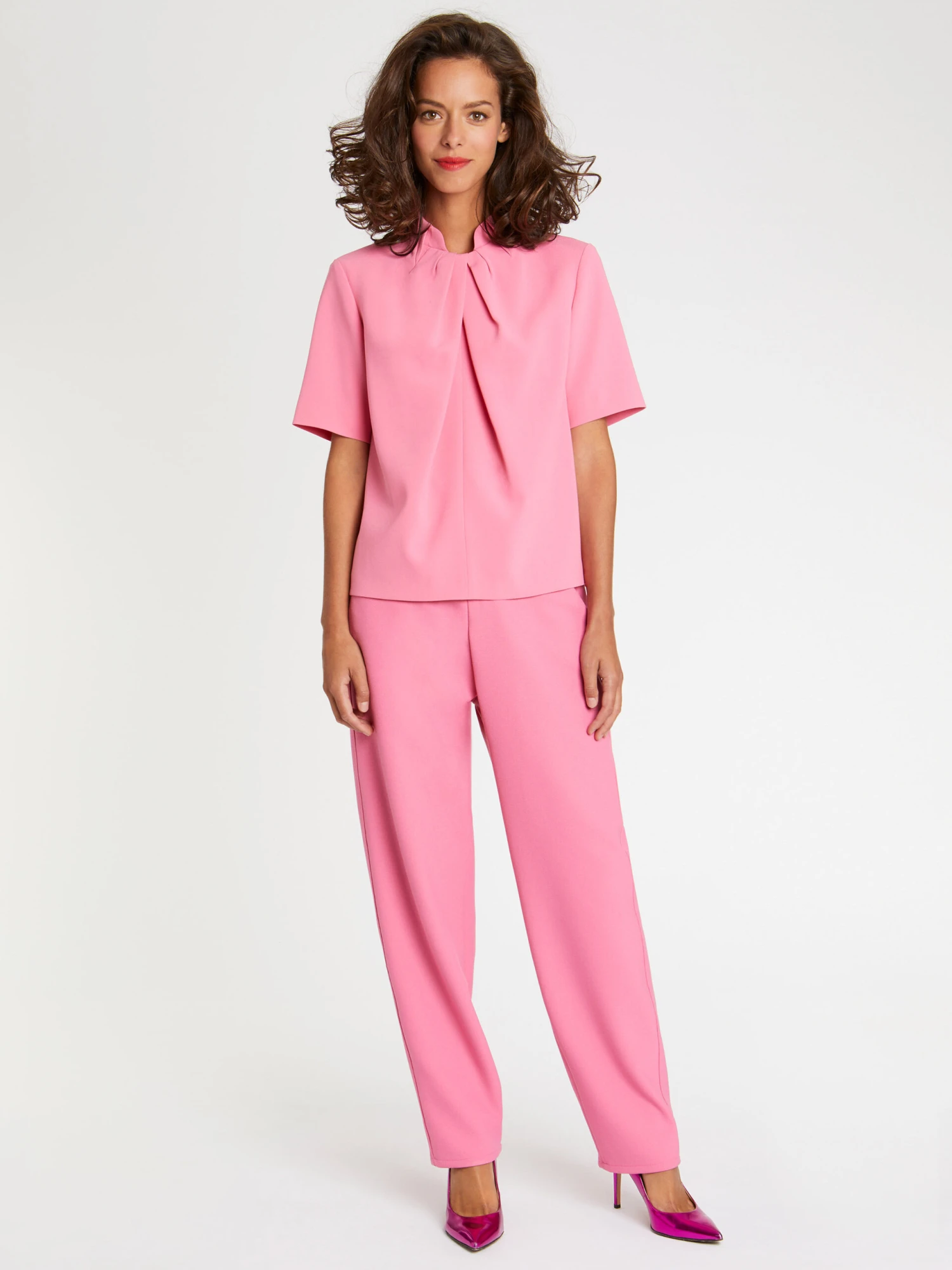Le haut fluide en crêpe envers satin arbore des manches 3/4. Il est doté d’un petit col montant plissé qui diffuse une aura sage, presque strict. Depuis l’encolure, un large pli creux s’esquisse sur la poitrine et apporte un joli mouvement fluide au top. Fermeture éclair invisible au dos.