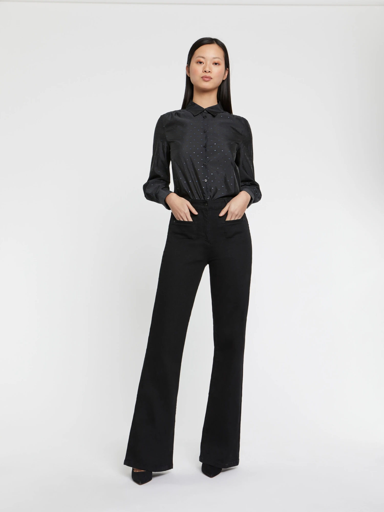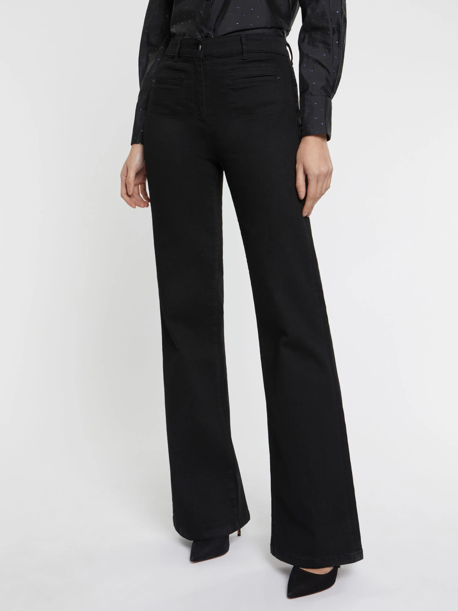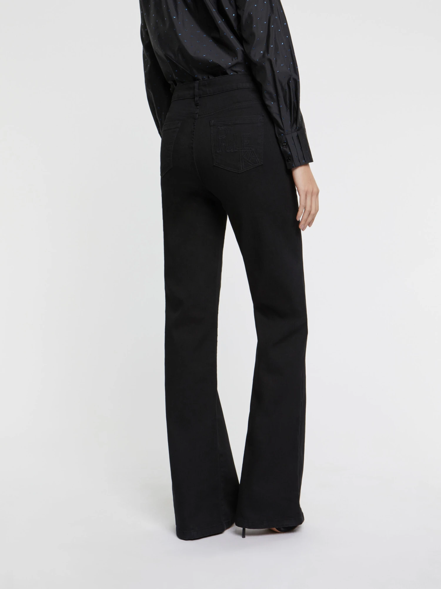 Le pantalon en denim arbore l’incontournable coupe flare. Doté d’une taille haute à fermeture éclair et bouton, le jeans stretch dessine une silhouette longiligne et allonge votre allure. Il est doté d’une ceinture à passants et de poches passepoilées à l’avant. Au dos, l’une des deux poches plaquées est brodée du nom de la marque. A porter avec une paire de talons hauts pour accentuer l’effet jambes infinies.