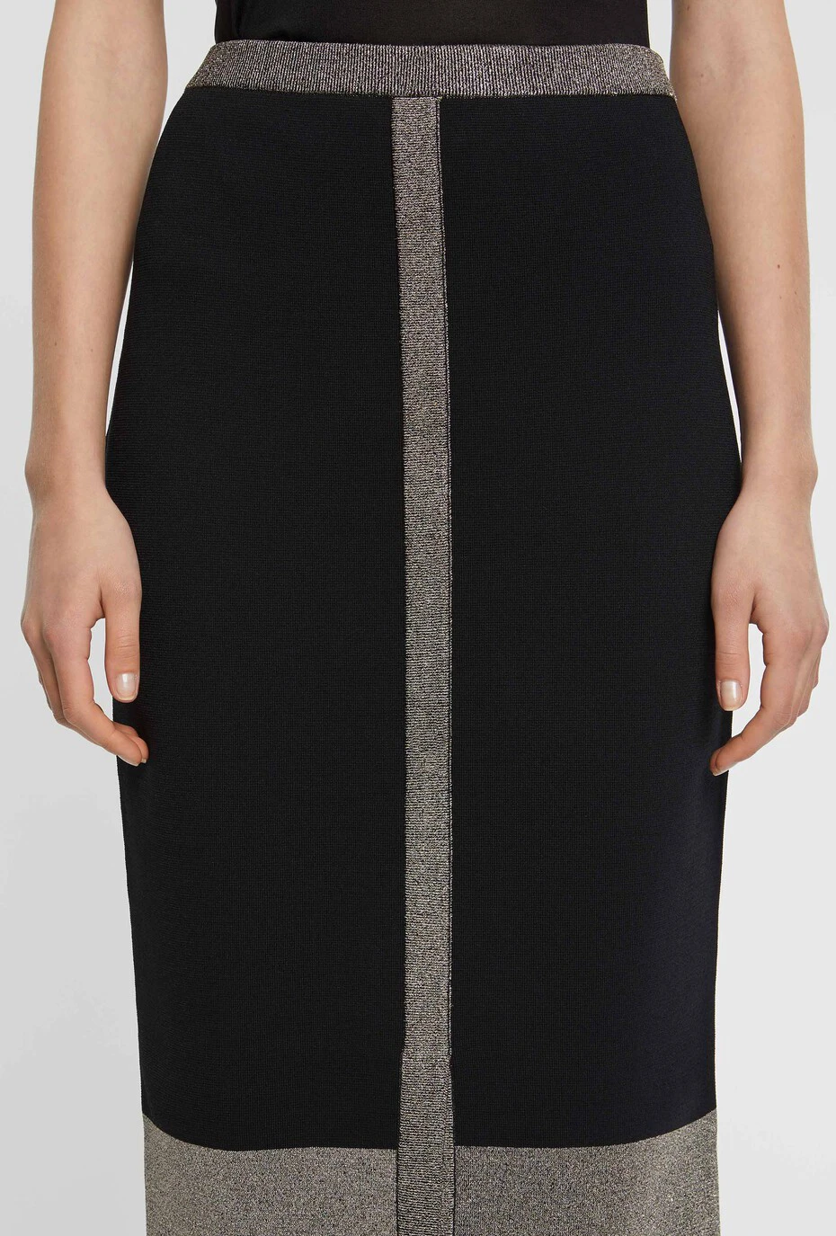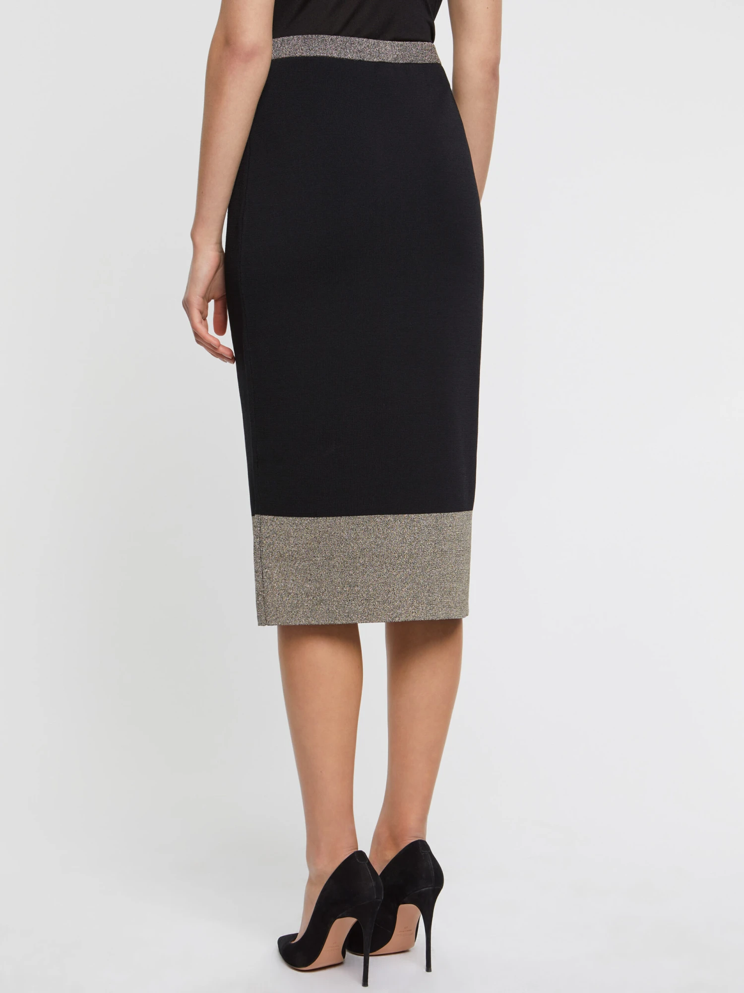 Emblème du style BCBG, la jupe crayon longueur midi à taille haute s’inscrit désormais dans le vestiaire quotidien. Résolument élégante et féminine, la jupe moulante boutonnée met votre silhouette en valeur. Ici, la confection en viscose Milano offre une maille serrée et confortable pour la marche. Les touches de lurex parfaitement déposées et les boutons bijou transcendent le modèle hautement désirable.