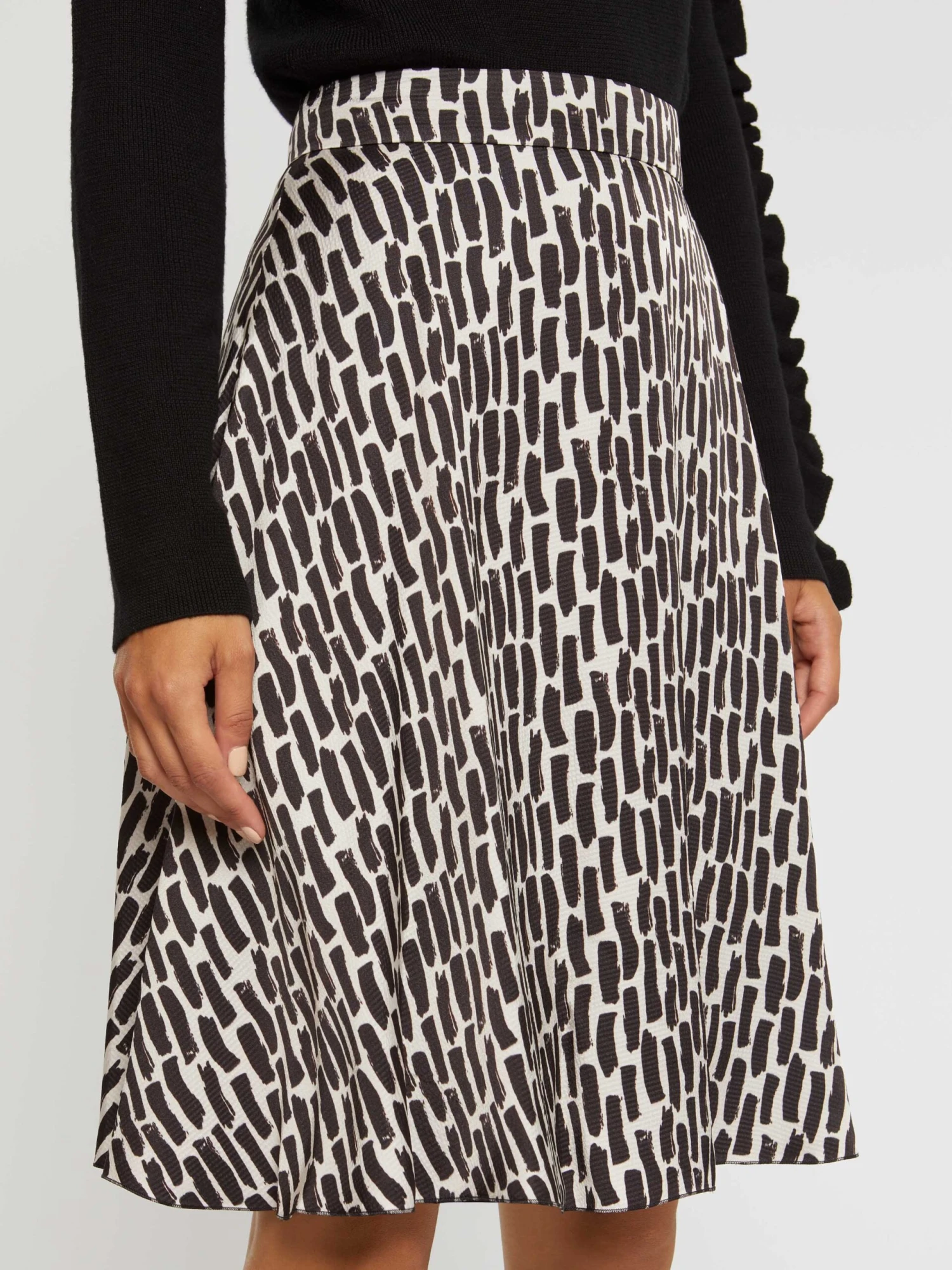 La jupe midi marquée à la taille haute s’inspire de la féminité des jupes patineuses. Sa légèreté et son joli volume évasé sont facilités par la confection satinée en viscose martelée. Vous apprécierez l’imprimé coups de pinceau qui apporte une note graphique et pointue au modèle bicolore. Longueur 60 cm.