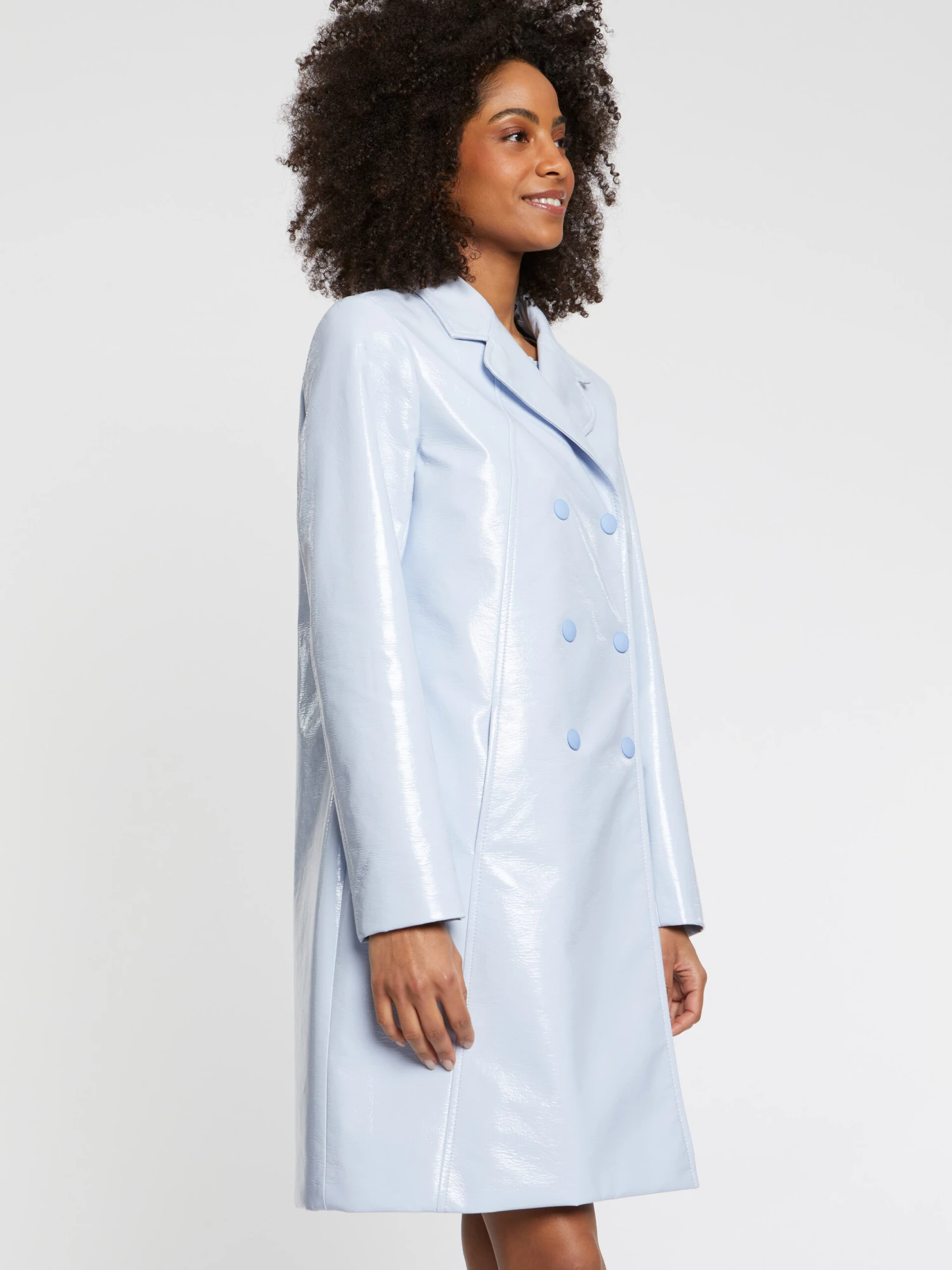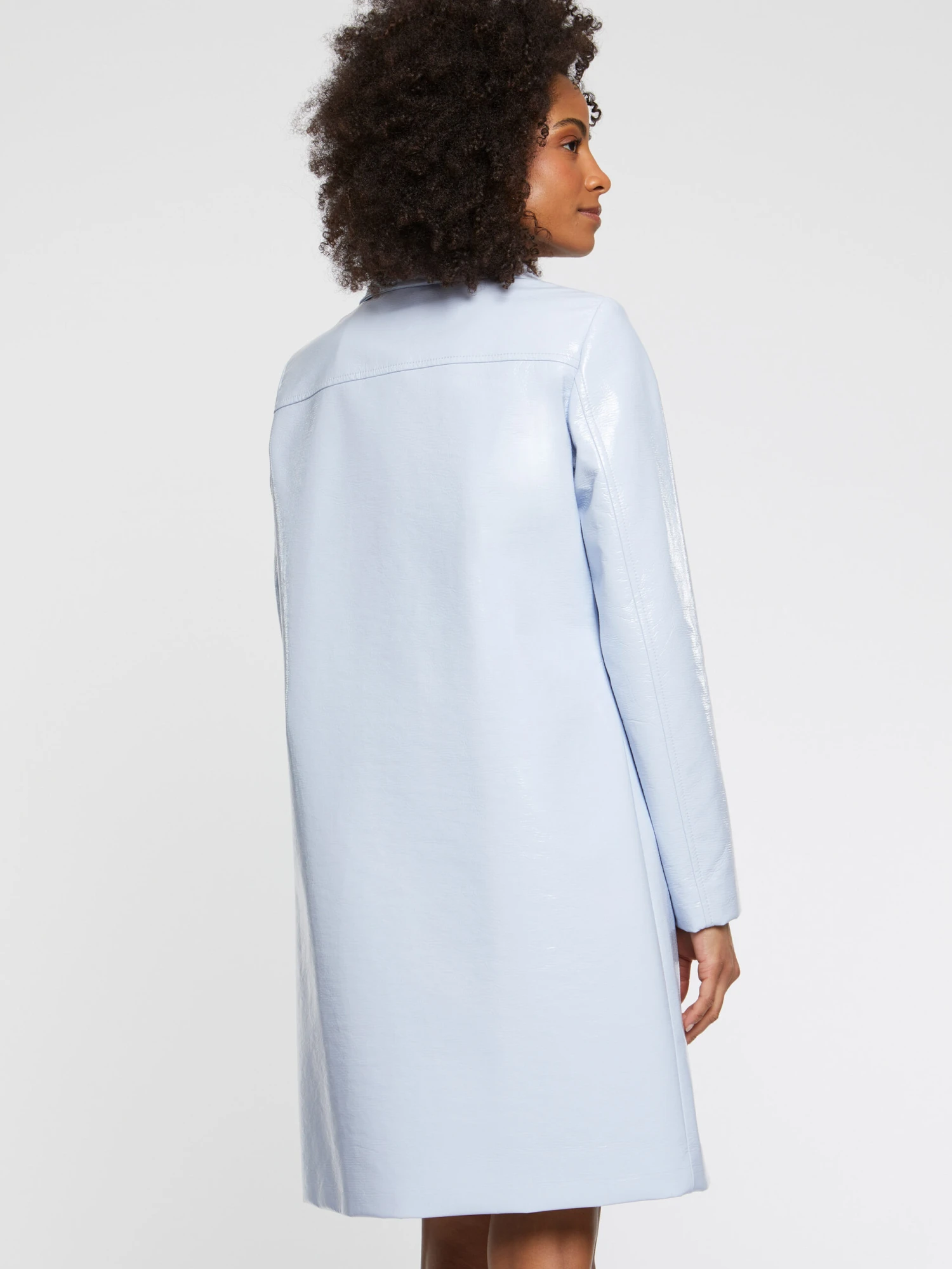 Le manteau court adopte une coupe légèrement trapèze. Il est doté d’un col tailleur arrondi et d’une fermeture croisée à pressions invisibles. Confectionné en vinyle, le manteau mi-saison arbore un look glamour tout droit venu du passé. Longueur : 52 cm.