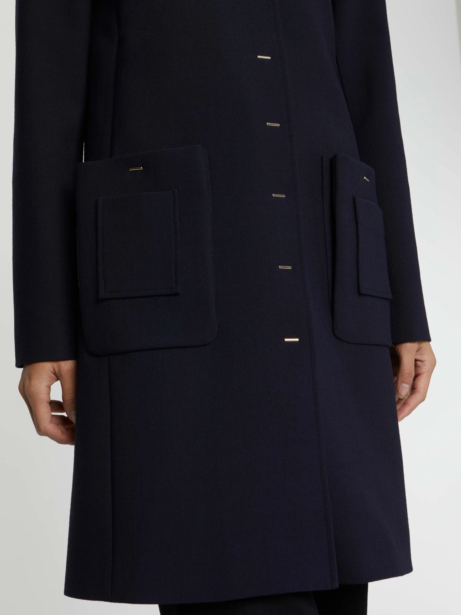 Cet hiver, le manteau mi-long est confectionnée en tricotine stretch dont la texture à côtes donne un relief élégant au vêtement. Quant à la coupe, elle revisite les années 60. Le modèle reprend les codes rétro, petit col, boutonnage apparent et poches décoratives avec une touche de modernité. Pressions baguettes de fermeture et poches ultra-graphiques façonnent son allure. Une pièce élaborée et féminine.