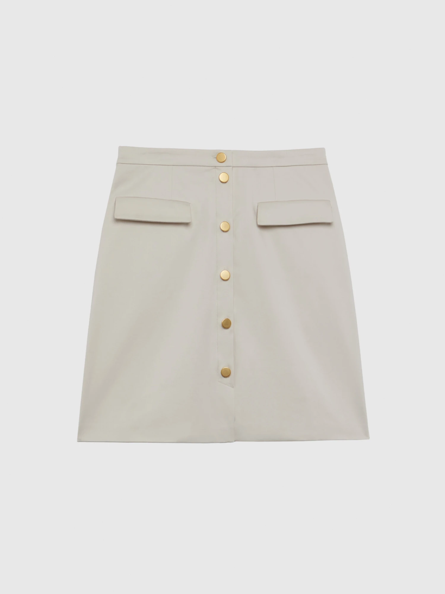 La mini-jupe printanière en satin de coton stretch s’esquisse dans une coupe droite légèrement évasée. Elle est structurée par une patte de boutonnage et des poches à rabat. Grâce à la légère coupe trapèze et la matière extensible, la jupe droite boutonnée promet un vrai confort à la marche tout en dessinant une ligne féminine et glamour. Longueur : 50 cm.