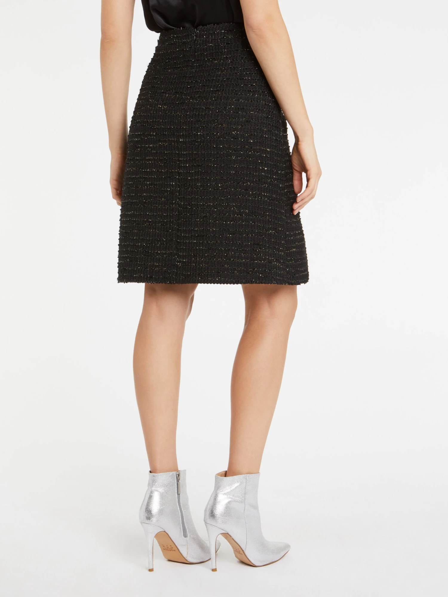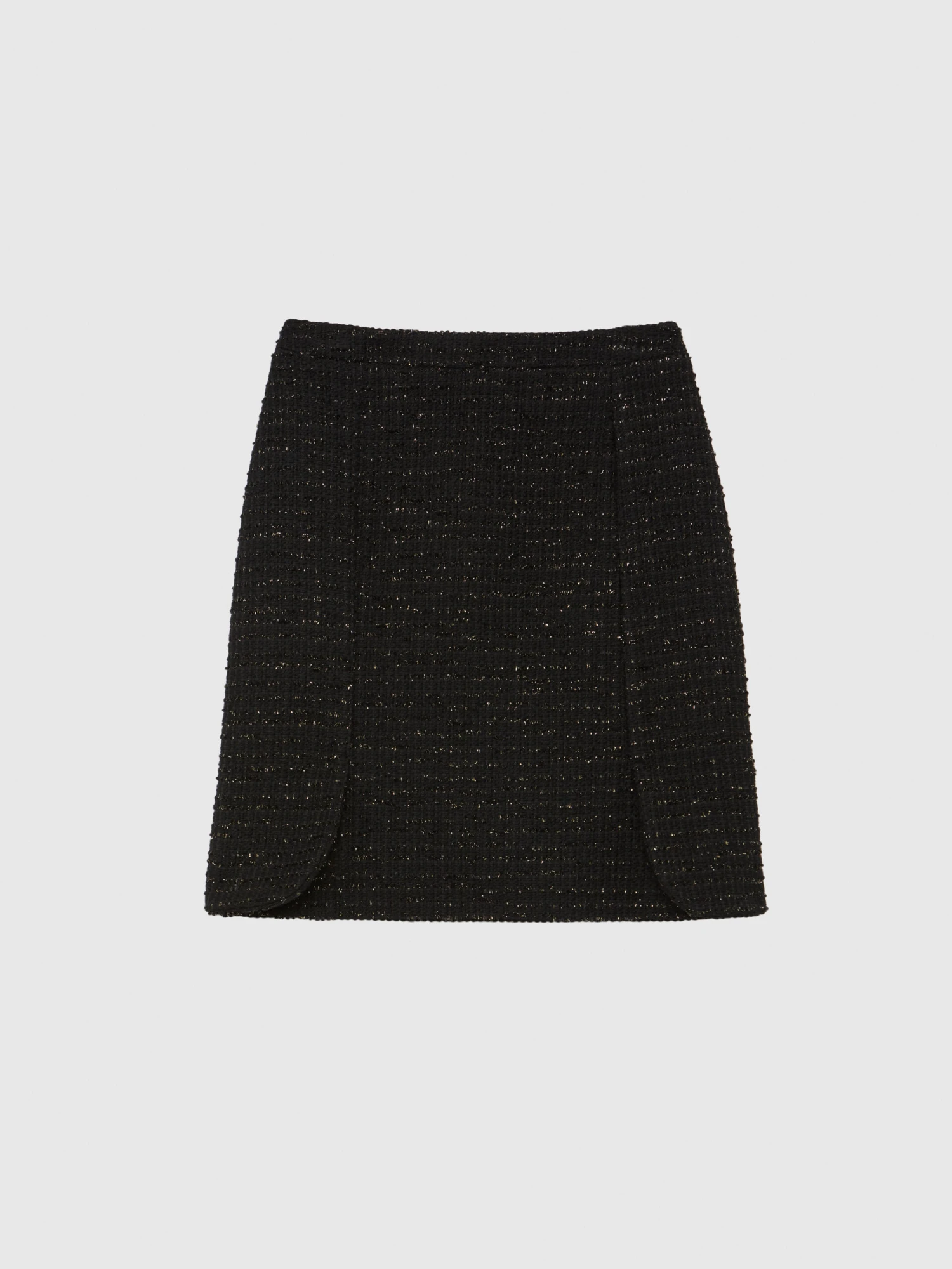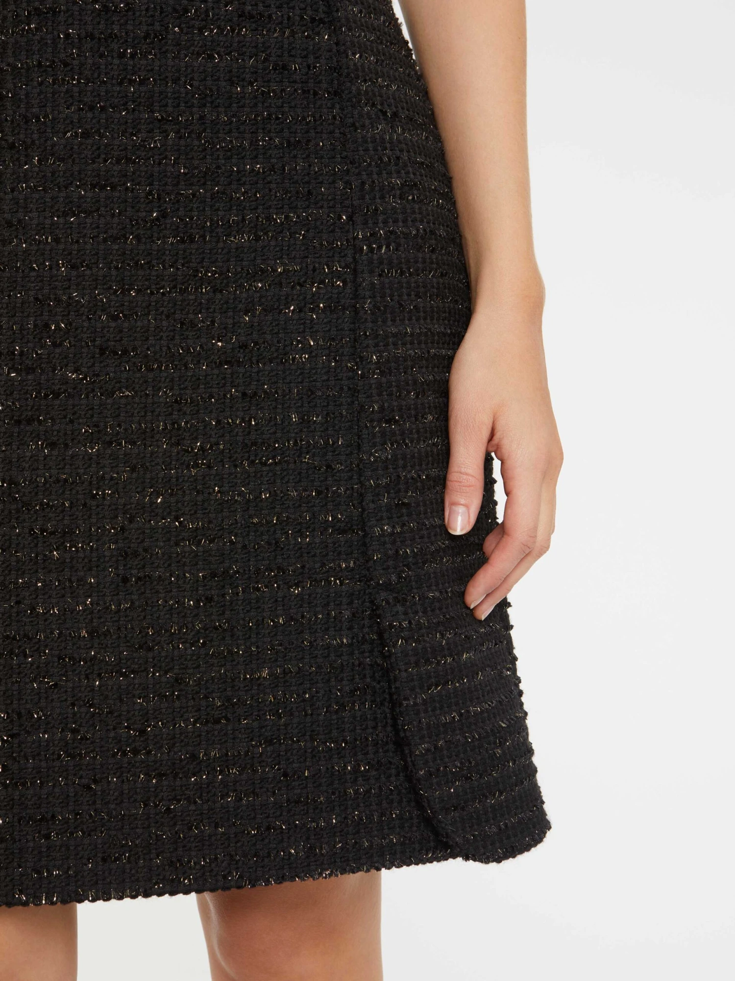 La mini-jupe trapèze est confectionnée en tweed lurex. Une marque d’élégance inspirée des pièces couture et résolument tendance au retour de l’automne. Originale et féminine, la jupe se porte taille haute. Doté de fentes arrondies, le bas du vêtement semble s’ouvrir comme la corolle d’une tulipe. Fermeture éclaire invisible au dos. Longueur : 55 cm.
