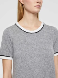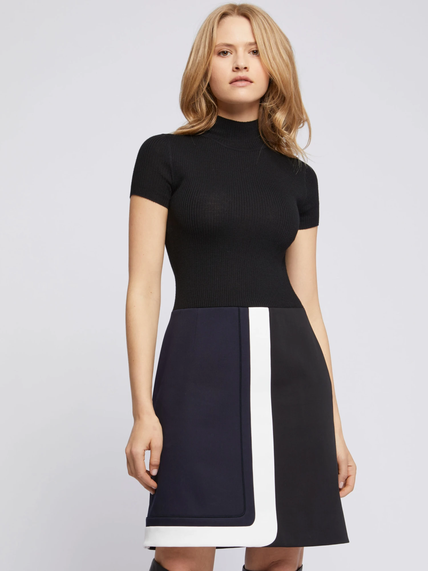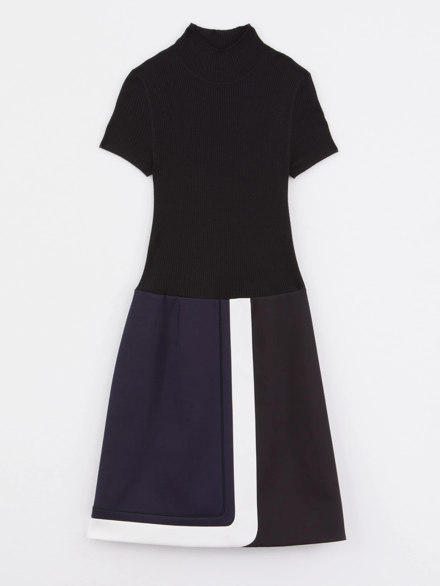La robe d’hiver est imaginée comme un trompe l’œil. Le haut est un petit pull col roulé à manches courtes confectionné en laine mérinos côtelé. Le bas, quant à lui, est une mini-jupe graphique en tricotine stretch. Le tout compose une jolie robe inspirée des sixties. La longueur à partir de la taille est de 55 cm.