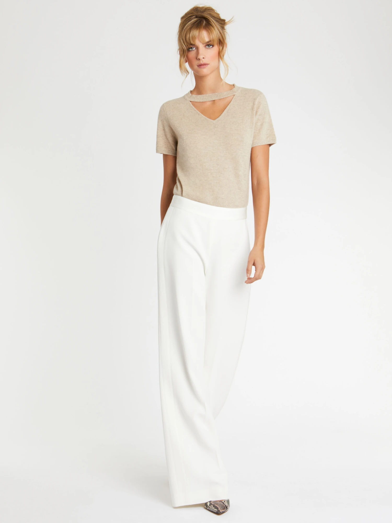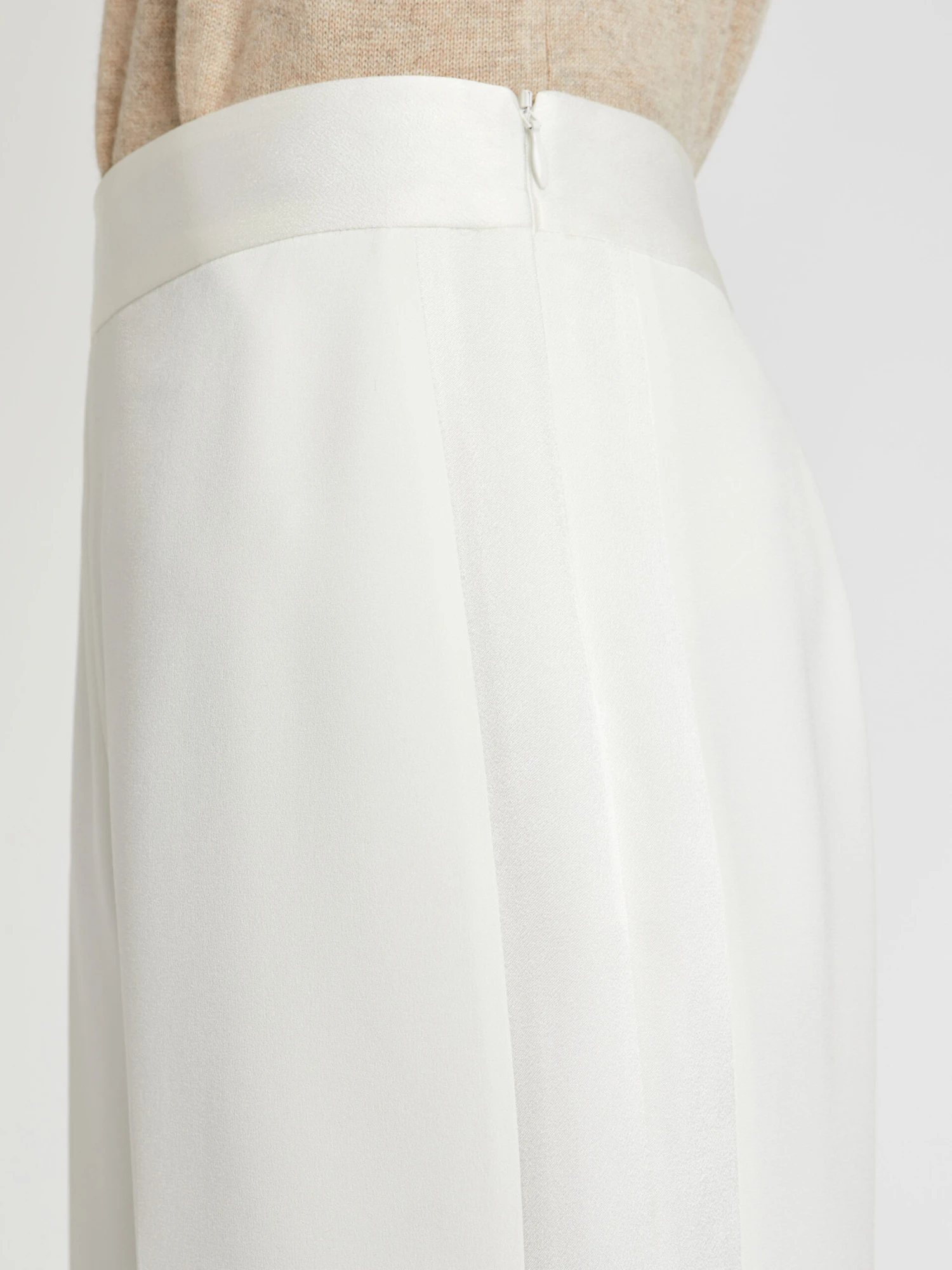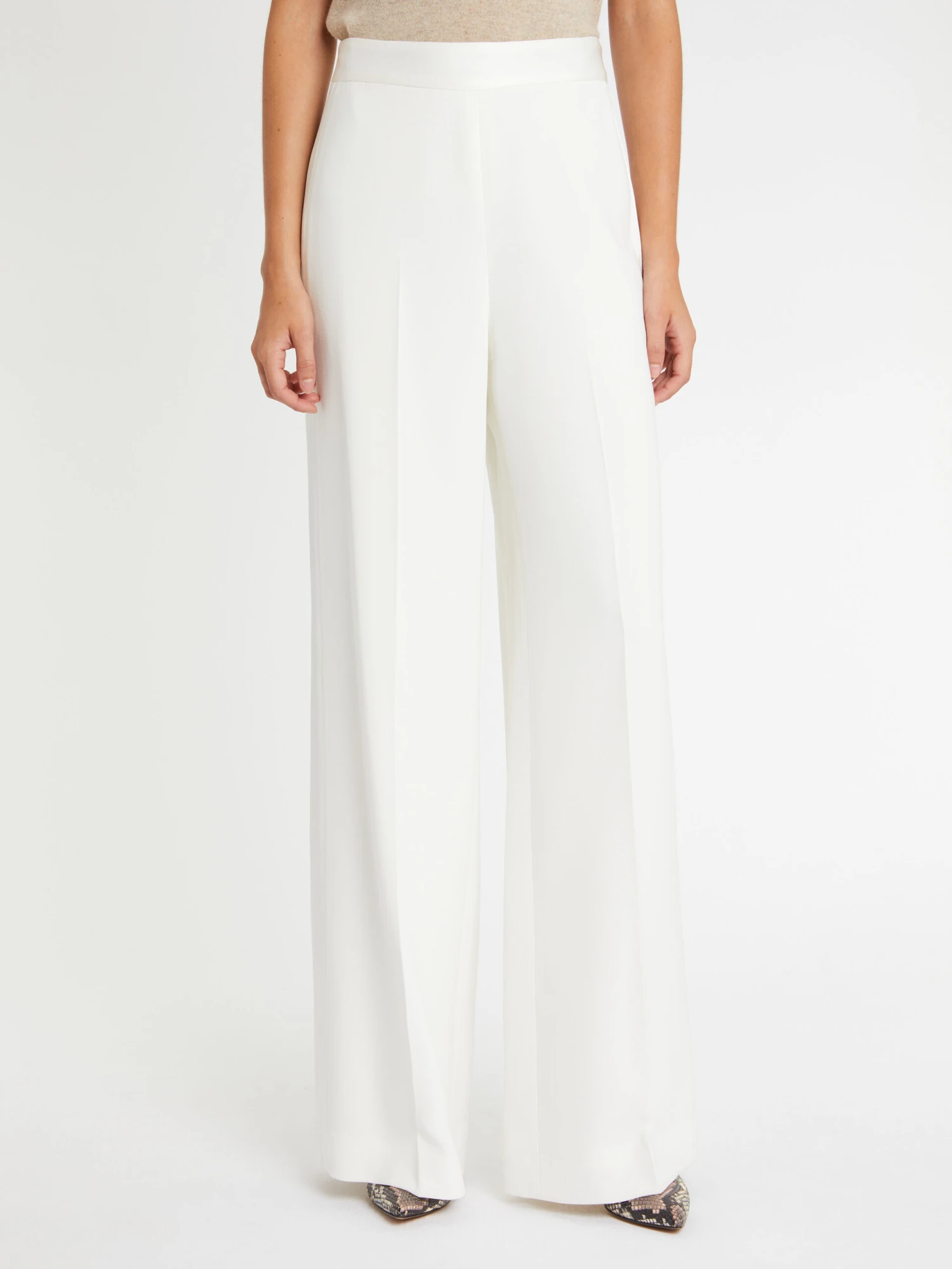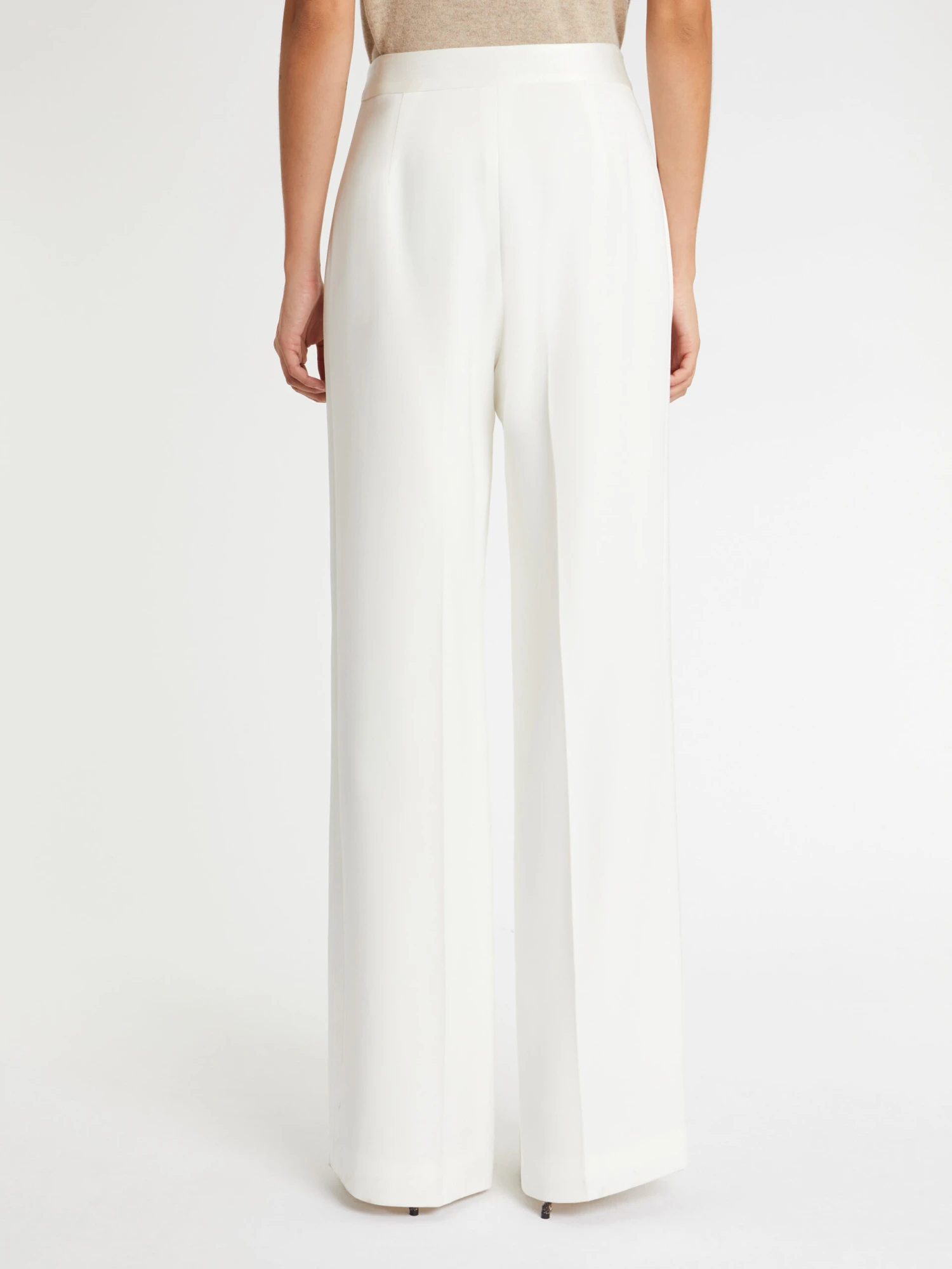 Le pantalon ample et fluide est réalisé dans une coupe épurée sans poche ni bouton de fermeture. Essentiel du vestiaire de cérémonie, ce pantalon en crêpe envers satin affiche le côté mat du tissu. Au niveau de la ceinture plate et sous forme de bandes côté le long de la jambe, le satin brillant sublime le modèle d’une note chic et glamour. Fermeture éclair côté invisible.