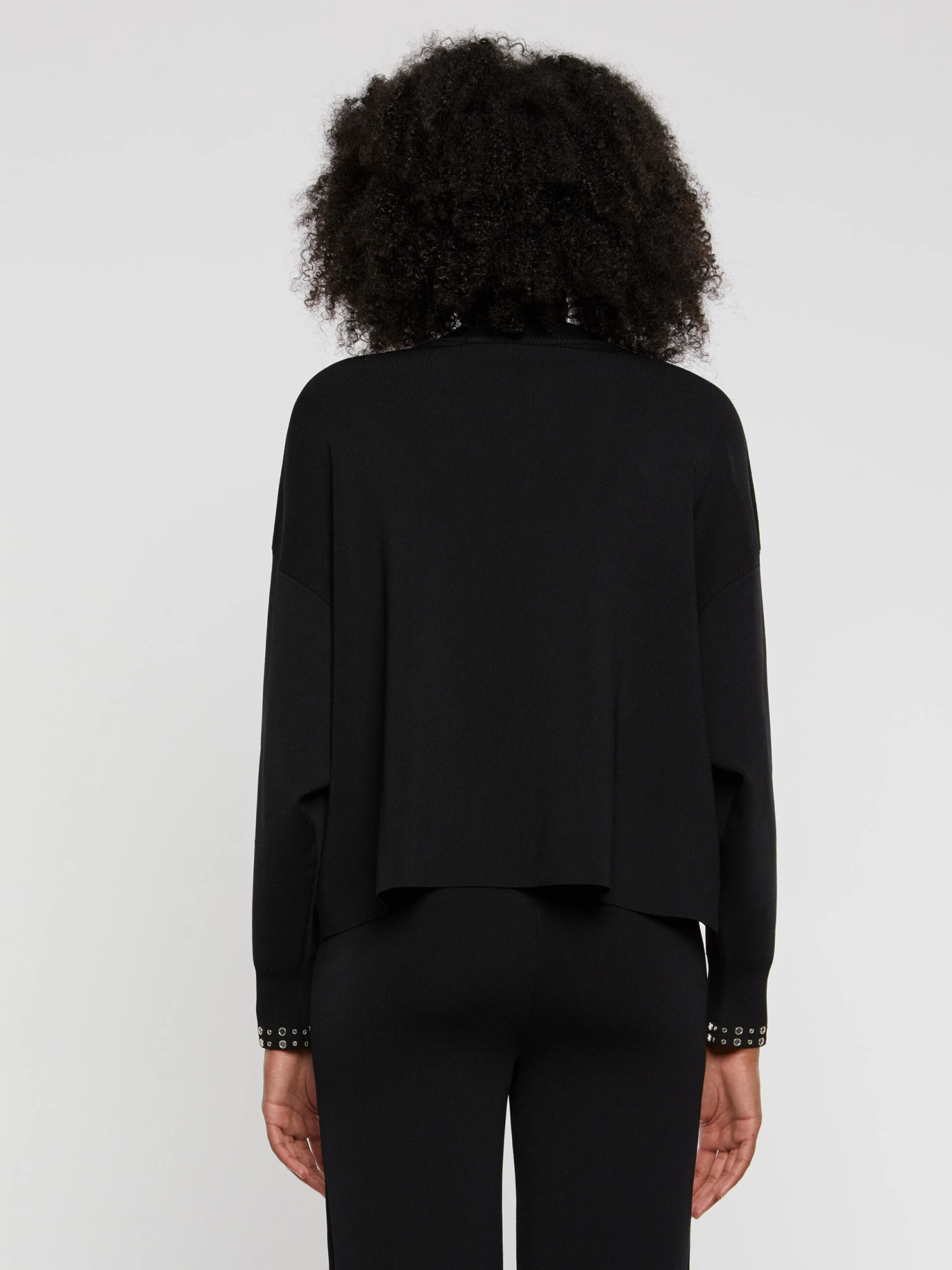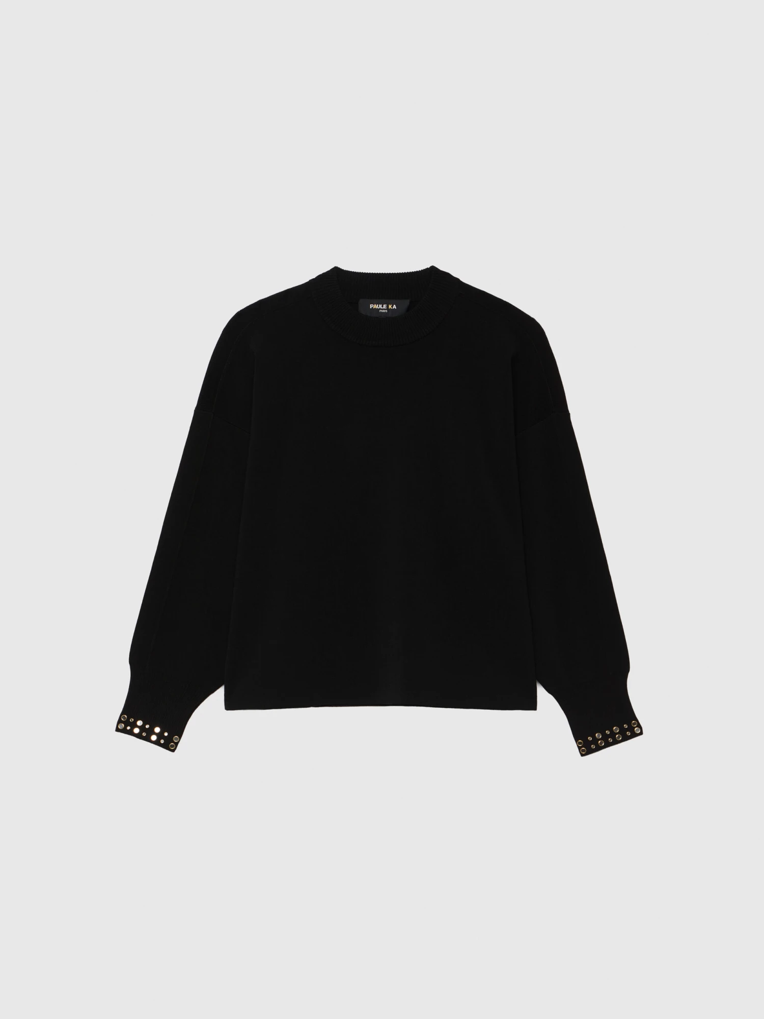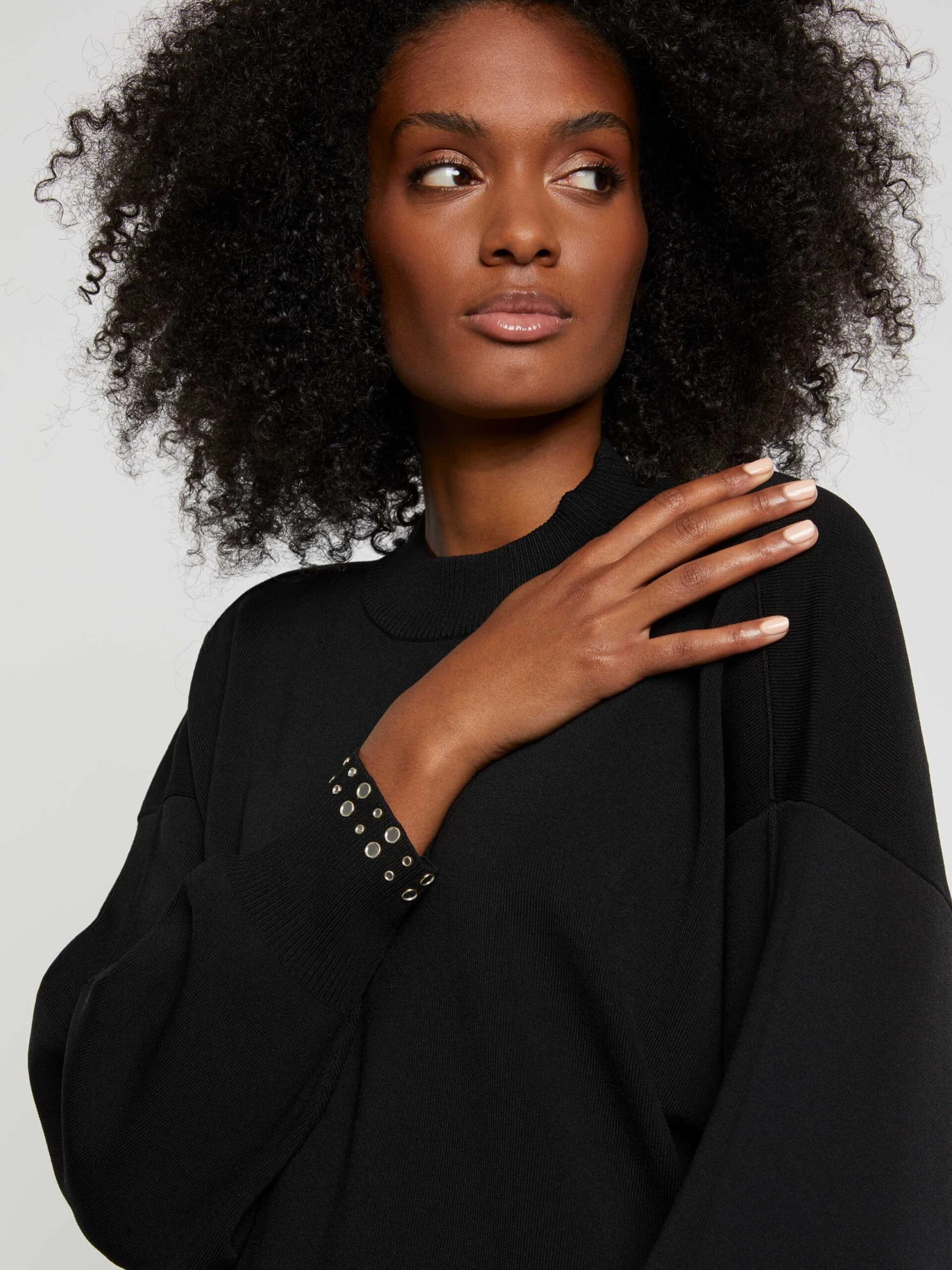 Le pull printanier est un joli mĂ©lange de styles. DotĂ© d’un col ras de cou, de poignets bords-cĂ´tes et d’emmanchures dĂ©portĂ©es, le modèle aux inspirations sportswear sophistique son allure en arborant une maile Milano structurĂ©e et des bijoux studs en bas de manches. C’est le modèle sport chic par excellence.