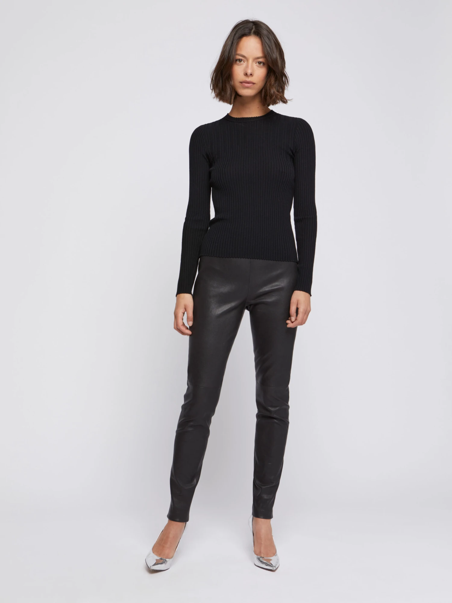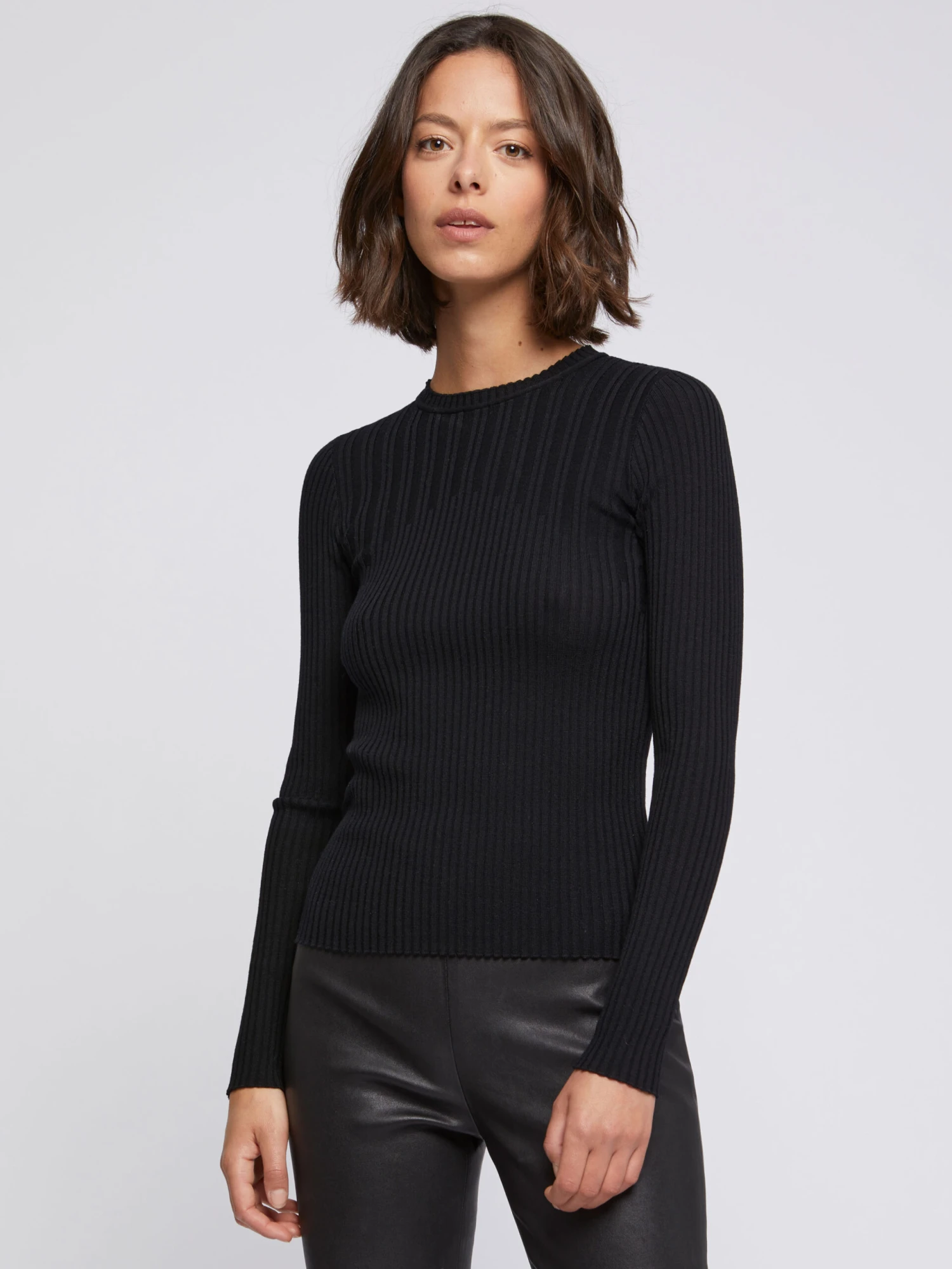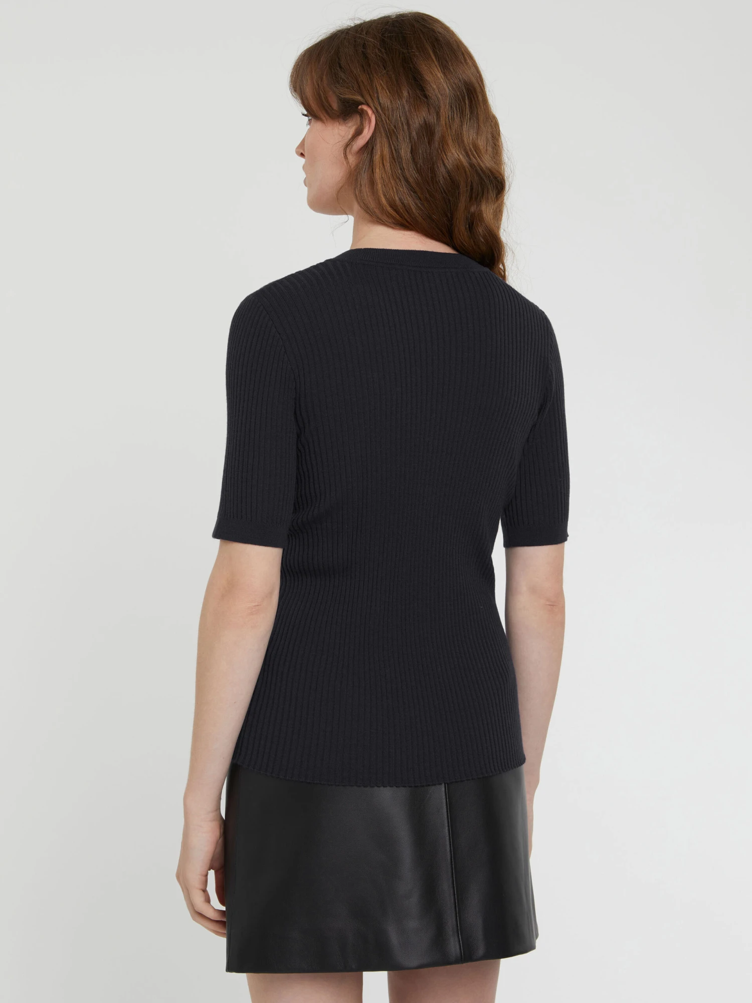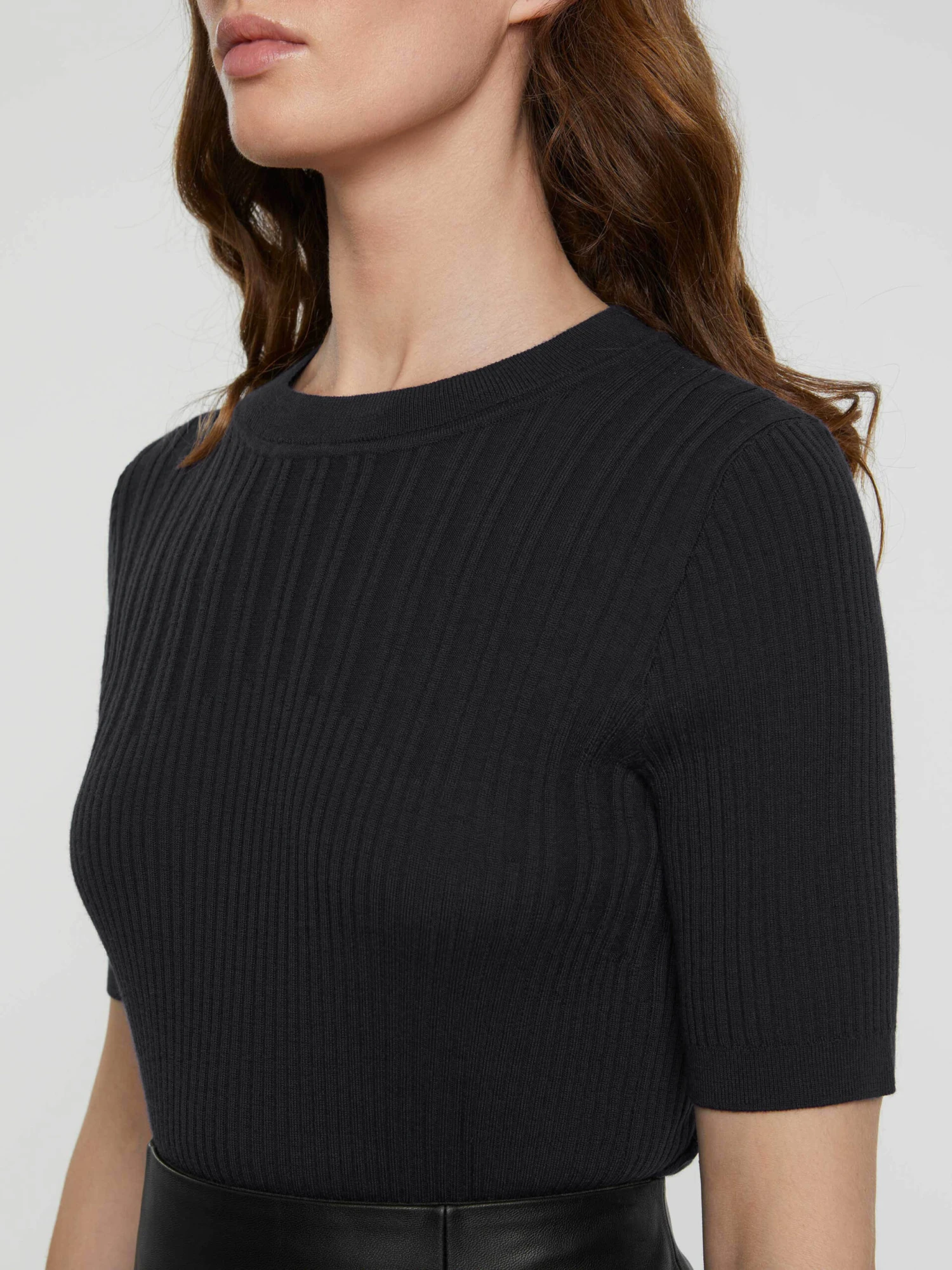Le pull manches courtes en laine mérinos est confectionné en maille côtelée. Le jeu de côtes resserrées dans le bas du vêtement ajuste le modèle près du corps. Il est doté d’un col rond et sans bords-côtes.