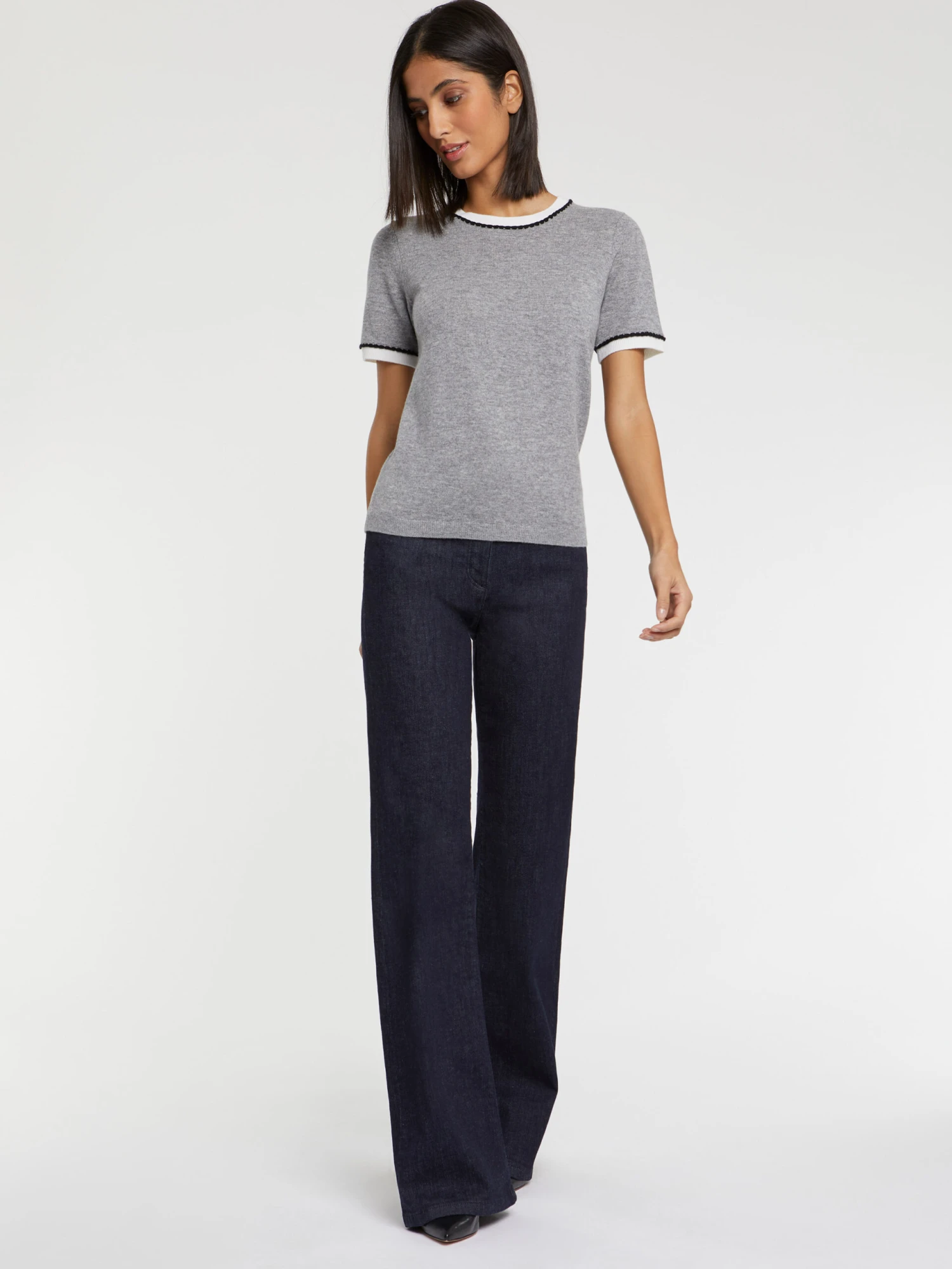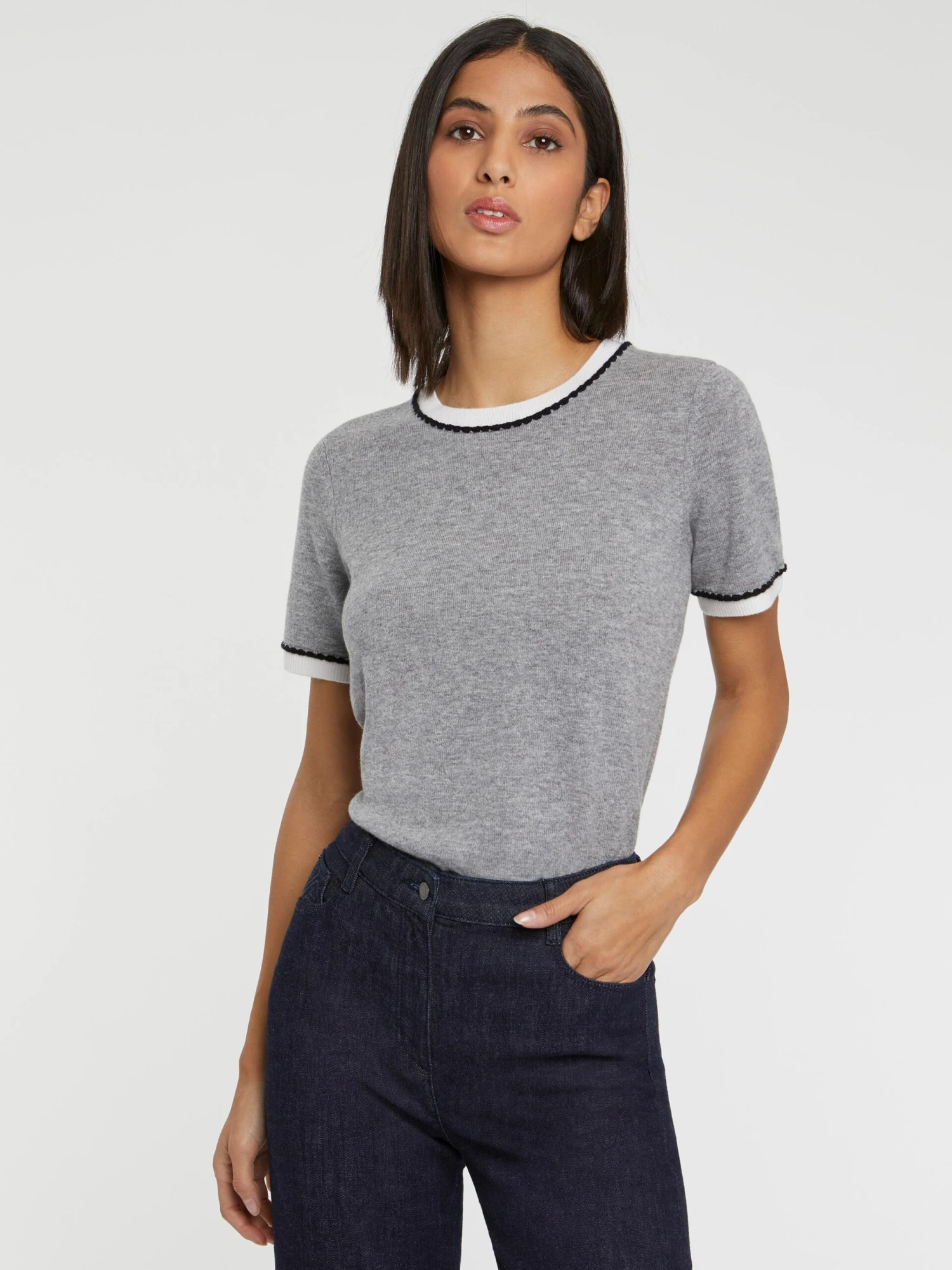Le pull en laine et cachemire fin prend forme dans une coupe manches courtes à col rond. L’encolure et les bas de manches sont soulignés de bords-côtés et de festons contrastés. Un détail ravissant qui apporte une note preppy à votre style. Un petit trésor du vestiaire BCBG.