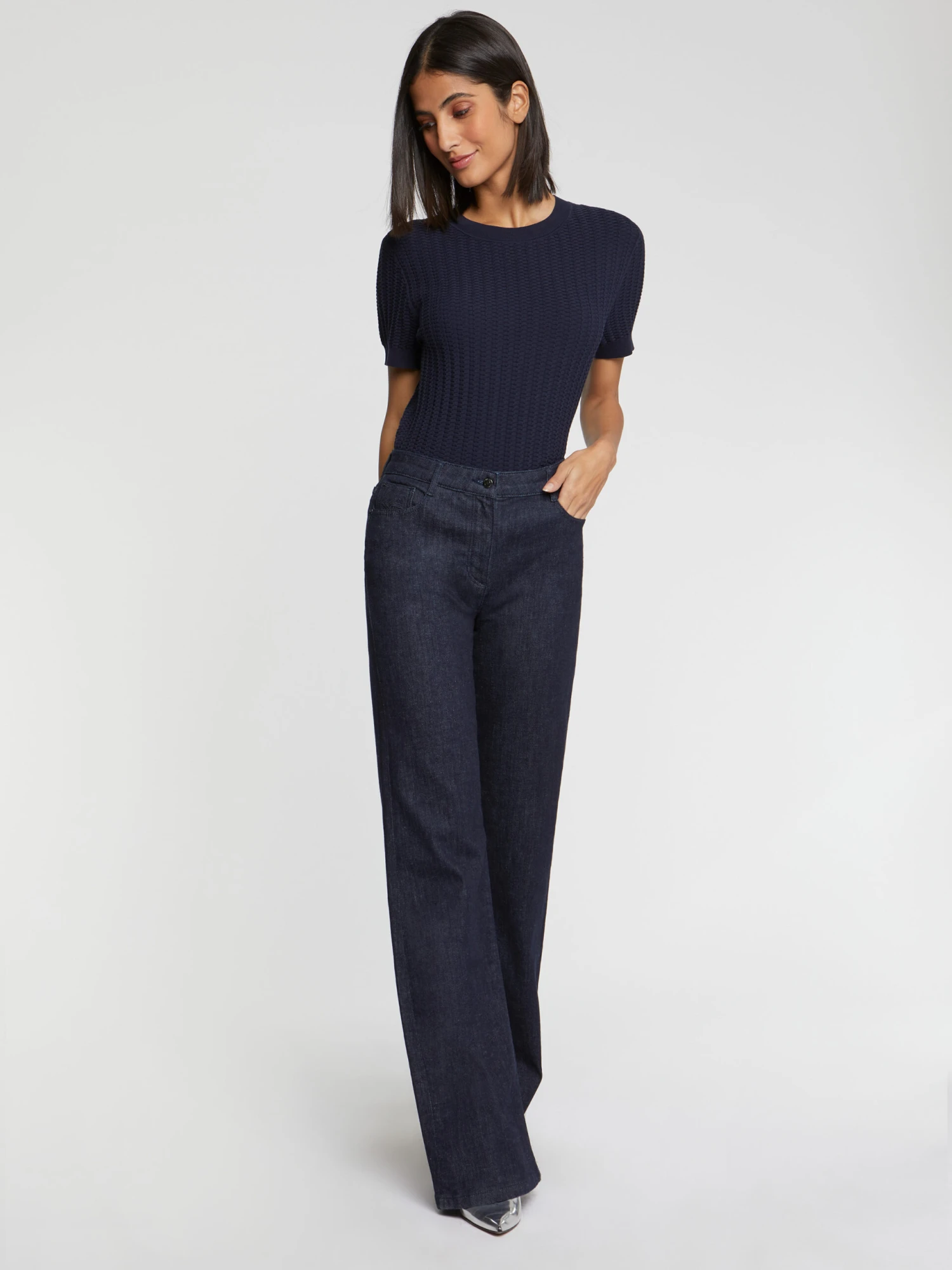 Le pull mi-saison est confectionné dans un mélange de soie et de coton qui vous enveloppe de douceur. Sa coupe manches courtes à col rond est complexifiée par le point fantaisie qui donne du relief au vêtement. Des bords-côtes structurent le modèle dans une look légèrement sportchic.