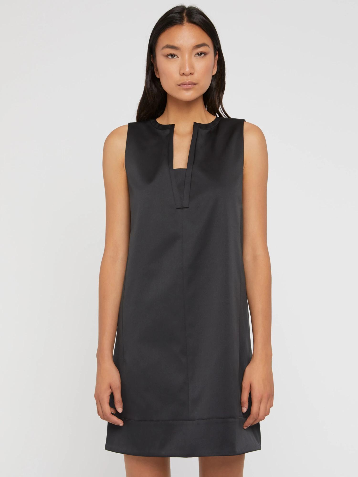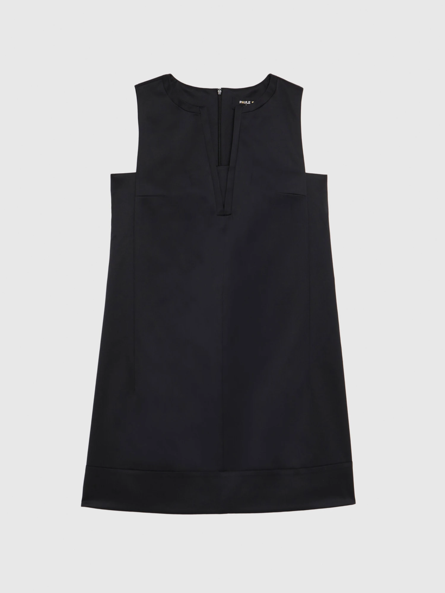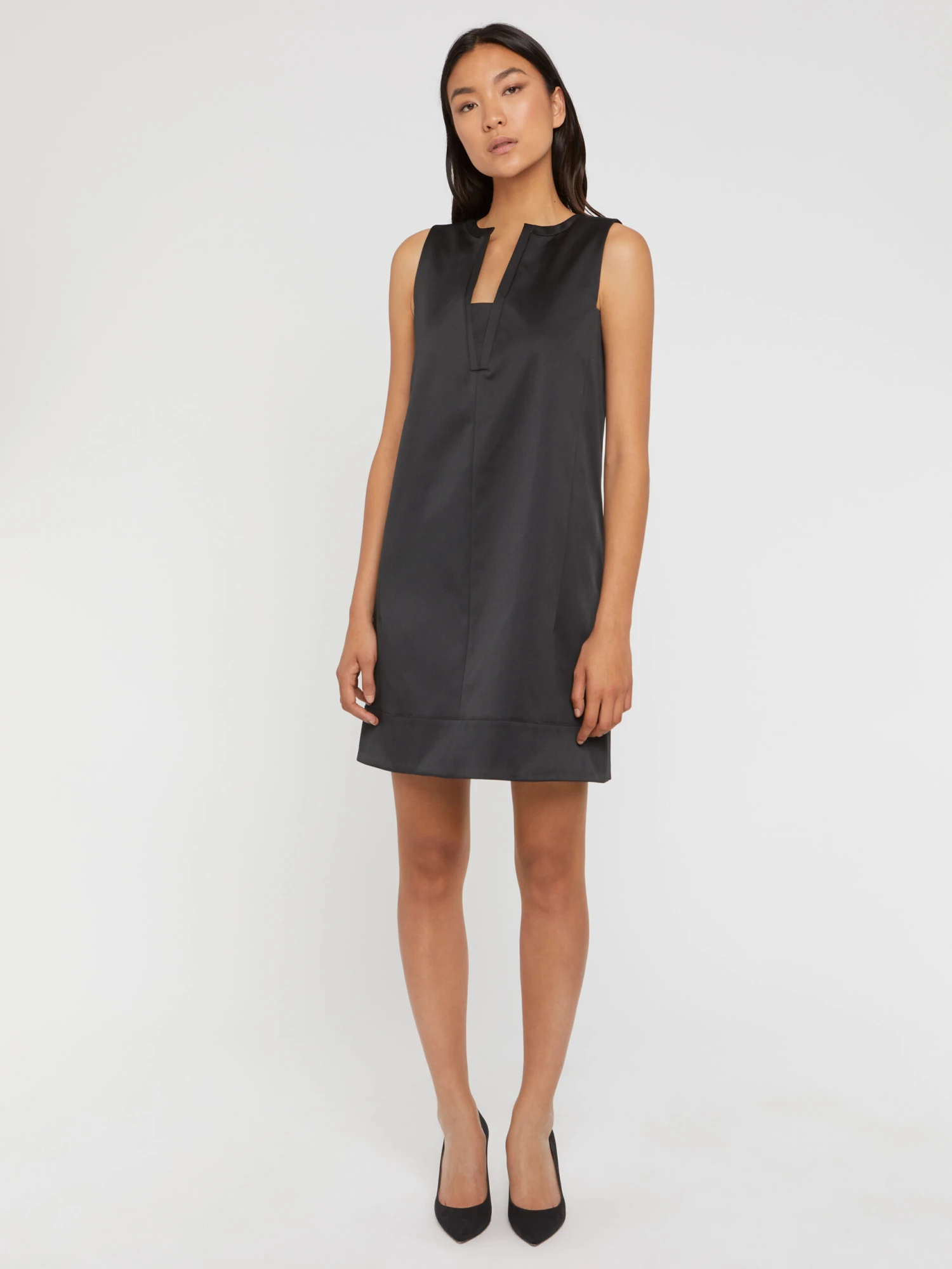 La robe courte sans manches coupe trapèze arbore un décolleté graphique qui caractérise le modèle couture. La confection en satin duchesse doux et brillant apporte une note chic et élégante au modèle. Idéal pour être élégante en toute simplicité. Fermeture éclair invisible au dos. La longueur de la robe à partir de la taille est de 50 cm.