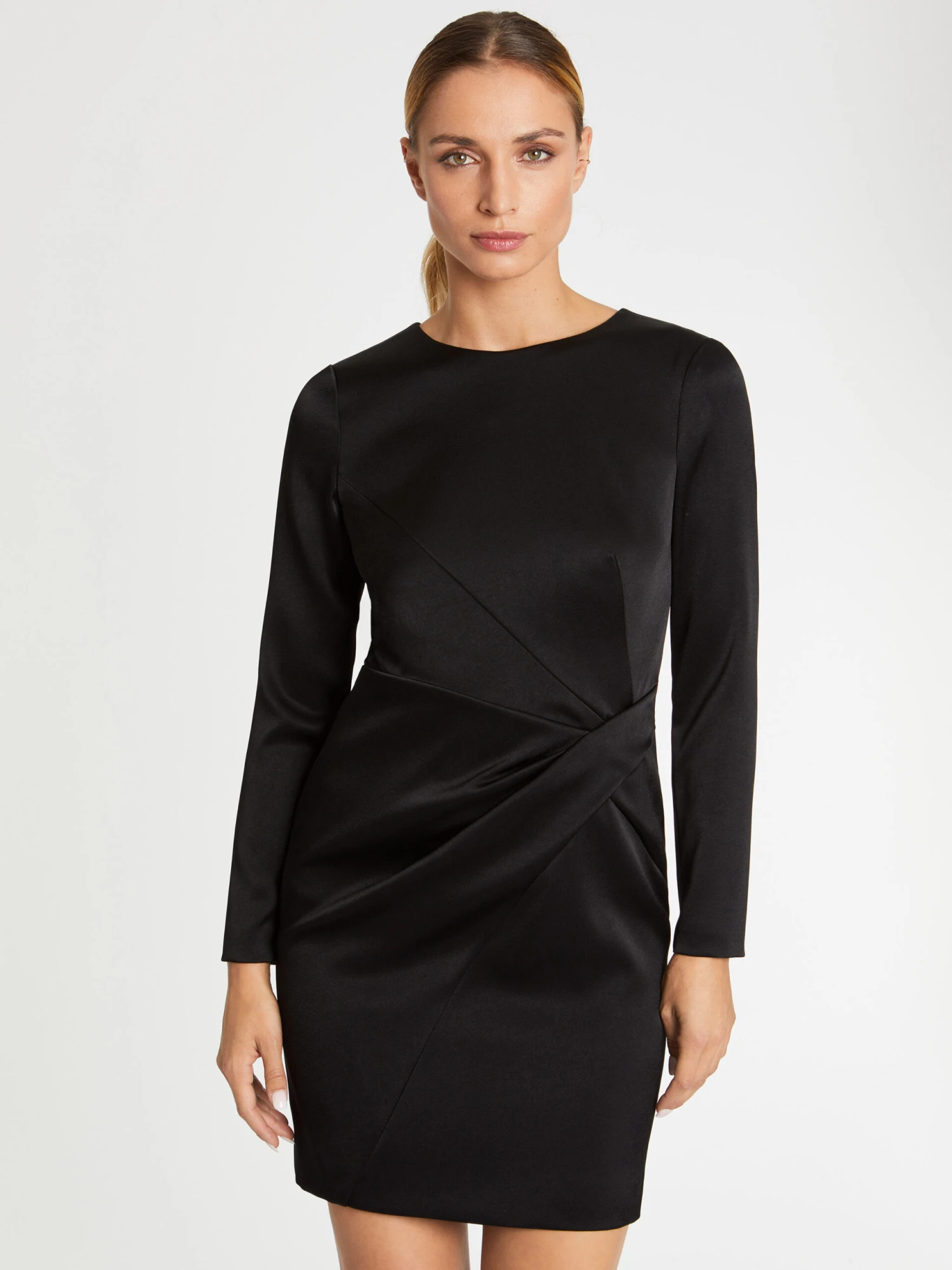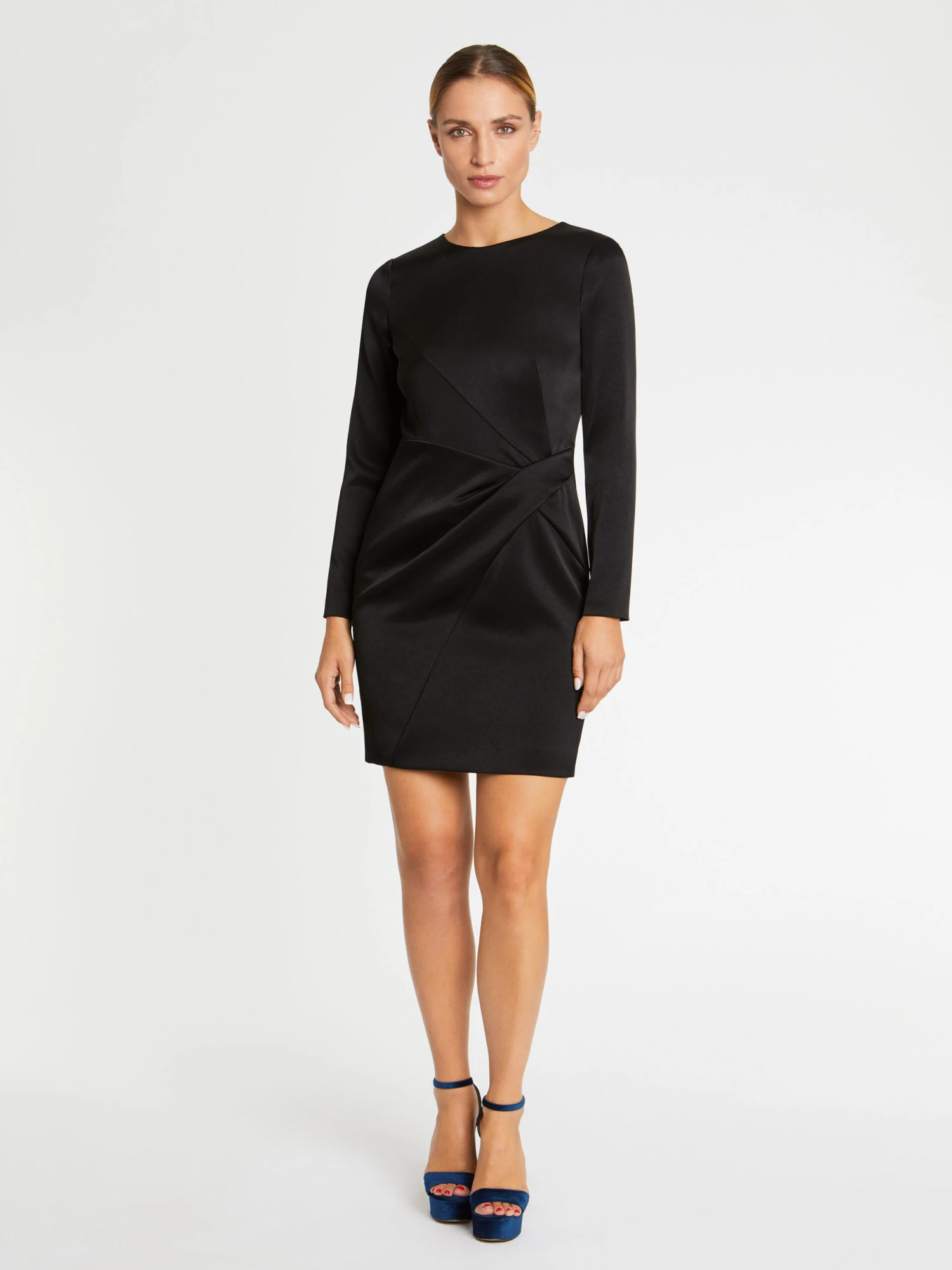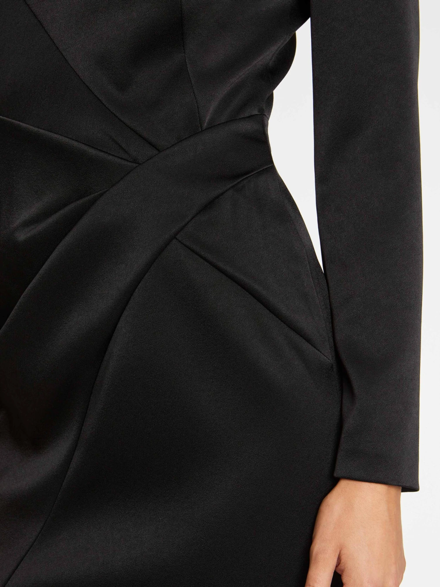 La robe courte en crêpe de satin se dessine sur l’envers mat du tissu. Le vêtement près du corps à manches longues est galvanisé par des empiècements de satin brillant dont le graphisme croisé sur la hanche apporte une identité visuelle forte au modèle. Fermeture éclair invisible dans le dos. Longueur de la robe à partir de la taille : 50 cm.