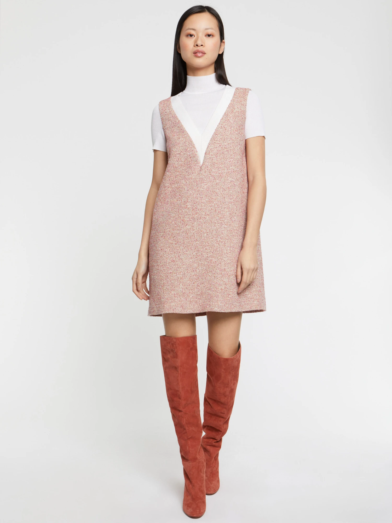 La robe courte trapèze est confectionné en tweed, idéale pour la saison froide. Ici, le modèle inédit prend forme dans une coupe trompe l’œil où la robe sans bretelles à col V est portée sur un sous-pull à manches courtes col roulé en maille côtelée. Vous appréciez le caractère sage et rétro du modèle. Le vêtement se ferme dans le dos par une fermeture éclair invisible. Longueur de la robe à partir de la taille : 55 cm.