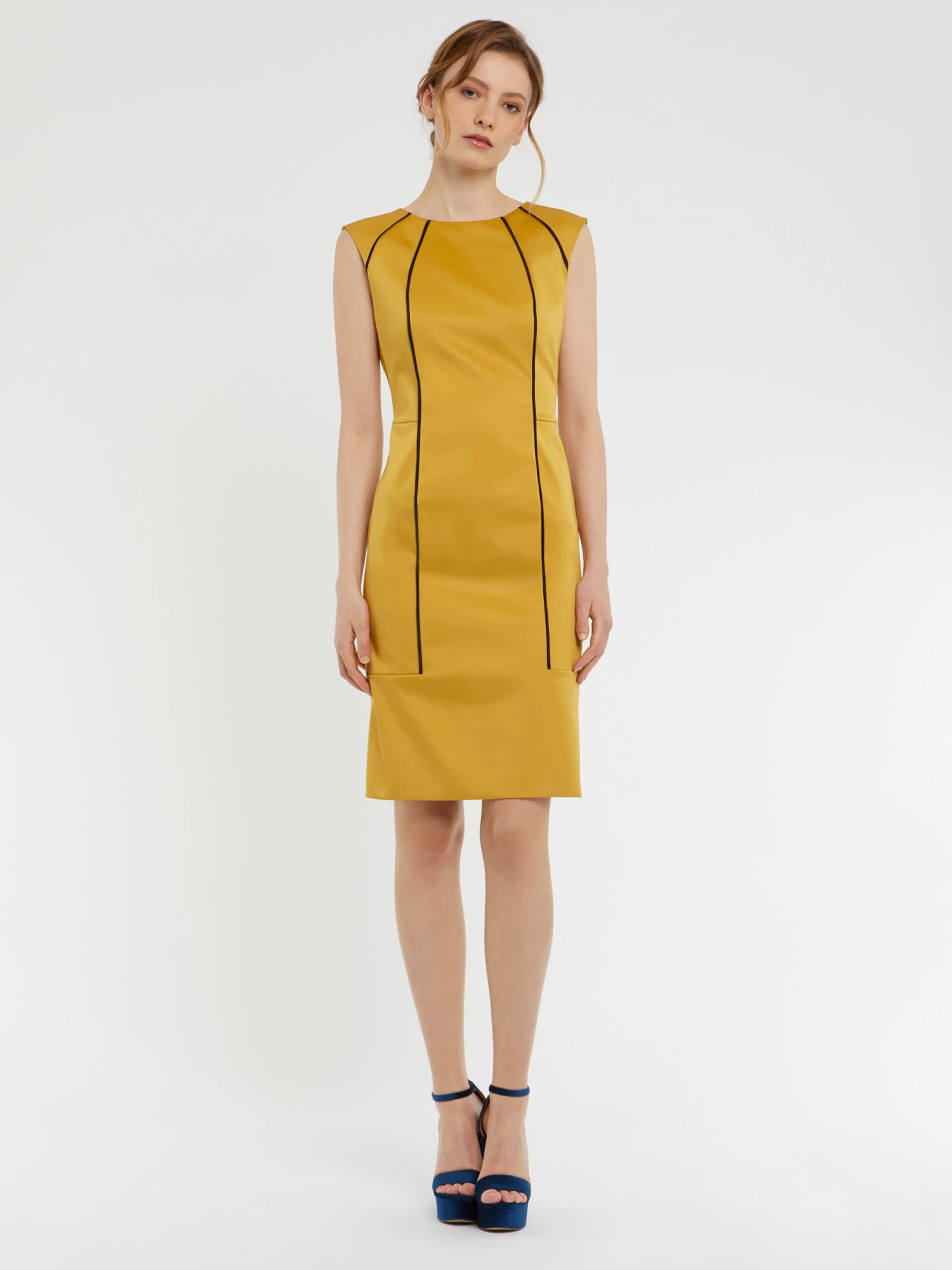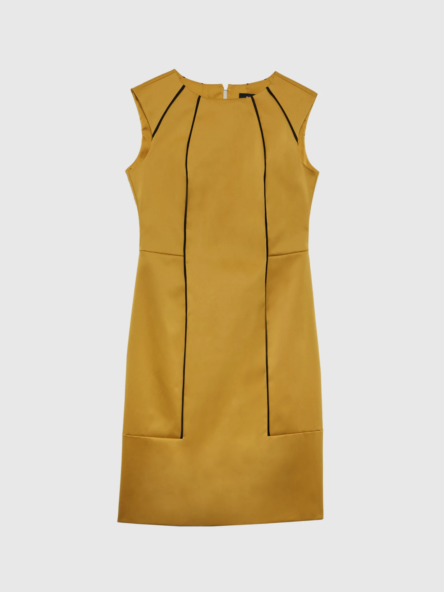 La robe droite courte en satin duchesse est naturellement brillante et élégante. Elle est sans manches, structurée par un col rond et se porte près du corps. Un jeu de coutures et passepoils contrastés apporte un côté graphique chic au modèle. Une pièce ultra féminine que vous sublimerez d’une paire d’escarpins. Fermeture éclair invisible dans le dos. Longueur de la robe à partir de la taille : 60 cm.