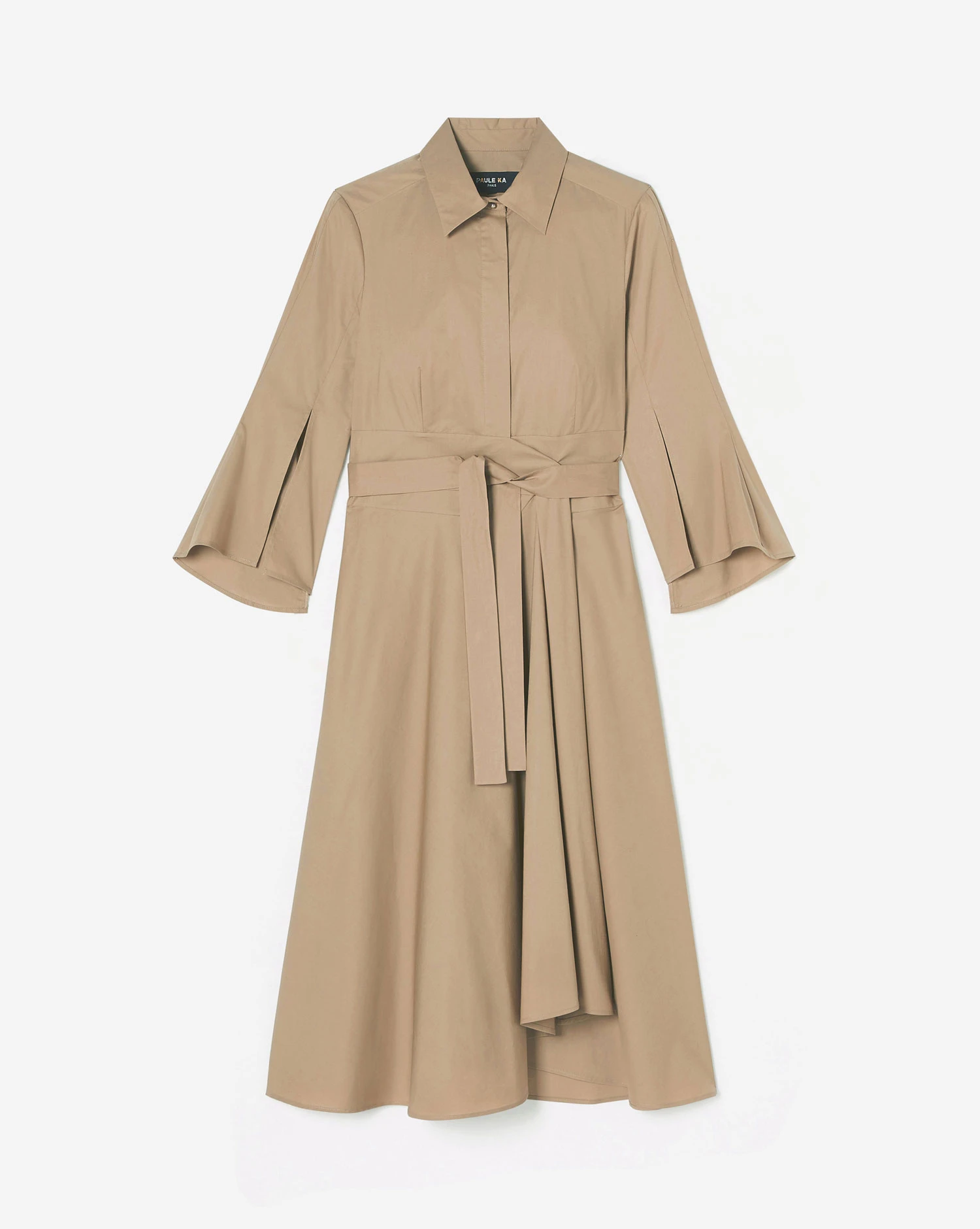 Robe mi-longue en popeline de coton, cintrée et nouée à la taille, munie d’un col rond classique et de manches 3/4 évasées. Sa longueur à partir de la taille est de 70 cm. Le mannequin mesure 1,77 m et porte une taille 36.