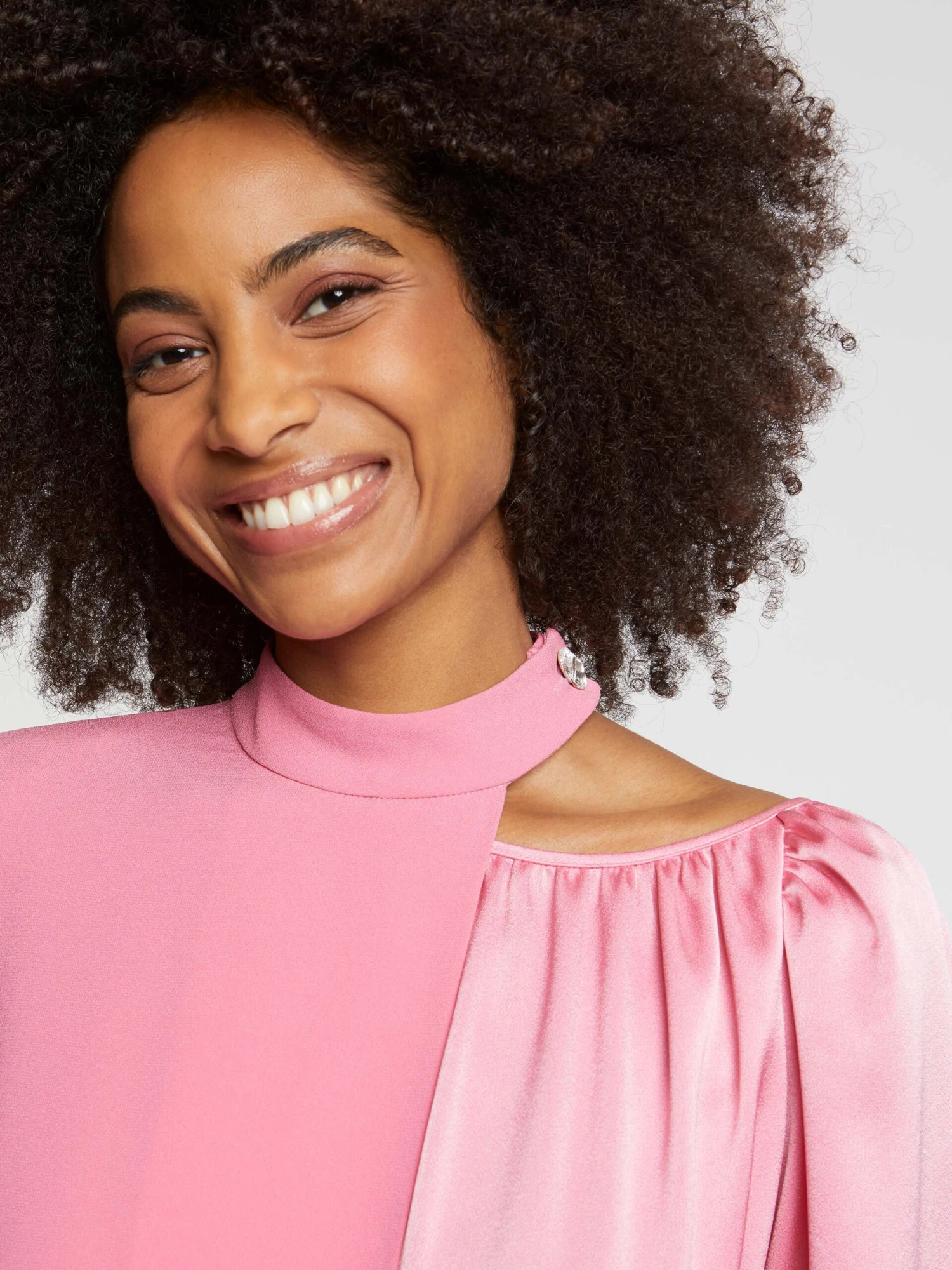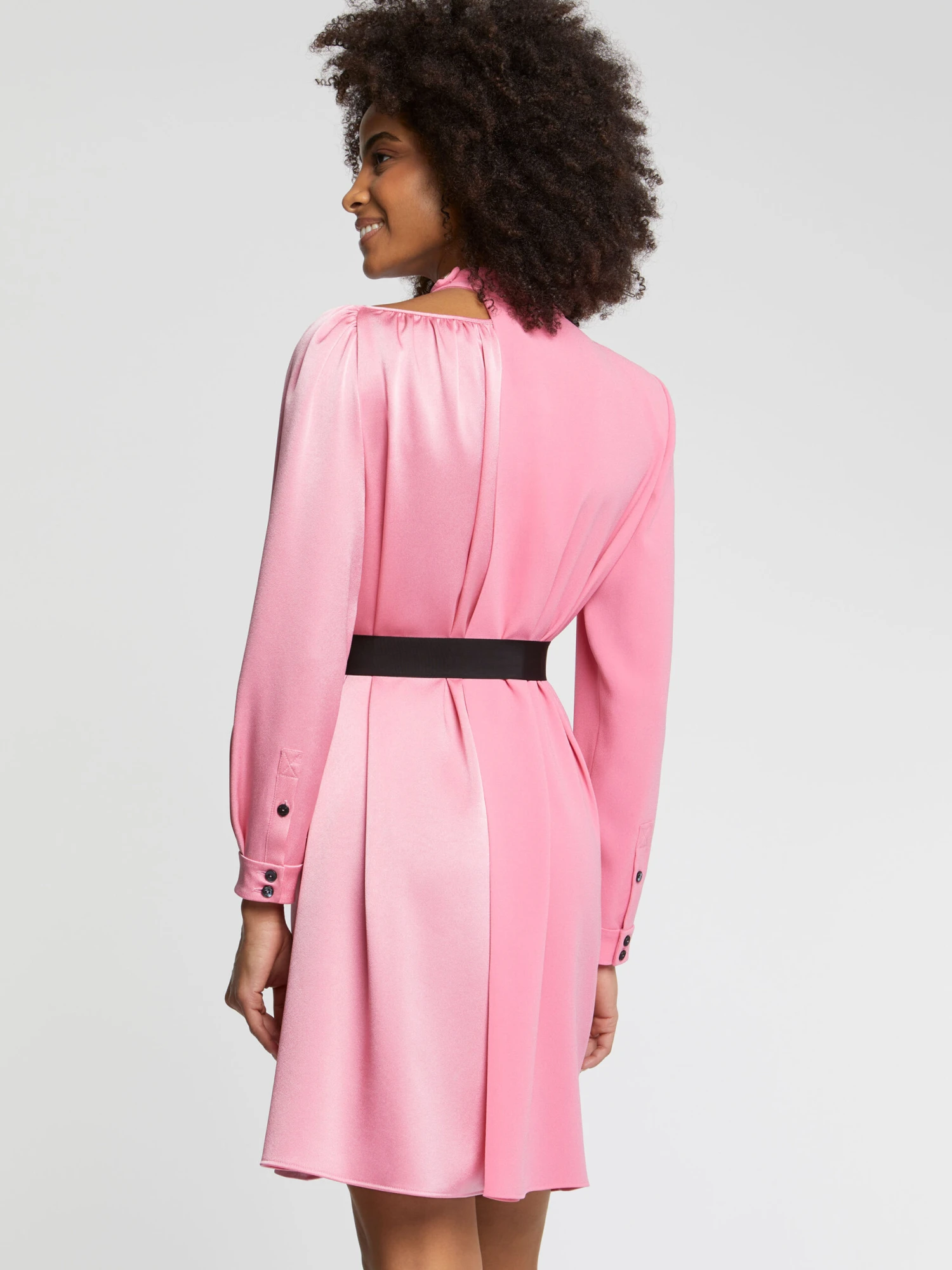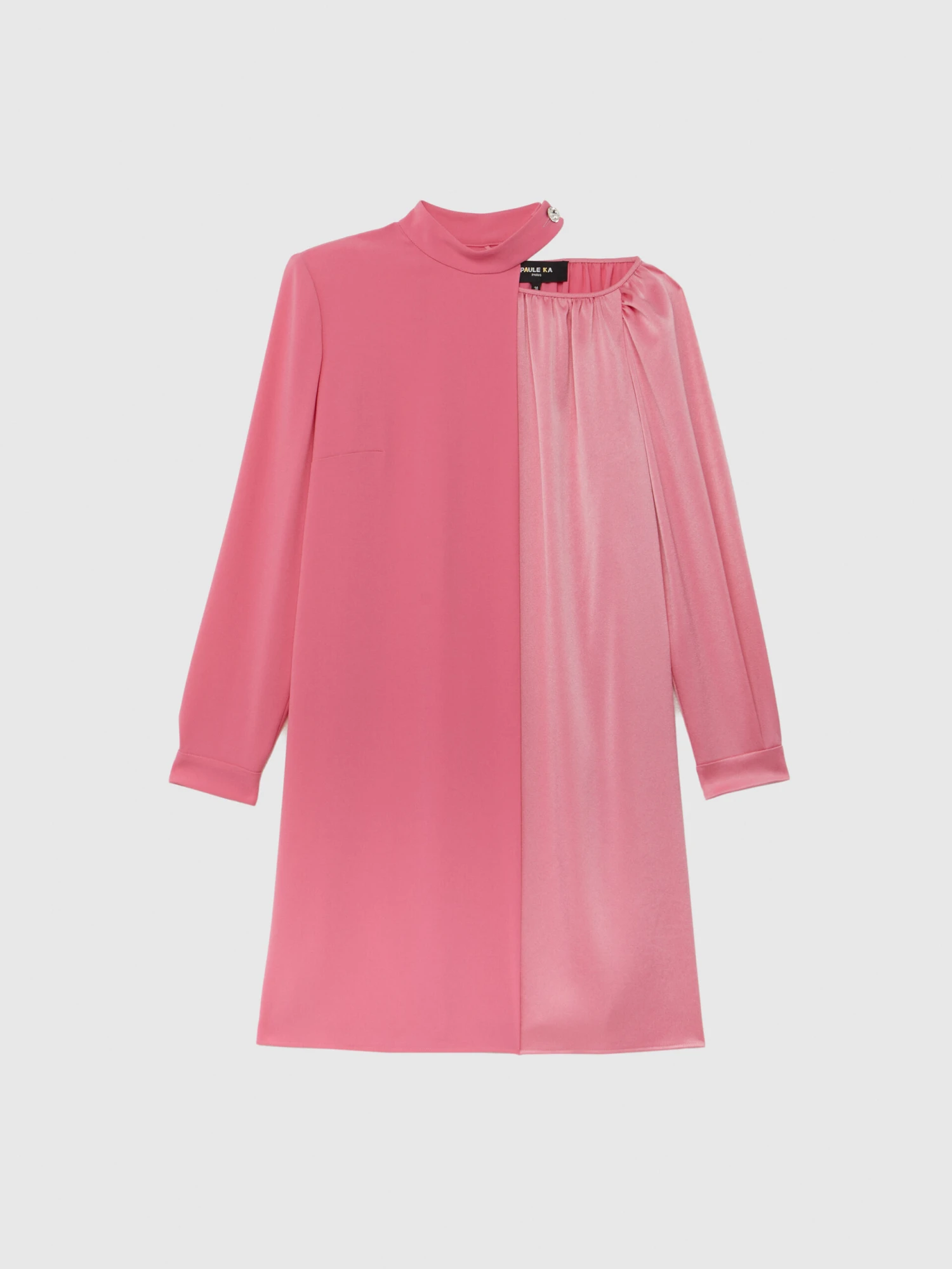 La robe courte en crêpe de satin prend forme dans une version originale. Un coté mat, un côté brillant ; un coté structuré, un coté fluide, elle joue le positif et le négatif de la matière. Le col montant boutonné dévoile subtilement votre clavicule. Ceinture non incluse. Longueur de la robe à partir de la taille : 50 cm.