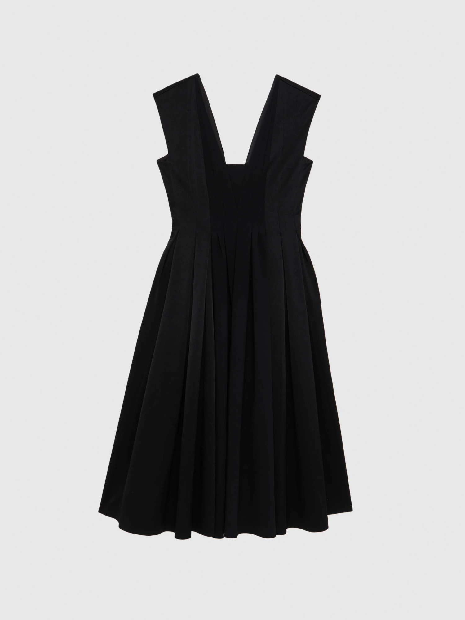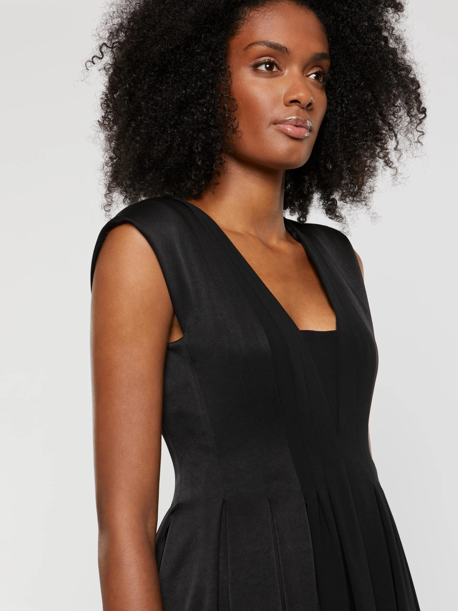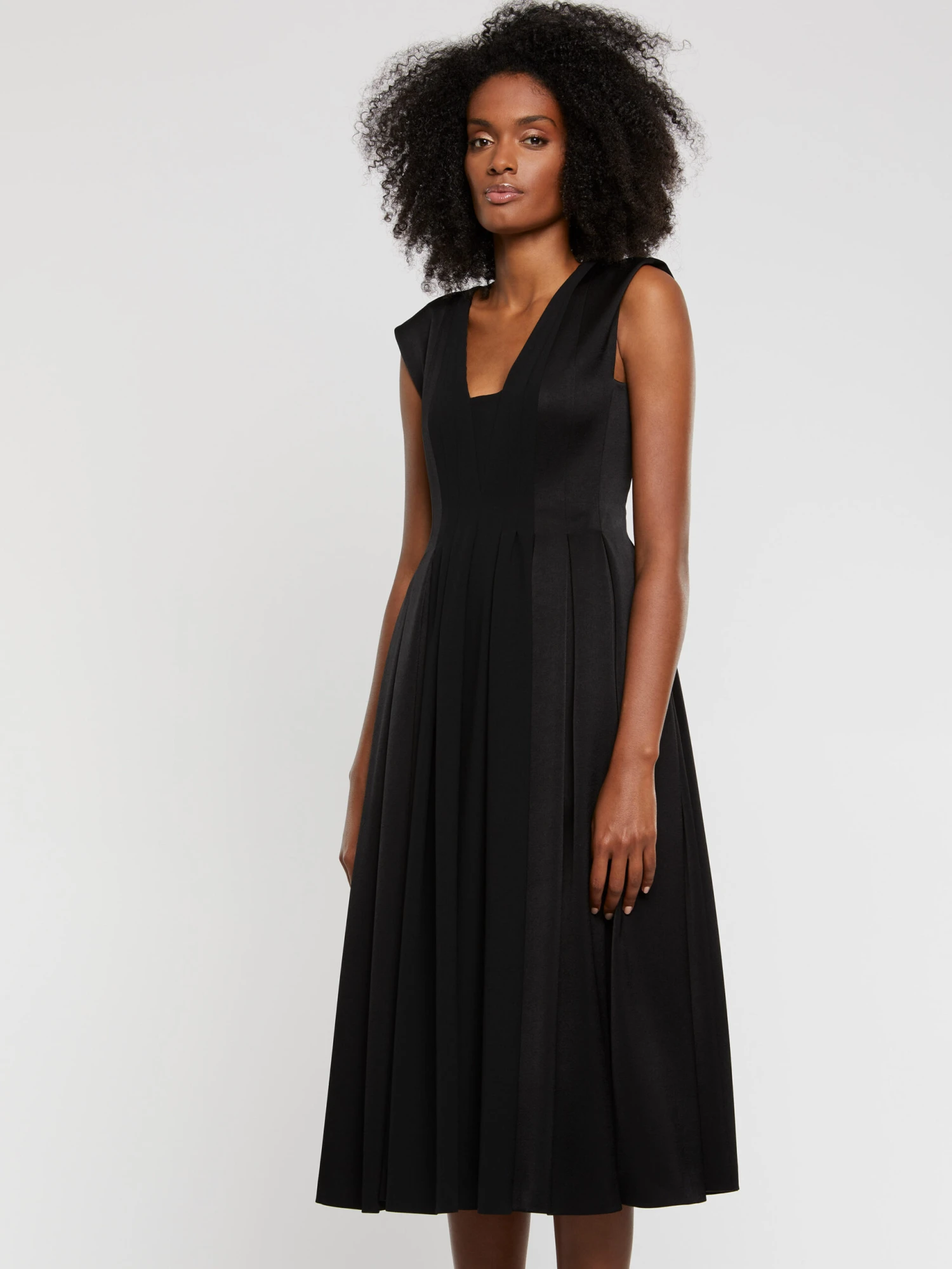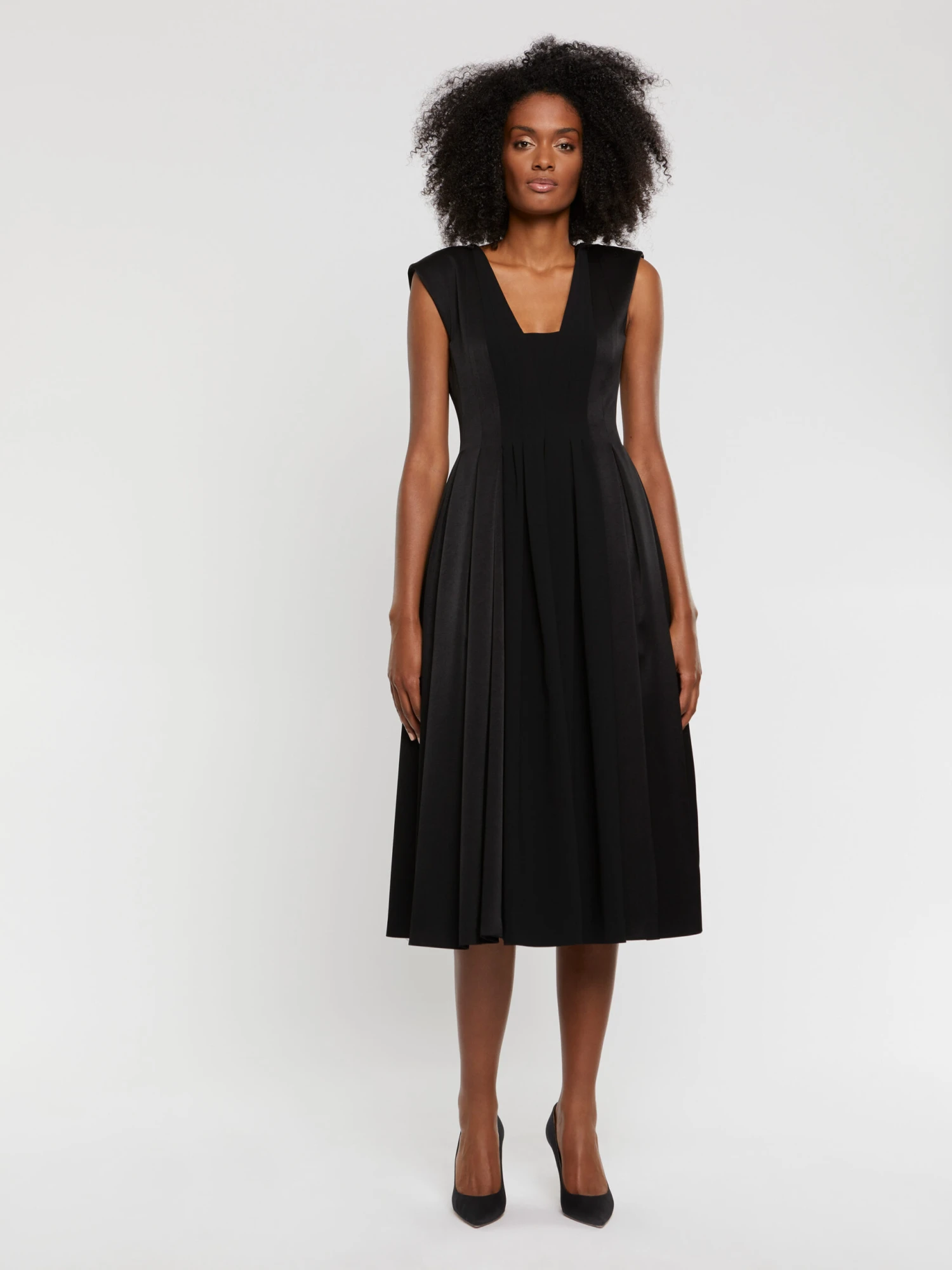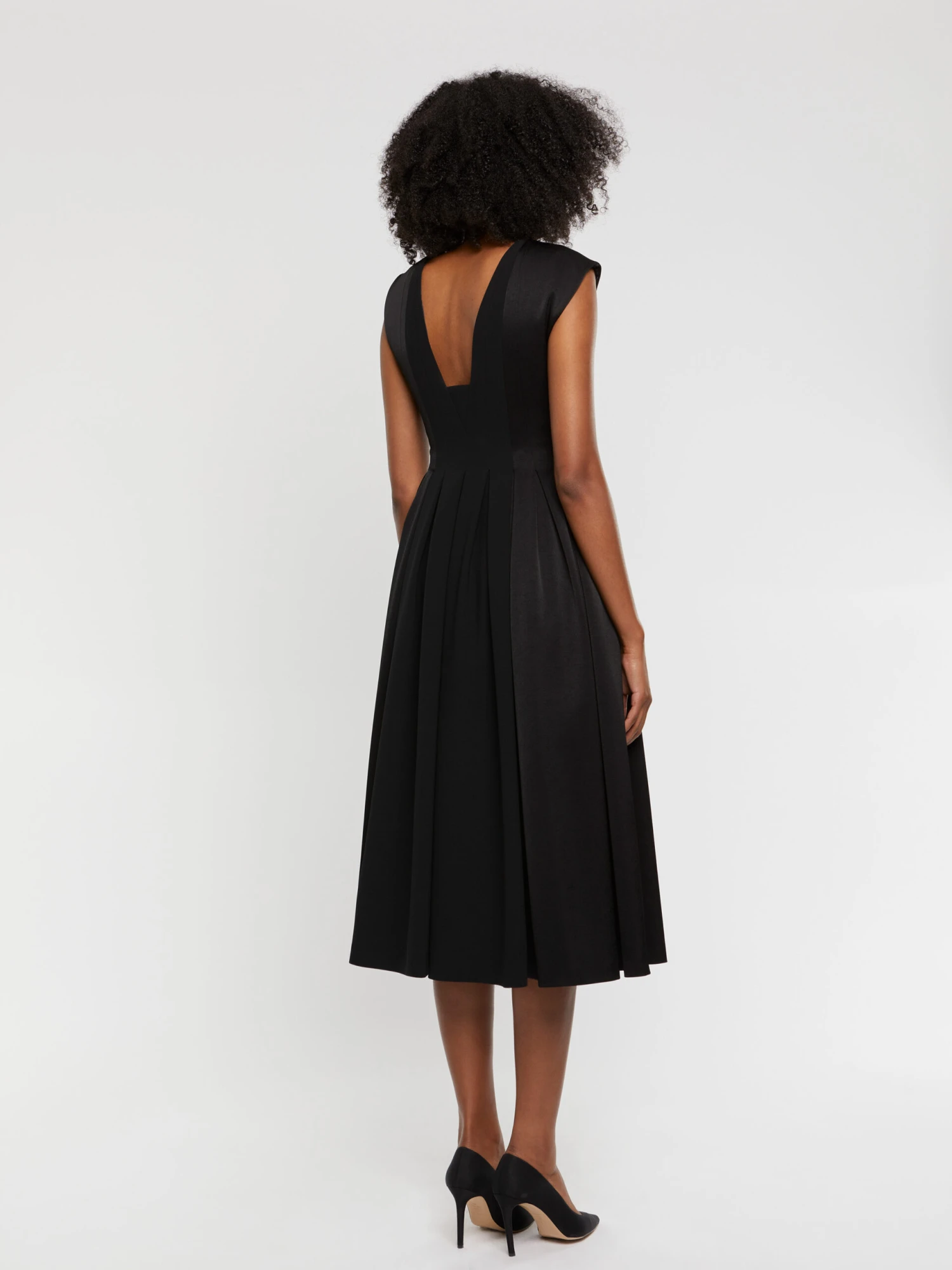 La robe de cérémonie arbore l’élégante longueur midi, idéalement portée avec une paire de talons hauts. La coupe sans manches est dotée d’un décolleté graphique devant et dos. Elle est cintrée taille haute et s’ouvre sur un jupon plissé volumineux et fluide. Le jeu de contraste entre le côté mat et brillant du tissu crêpe satiné apporte de la lumière au modèle. Longueur à partir de la taille 85 cm.