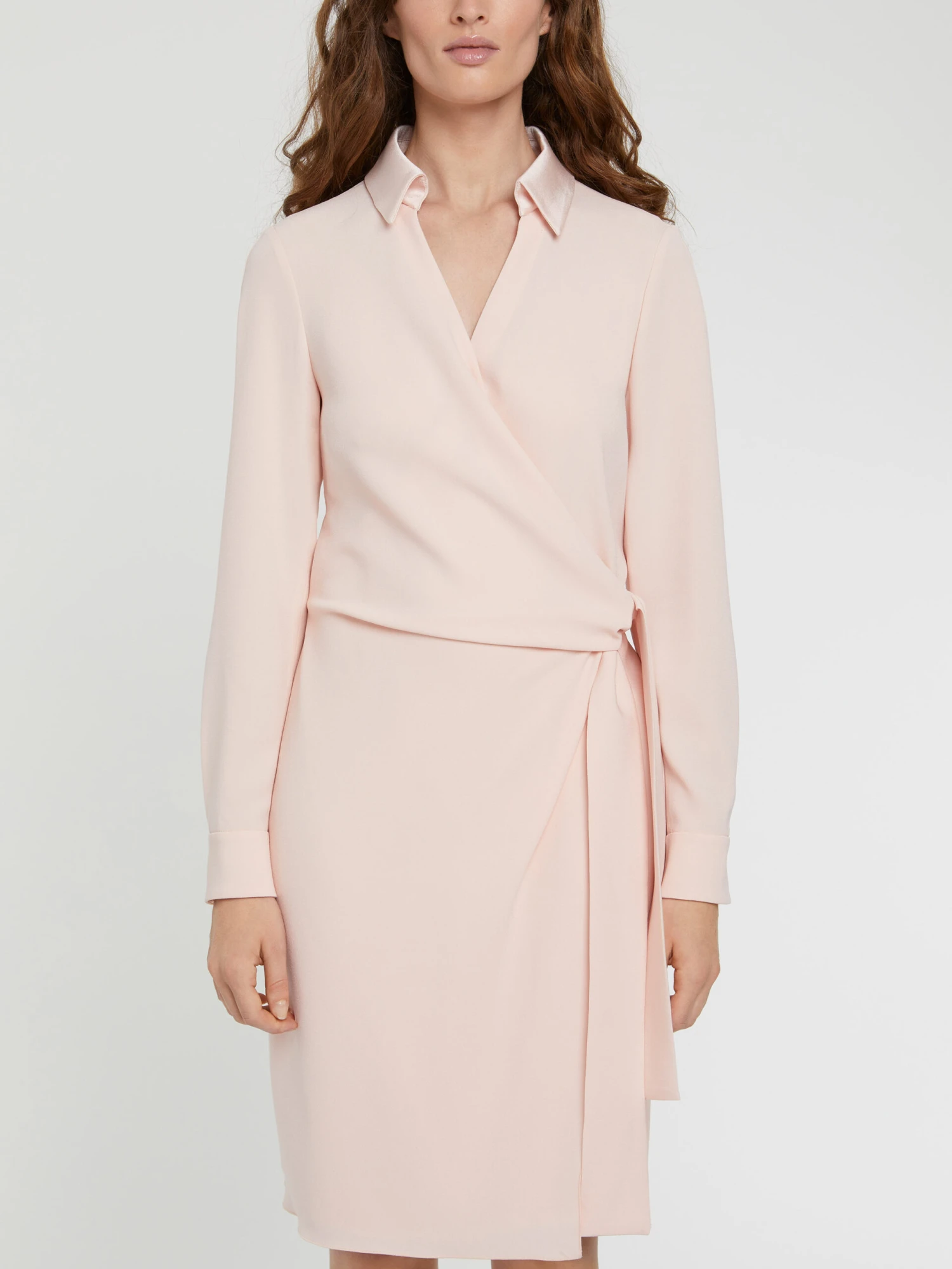La très féminine robe portefeuille est confectionnée en crêpe envers satin. Le tissu mat sur l’ensemble du modèle dévoile son côté brillant au niveau du col chemise. Une touche subtile qui apporte une note chic au vêtement. Un décolleté V, des manches longues et une ceinture ruban nouée sur les hanches structurent la robe. La longueur à partir de la taille est de 60 cm.