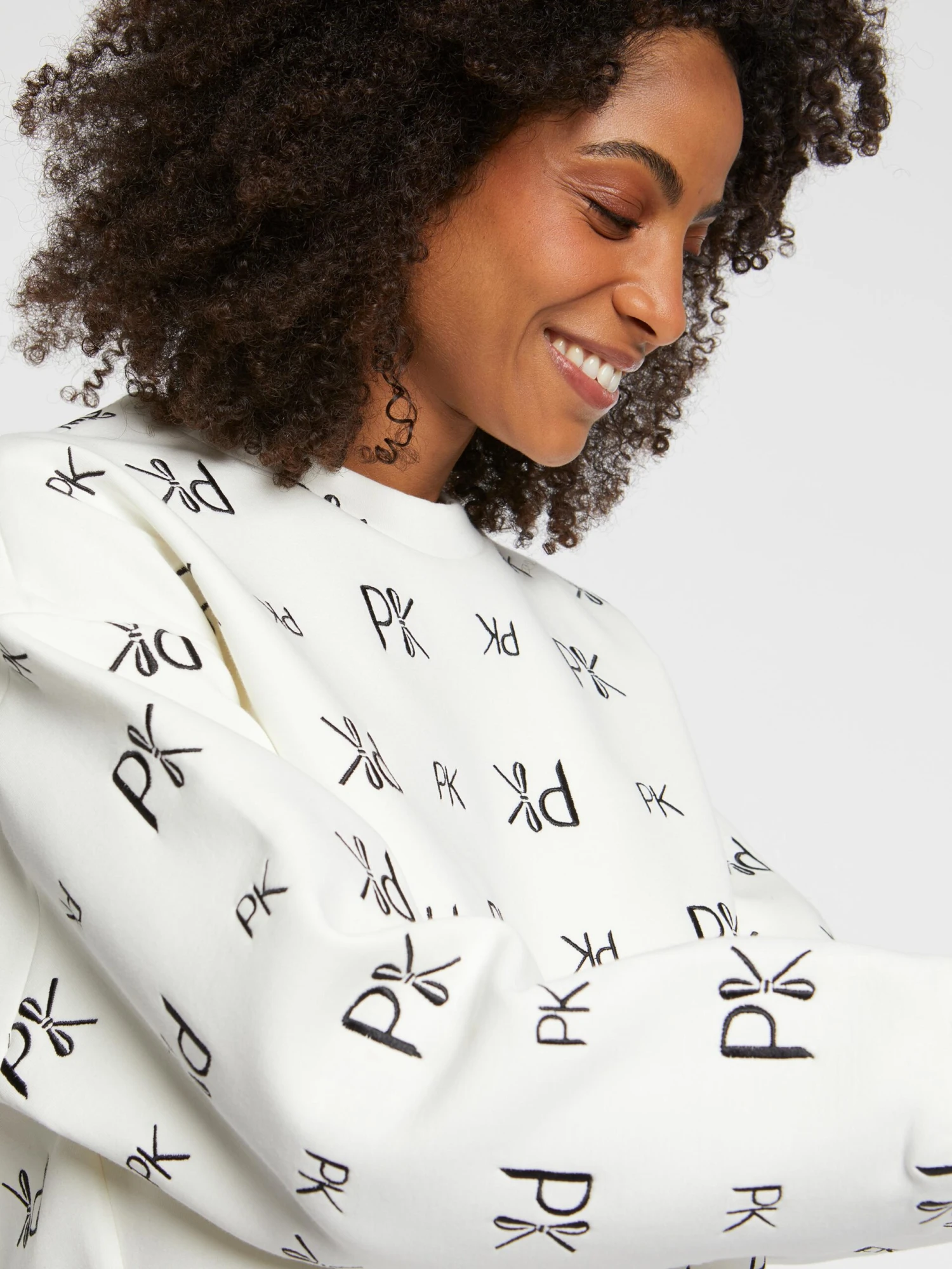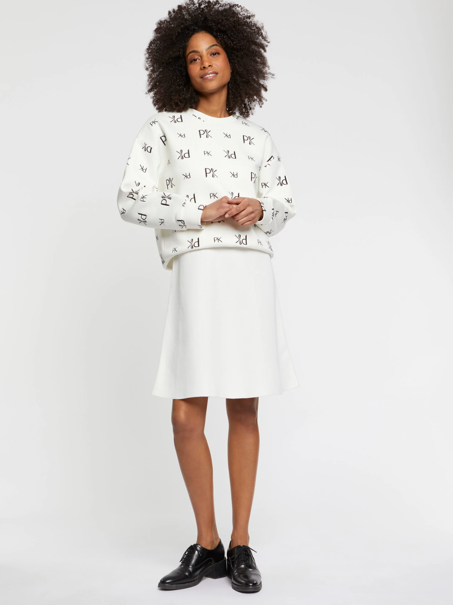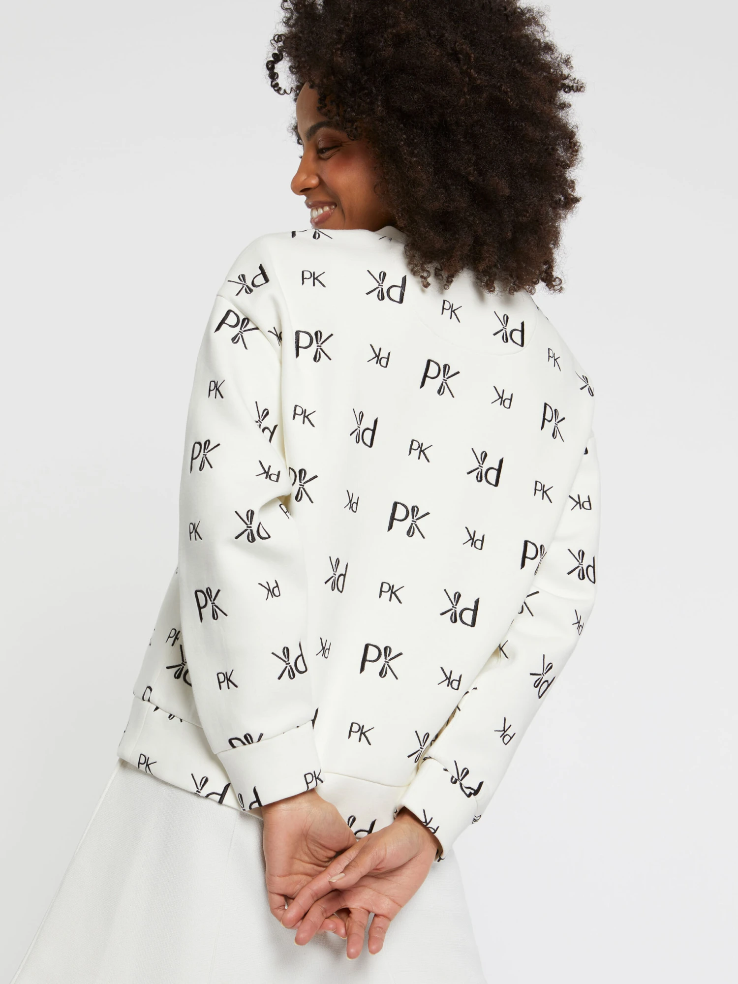 Le sweat-shirt est confectionné en maille néoprène. Cette maille moderne est réalisée en double jersey stretch et offre une texture technique sophistiquée. Le modèle bicolore est brodé des initiales de la marque, où le K se transforme en un ravissant nœud signature.