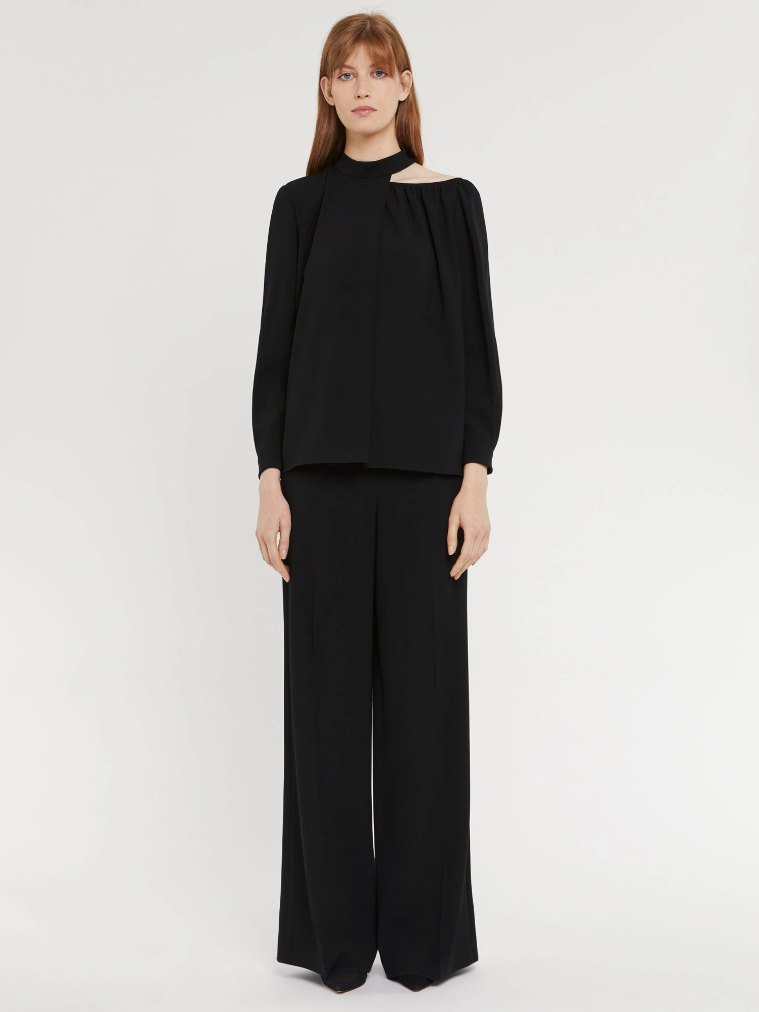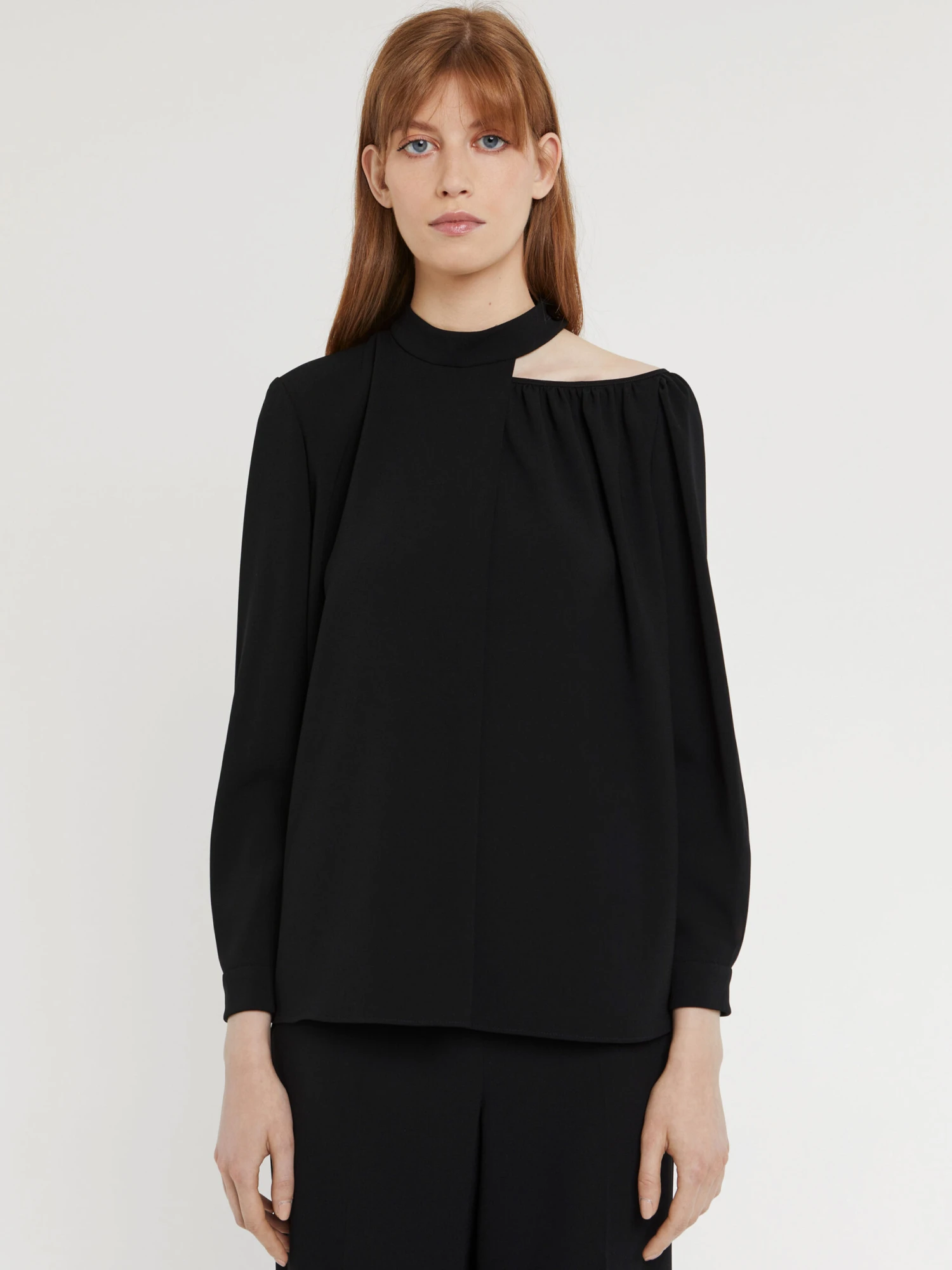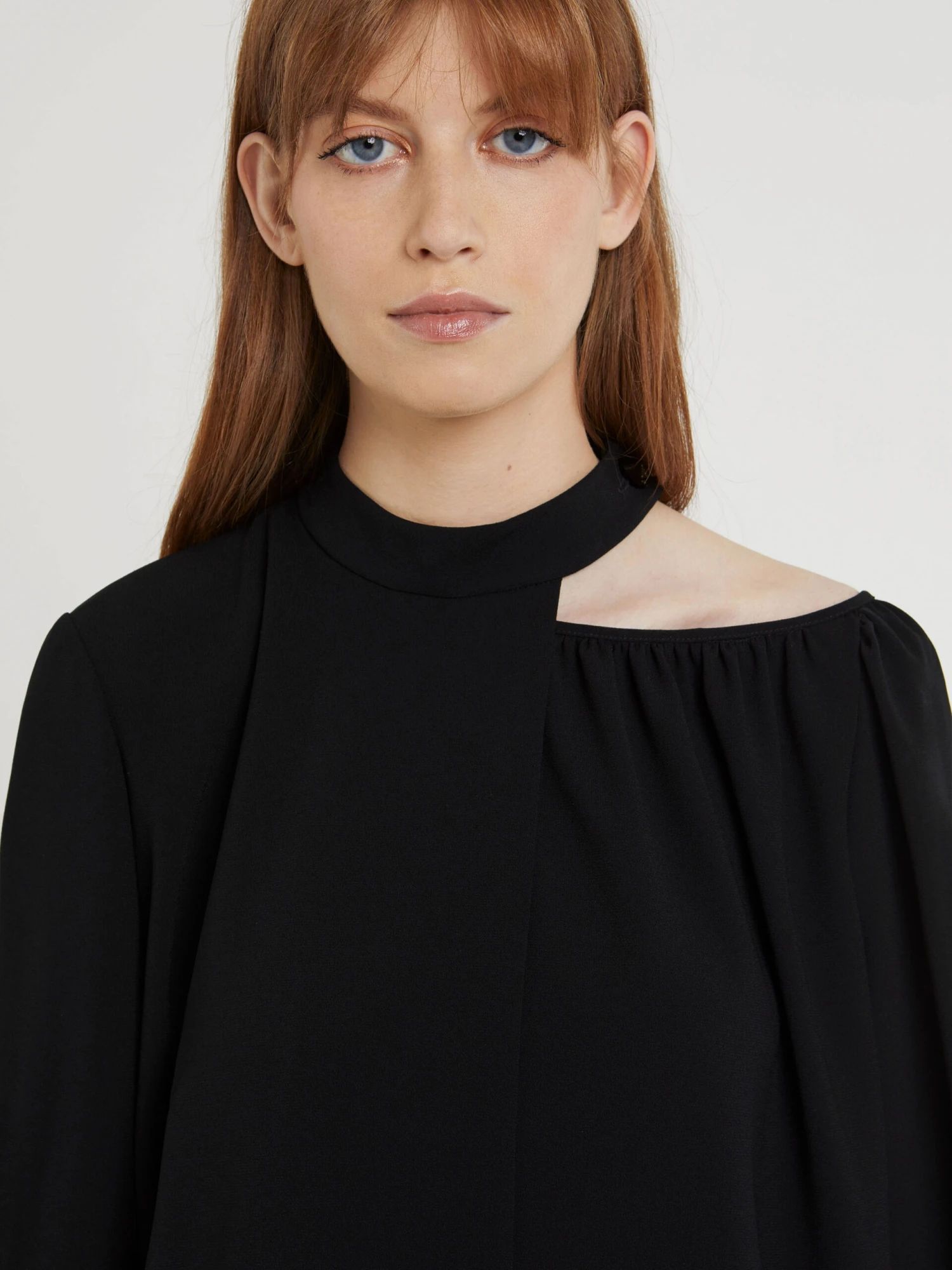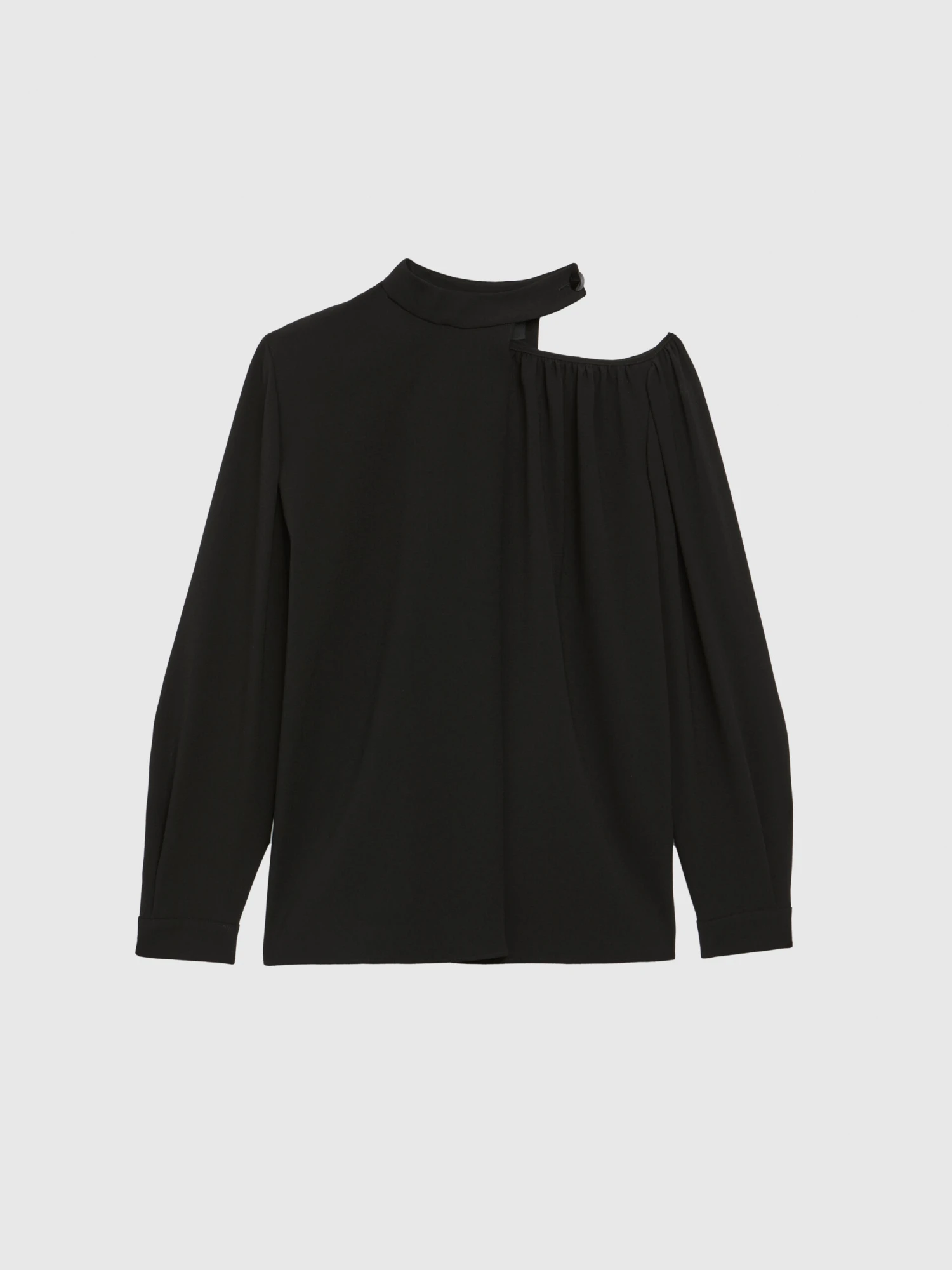 Le top fluide en crêpe envers satin se pare d?un col arrondi et de manches longues fermées par un bouton bijou. Sous l’encolure, une découpe graphique révèle la peau de votre épaule. Un détail sensuel et délicat qui sophistique la silhouette.