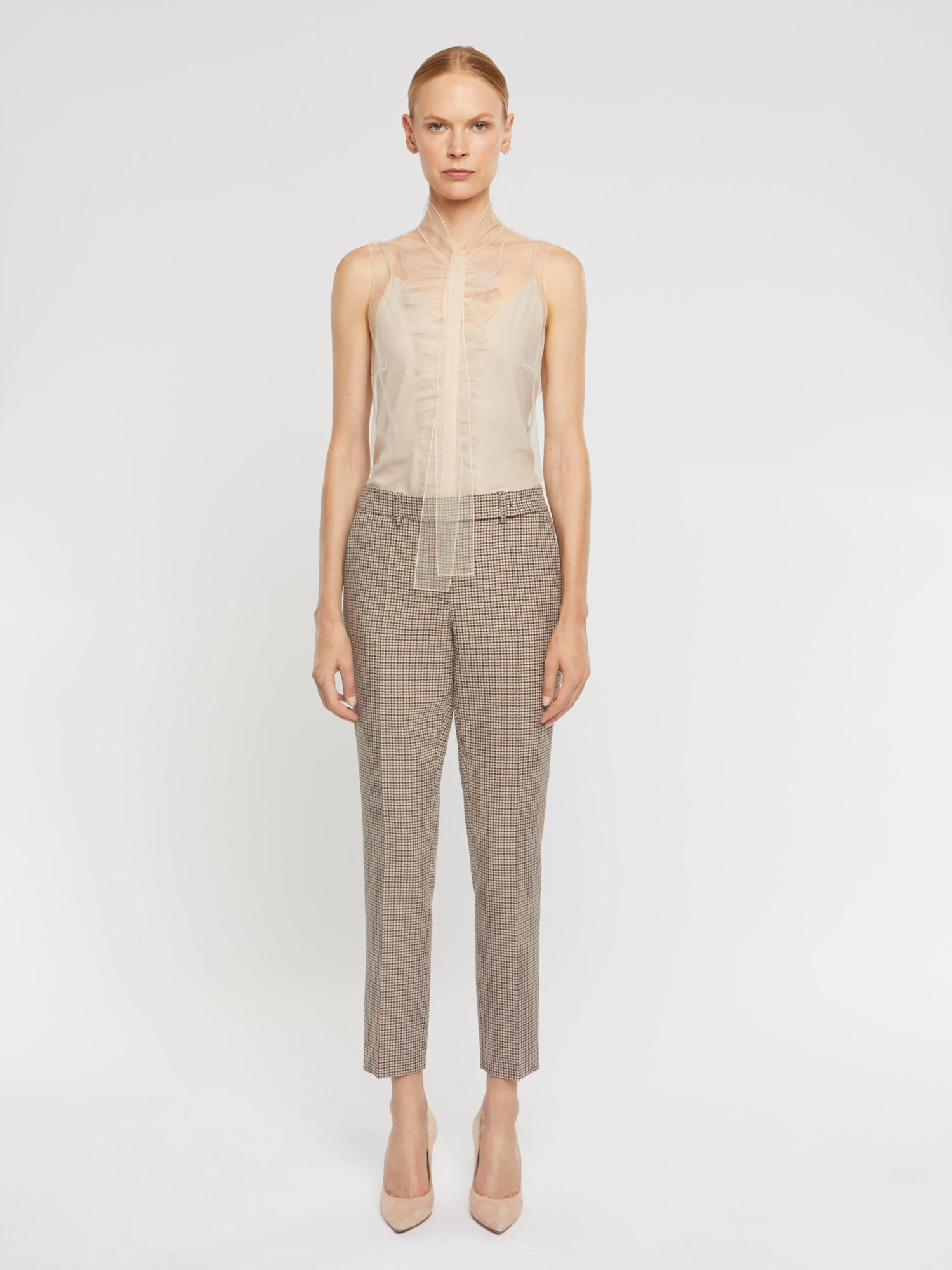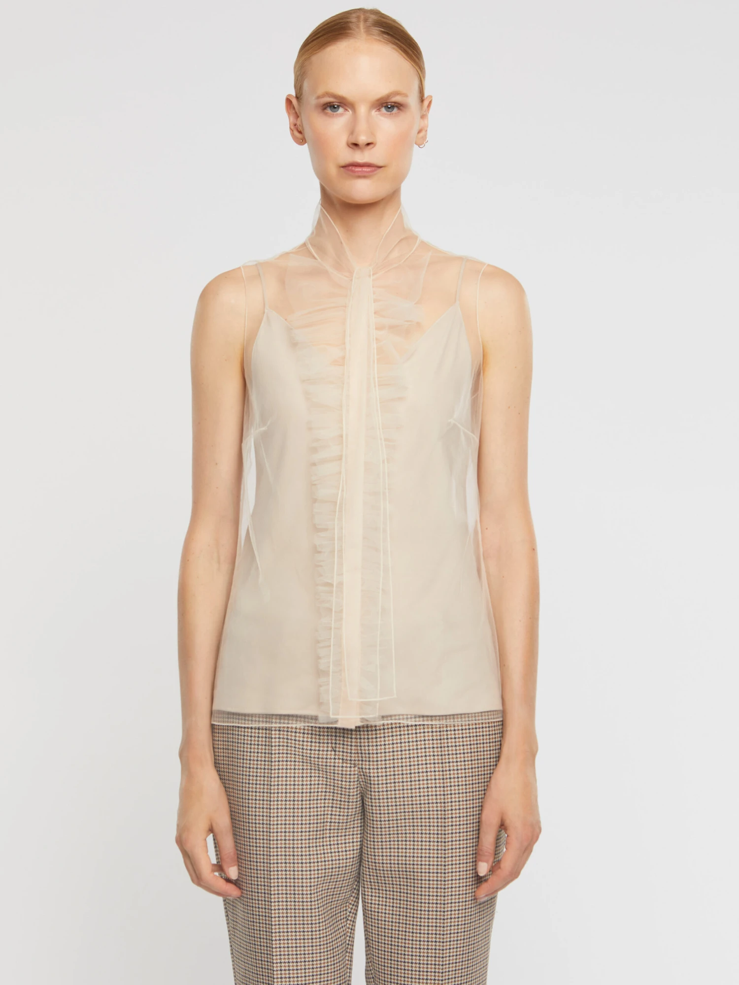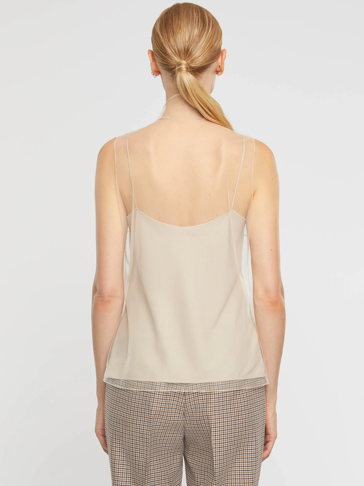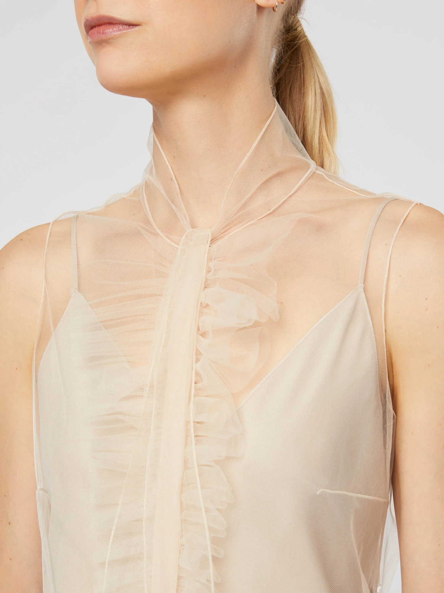Top en tulle fin, col mandarin, sans manche, boutonnière apparente, nœud au niveau du col, Patte devant en organza 100% en soie, caraco amovible en satin stretch coté mat 98% polyester 2% elasthanne