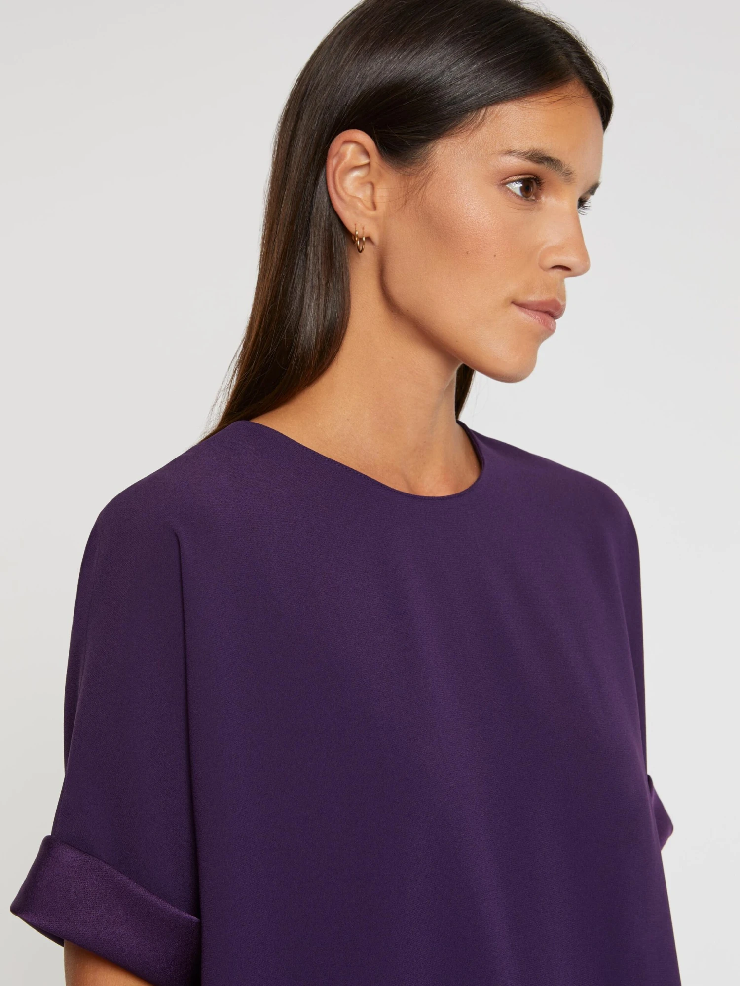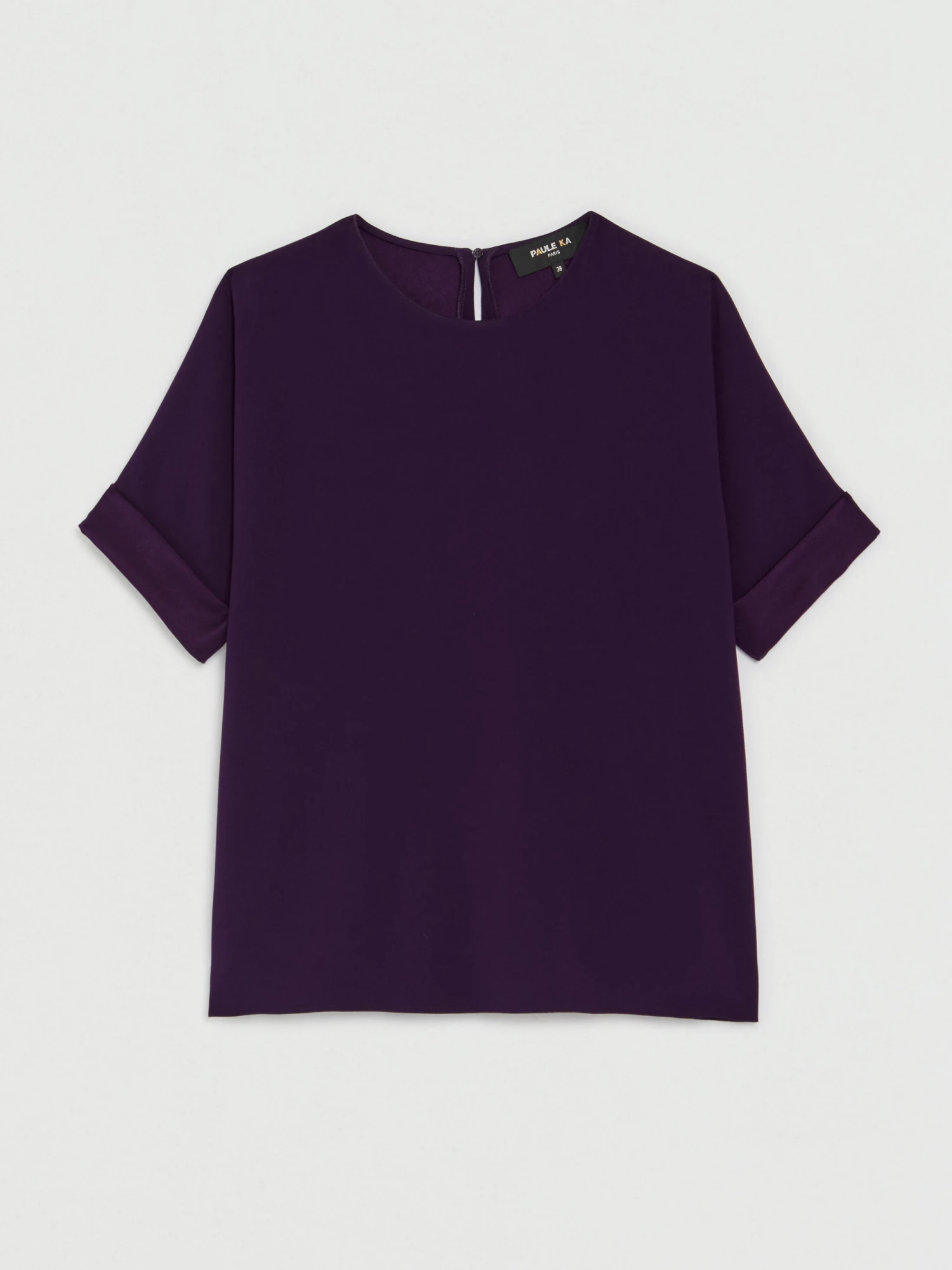 Le top à manches courtes et col rond prend forme dans une coupe fluide, confortable et floue. Confectionné en crêpe envers satin, le fini mat est dynamisé par des revers de manches naturellement satinés et brillants. Une touche raffinée qui sublime ce haut féminin facile à porter au quotidien. Fermeture goutte dans la nuque.