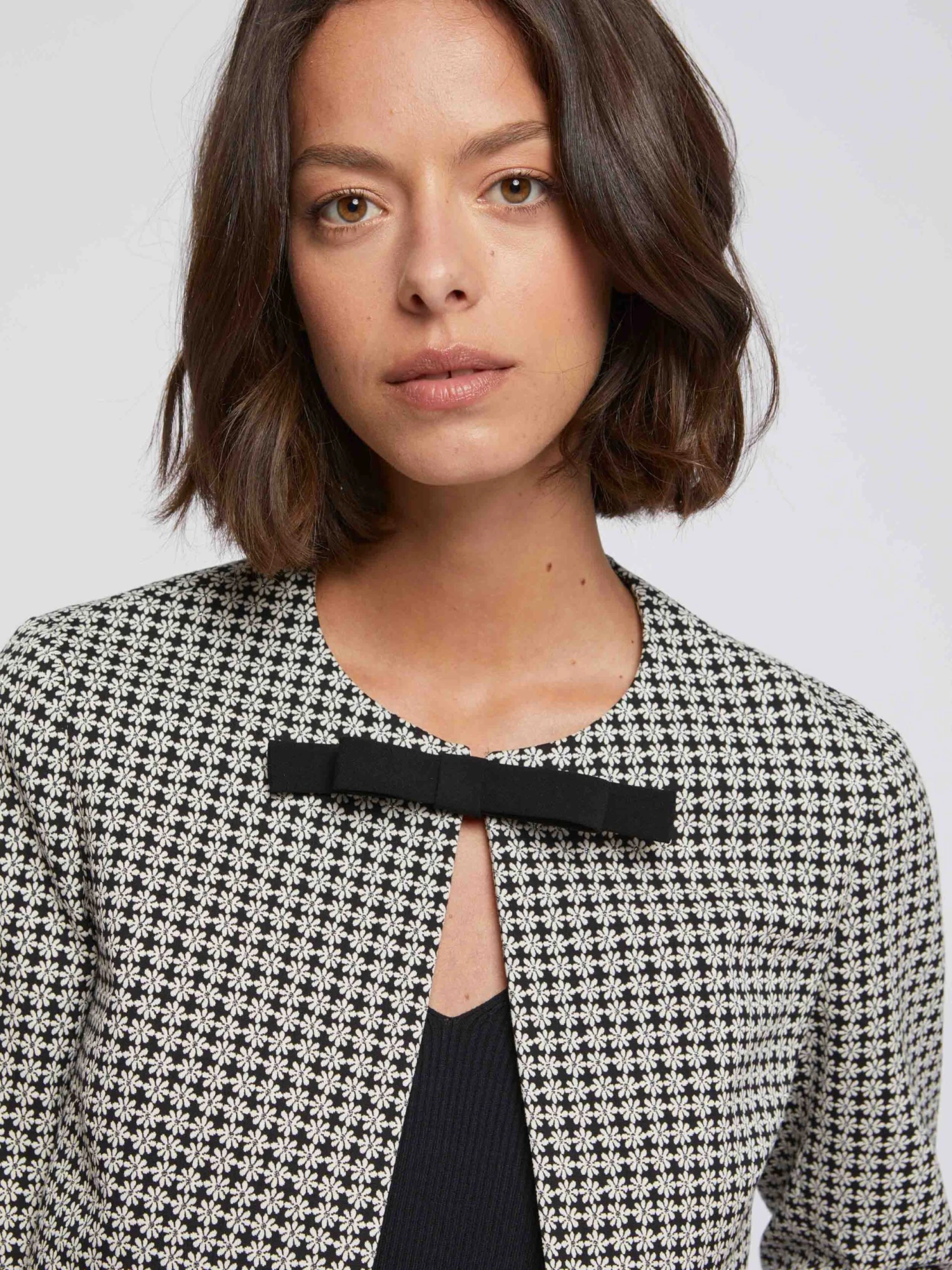 La veste boléro en coton stretch s’arrête juste en-dessous de la poitrine. La coupe ouverte est dotée d’un nœud de fermeture sous le col rond qui laisse la veste s’entrouvrir. Côté silhouette, le jacquard noir et blanc à petites pâquerettes rehaussé de lurex souffle une aura BCBG.