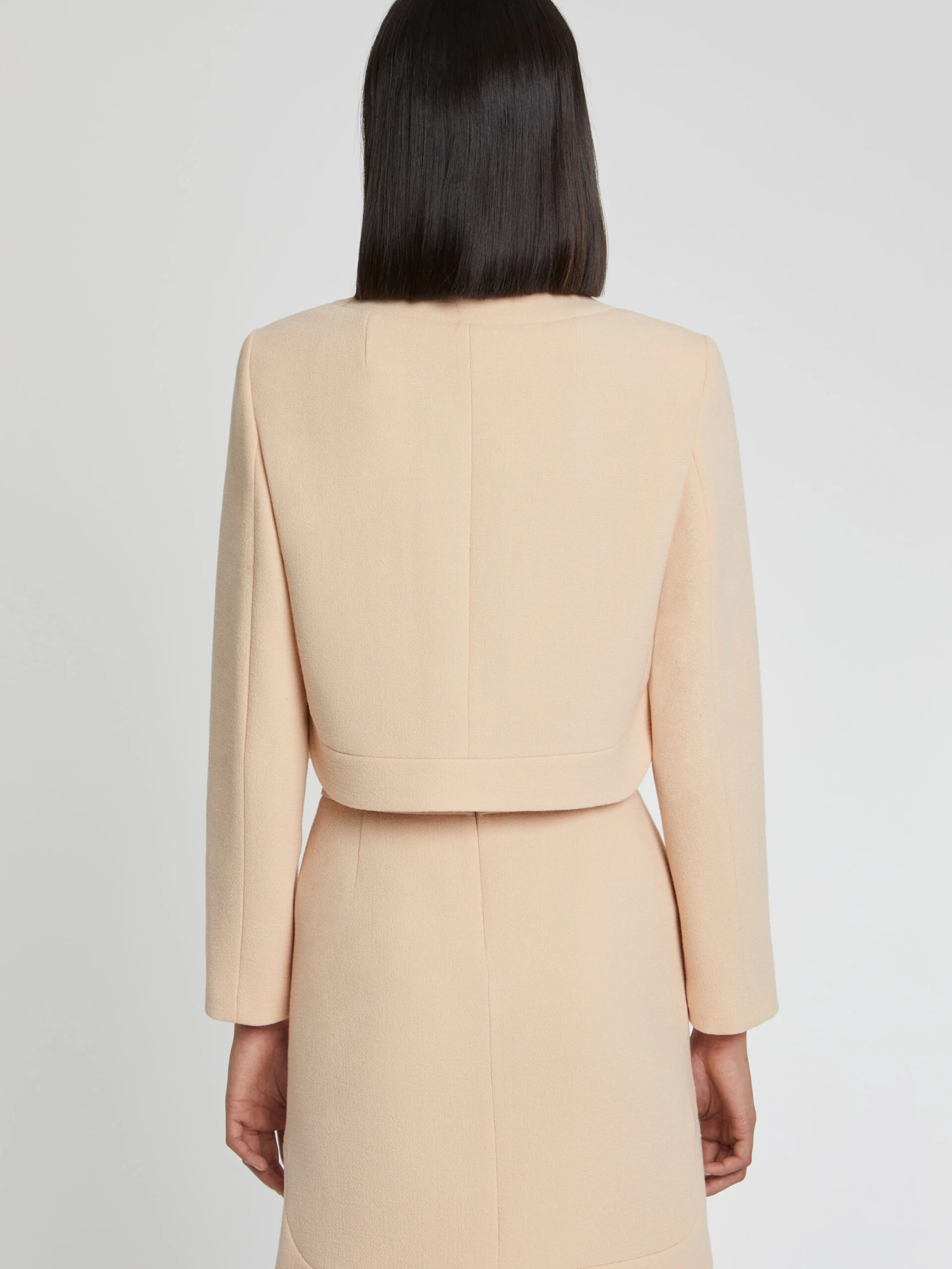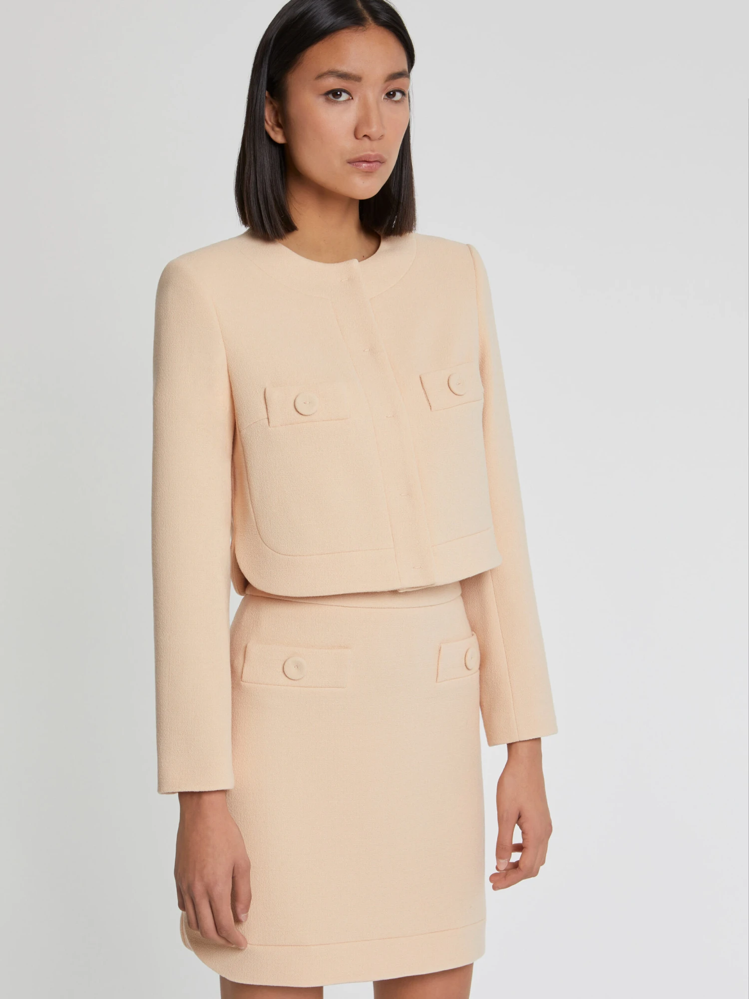 La veste boléro en laine vierge est structurée par une coupe courte élémentaire à encolure ronde et boutonnage invisible. De part et d’autre du vêtement, deux fausses poches poitrine ornées d’un bouton recouvert viennent souffler un vent sixties sue la silhouette. Le chic version nouveau rétro.