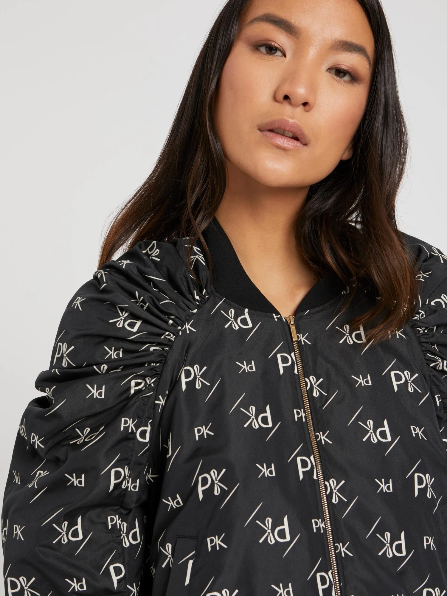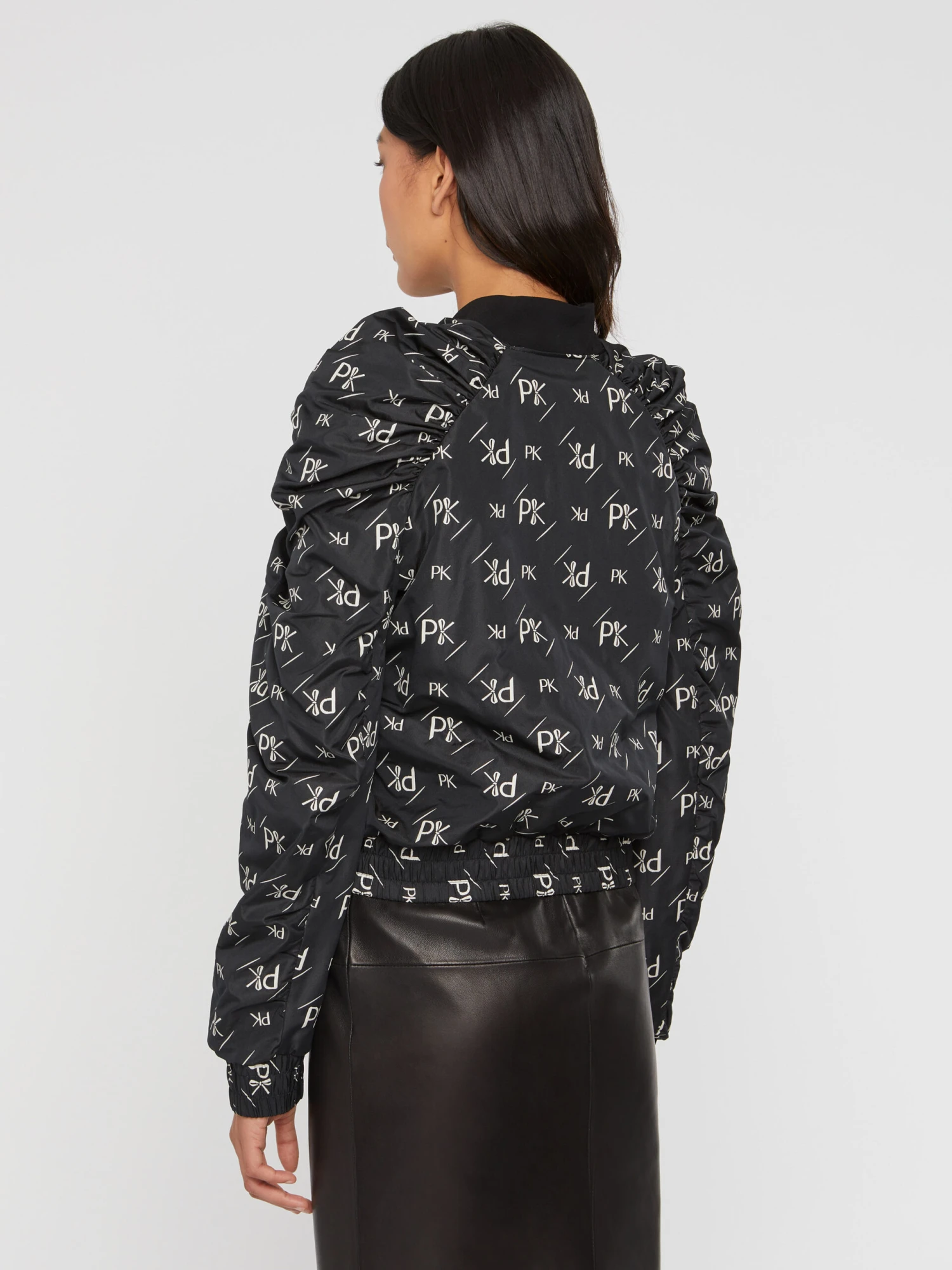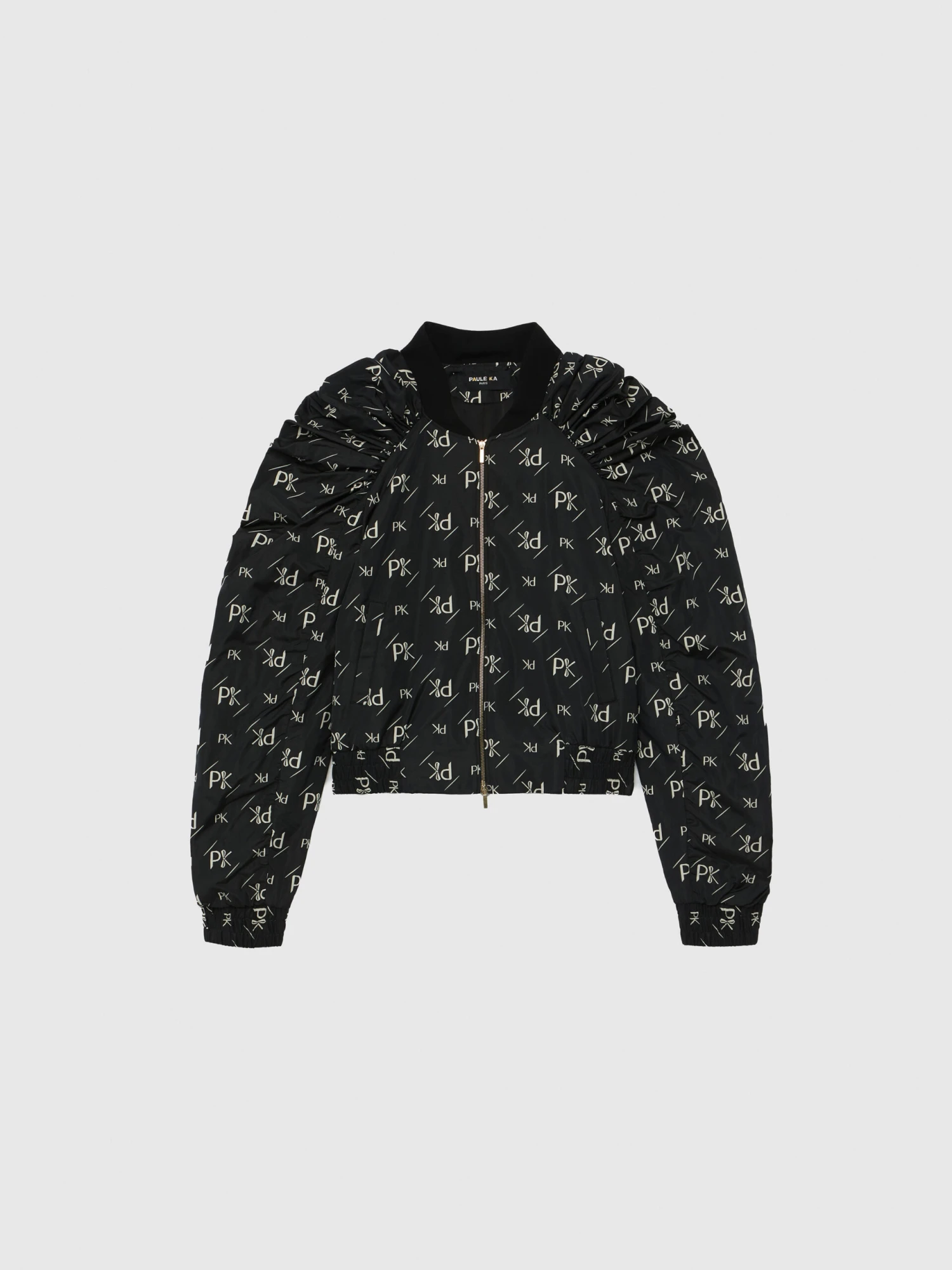La veste mi-saison prend forme dans une coupe blouson. Elle est fermée par un zip, structurée par des bords-côtes élastiqués, dotée d?un col teddy en crêpe envers satin mat et se blouse sur les hanches. Inédit avec ses manches froncées et son motif monogrammé en jacquard, le modèle signature se portera idéalement dans une version sportchic.